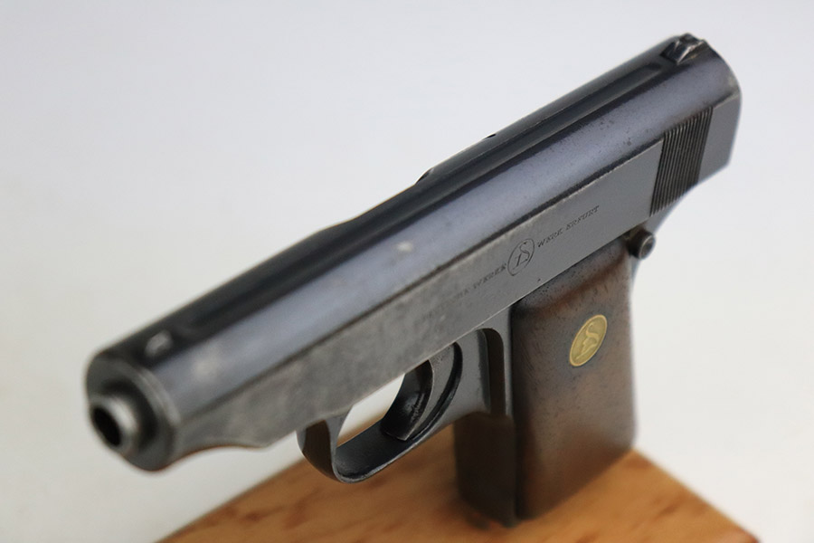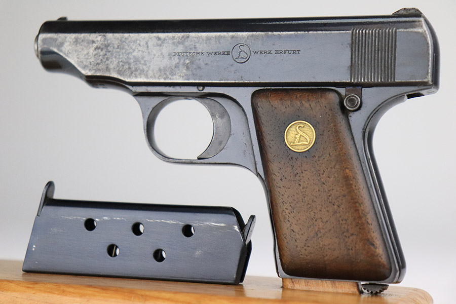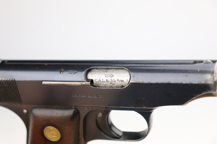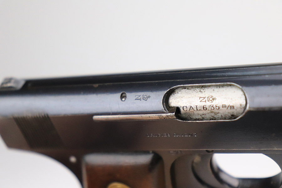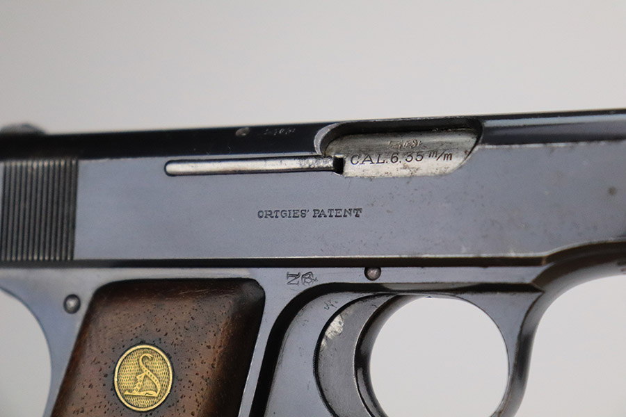 11/8/22 – This is a nice example of an Erfurt Ortgies Pocket Pistol manufactured in the 1910’s and chambered in 6.35mm. This one is all matching, has the proper “Crown N” proofs, and has a “Germany” export marking on the underside of the frame, indicating it was intended for sale in the international commercial market. It has retained roughly 80% of its original finish with an area of obvious wear and spotty oxidation at the front left of the slide. Comes with very nice period-correct wood grips and a blued magazine. The bore has strong rifling with some minor fouling in the grooves.