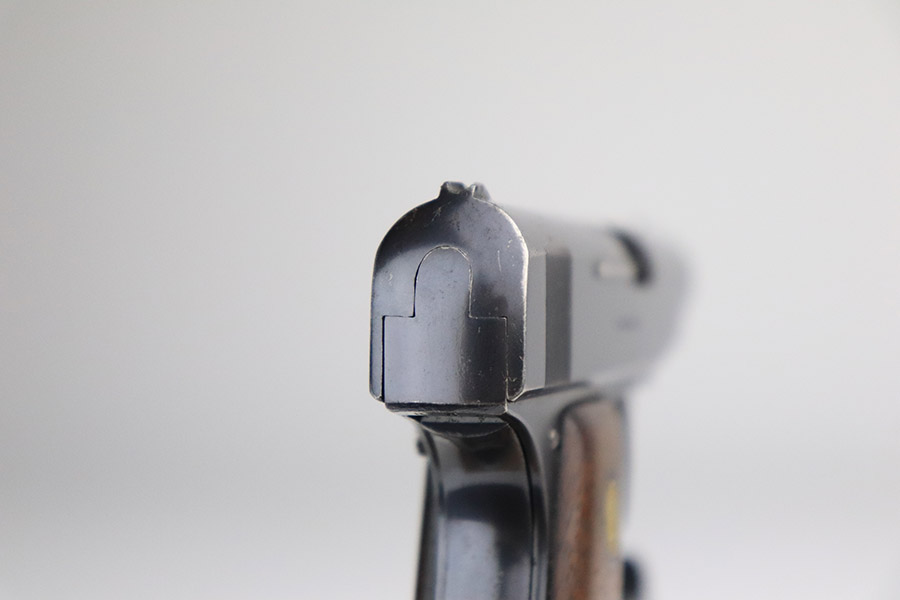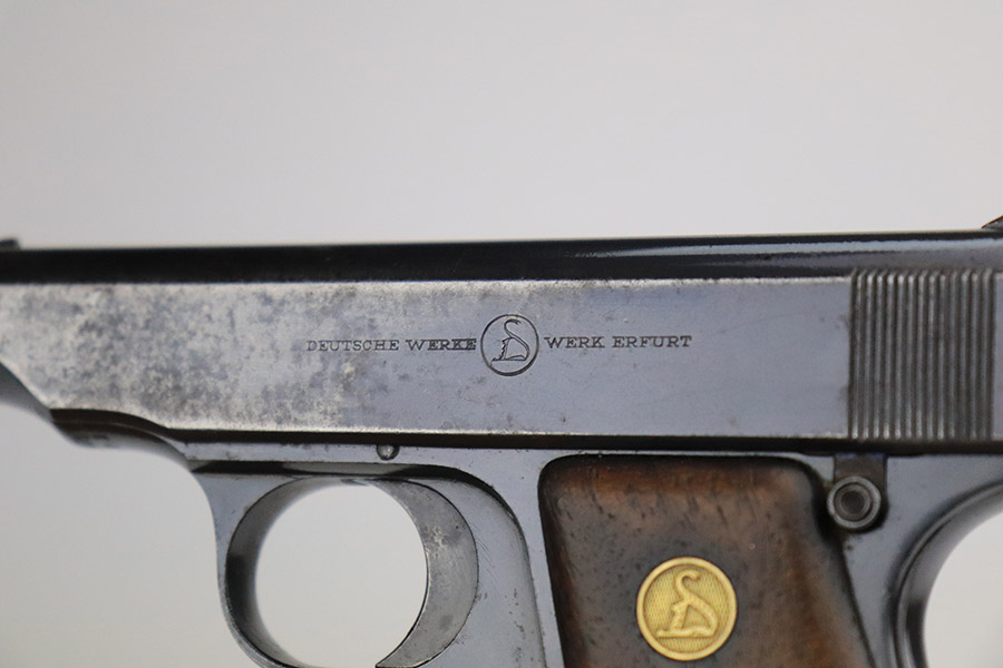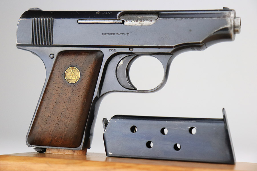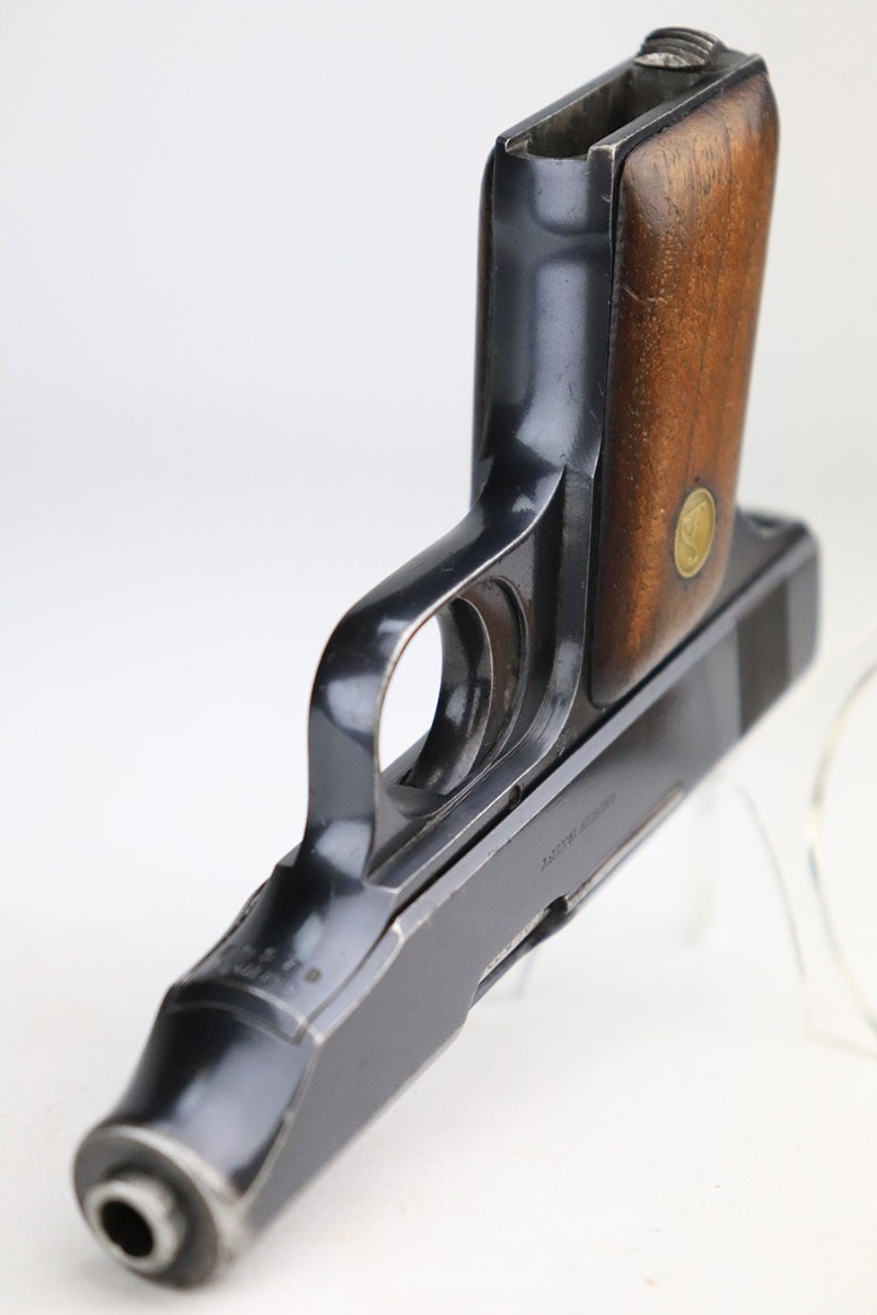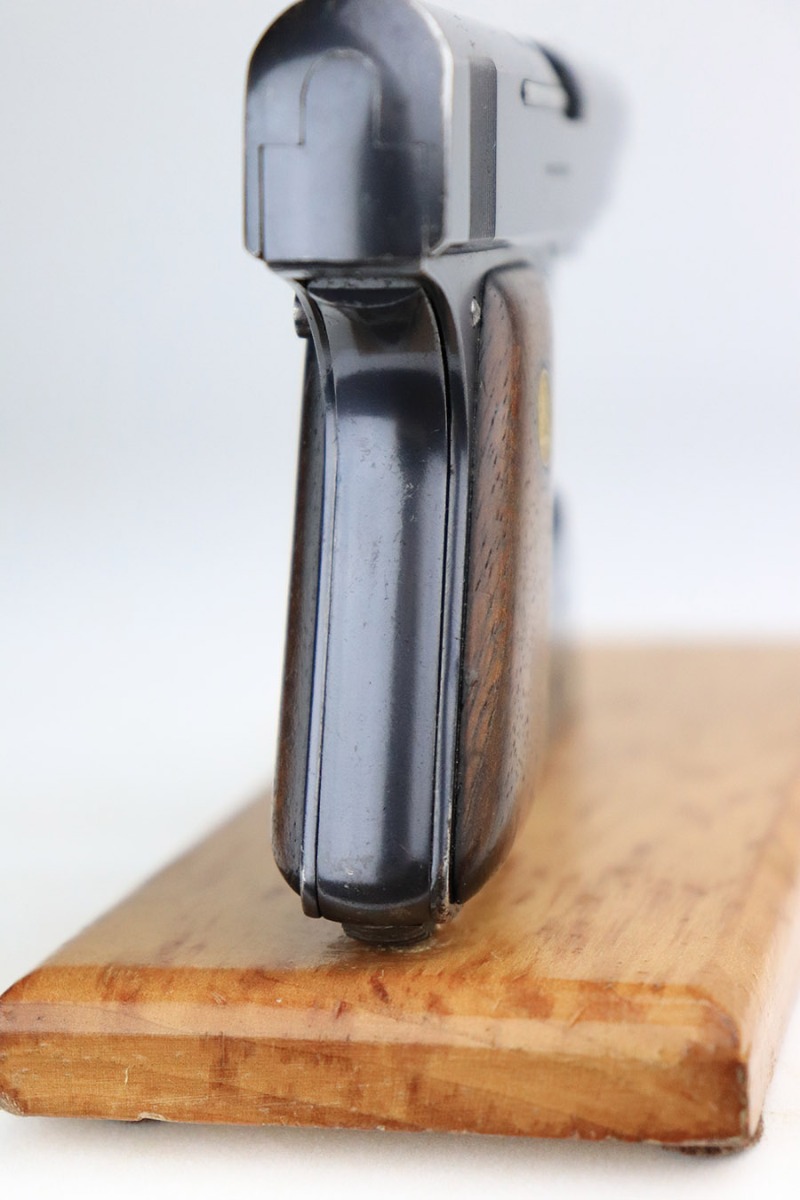 11/8/22 – This is a nice example of an Erfurt Ortgies Pocket Pistol manufactured in the 1910’s and chambered in 6.35mm. This one is all matching, has the proper “Crown N” proofs, and has a “Germany” export marking on the underside of the frame, indicating it was intended for sale in the international commercial market. It has retained roughly 80% of its original finish with an area of obvious wear and spotty oxidation at the front left of the slide. Comes with very nice period-correct wood grips and a blued magazine. The bore has strong rifling with some minor fouling in the grooves.
