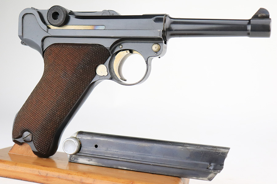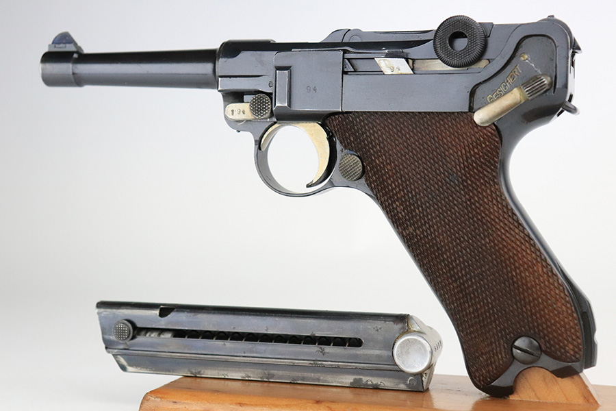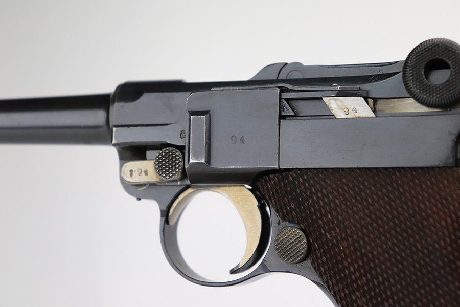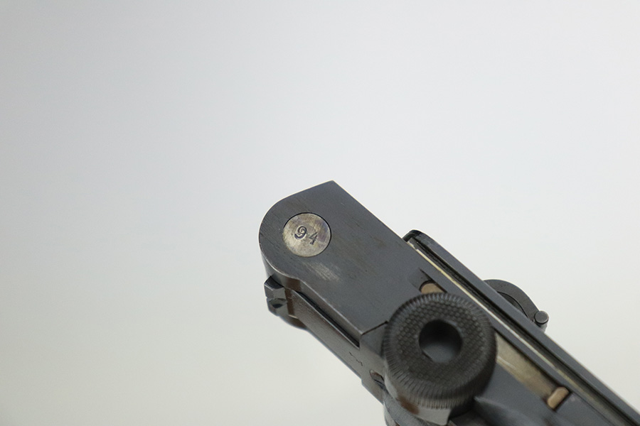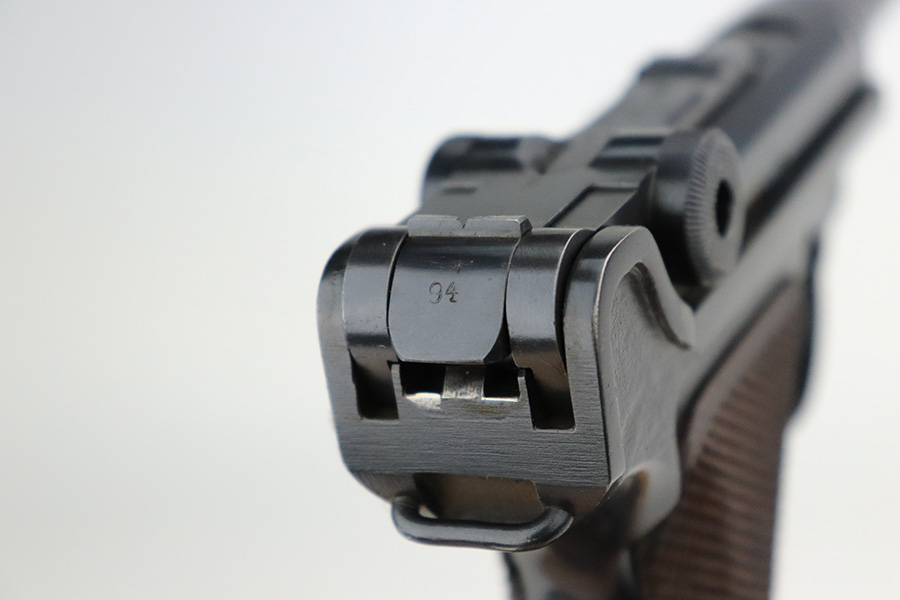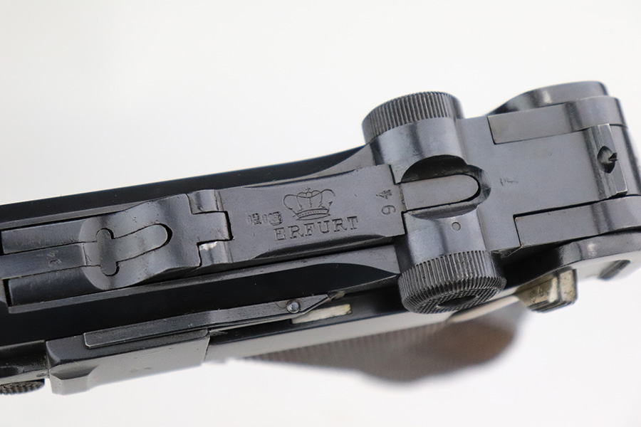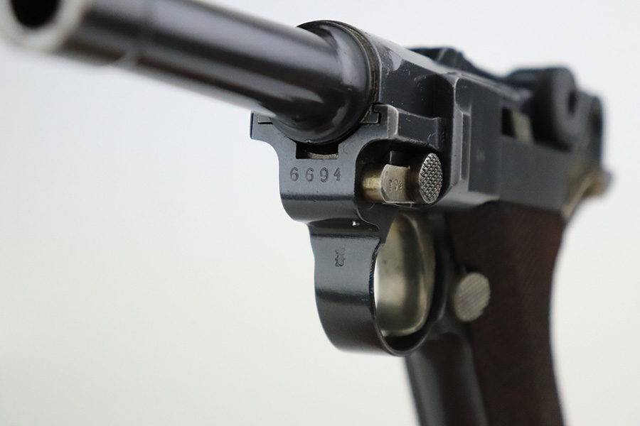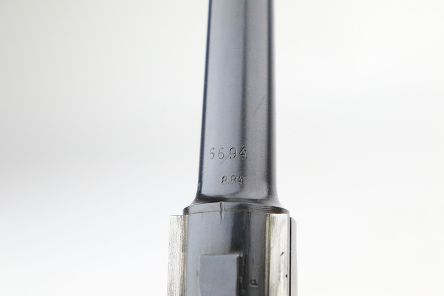 7/28/22 – This is an excellent example of an Erfurt Luger. All parts are matching. It lacks Imperial military proofs, so it was not issued to the Imperial German military during WW1. There is no chamber date, it has an added police sear safety, and there is a Nazi-era “Eagle HZA” military depot marking on the sear bar. So presumably, this gun was issued to the Nazi-era German police force, put together from WW1-era parts. The entire gun has been restored and refinished – may have been done at an arsenal. The bluing is very nice with just hints of wear on some of the high edges. Comes with minty wood grips – the left panel is marked “S/42” (Nazi-era armorer’s replacement proof), and the right panel has a police “Star K” marking. It also comes with a mismatched Nazi military magazine. The bore has good rifling with very minor frosting throughout.