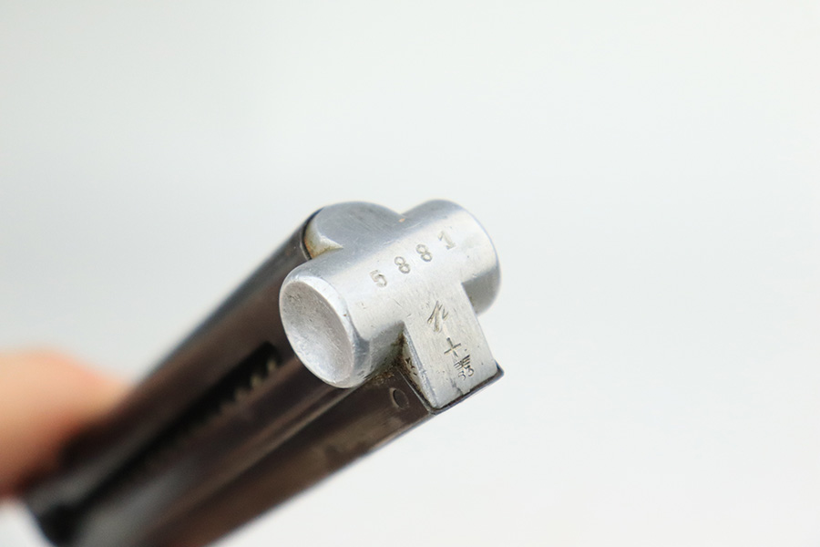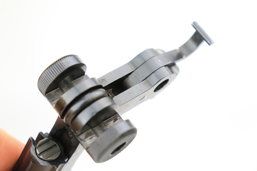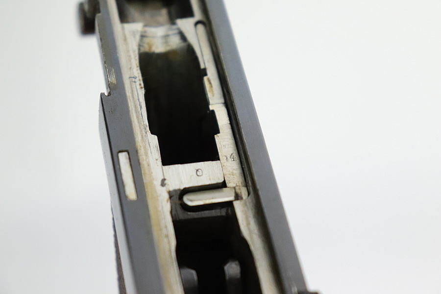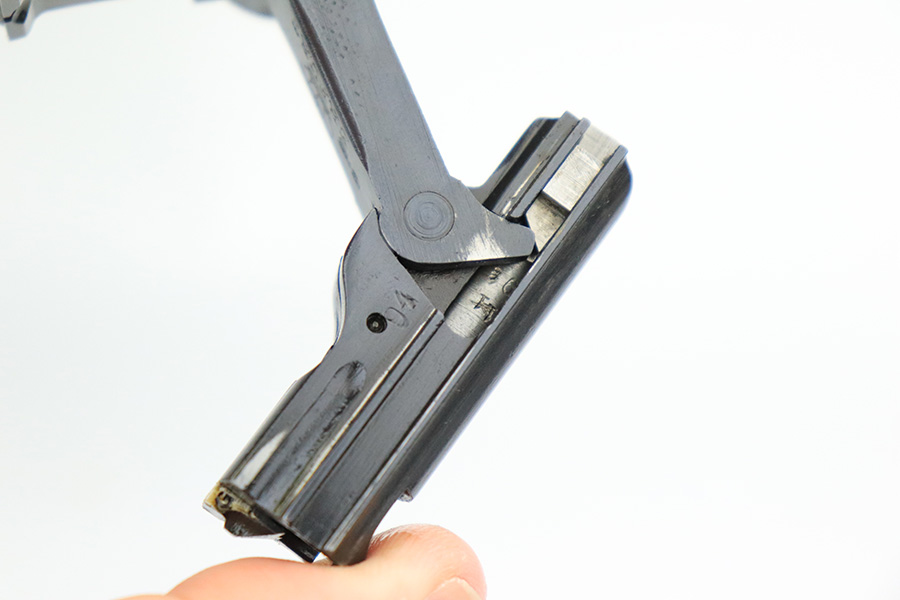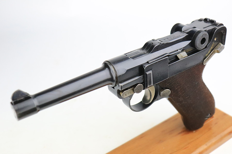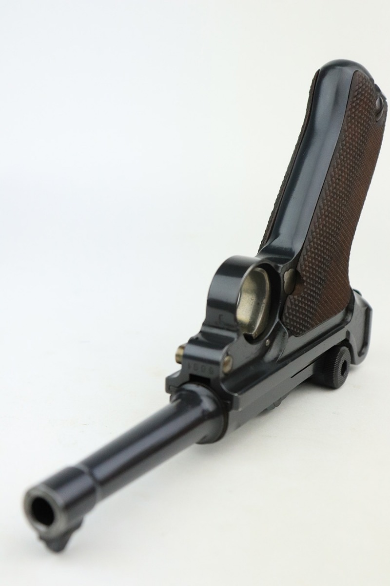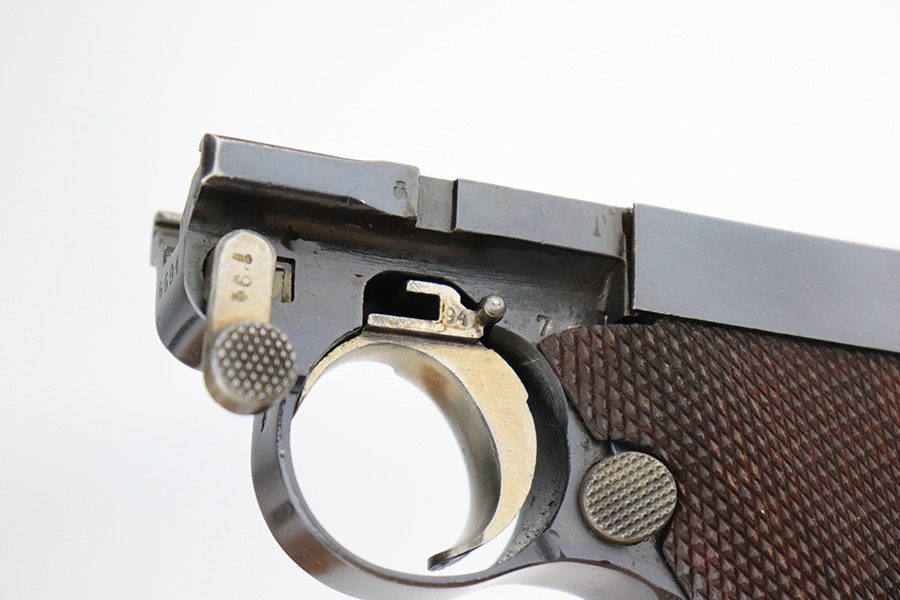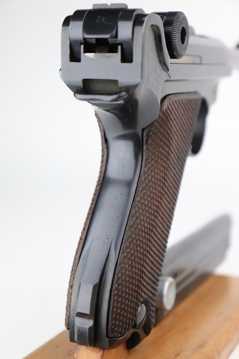 7/28/22 – This is an excellent example of an Erfurt Luger. All parts are matching. It lacks Imperial military proofs, so it was not issued to the Imperial German military during WW1. There is no chamber date, it has an added police sear safety, and there is a Nazi-era “Eagle HZA” military depot marking on the sear bar. So presumably, this gun was issued to the Nazi-era German police force, put together from WW1-era parts. The entire gun has been restored and refinished – may have been done at an arsenal. The bluing is very nice with just hints of wear on some of the high edges. Comes with minty wood grips – the left panel is marked “S/42” (Nazi-era armorer’s replacement proof), and the right panel has a police “Star K” marking. It also comes with a mismatched Nazi military magazine. The bore has good rifling with very minor frosting throughout.