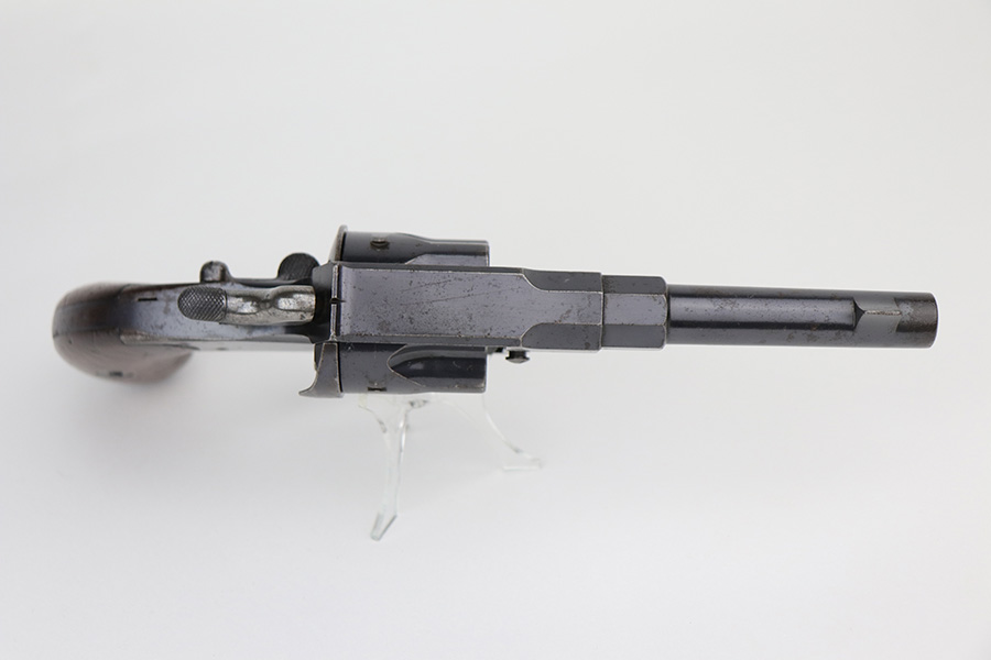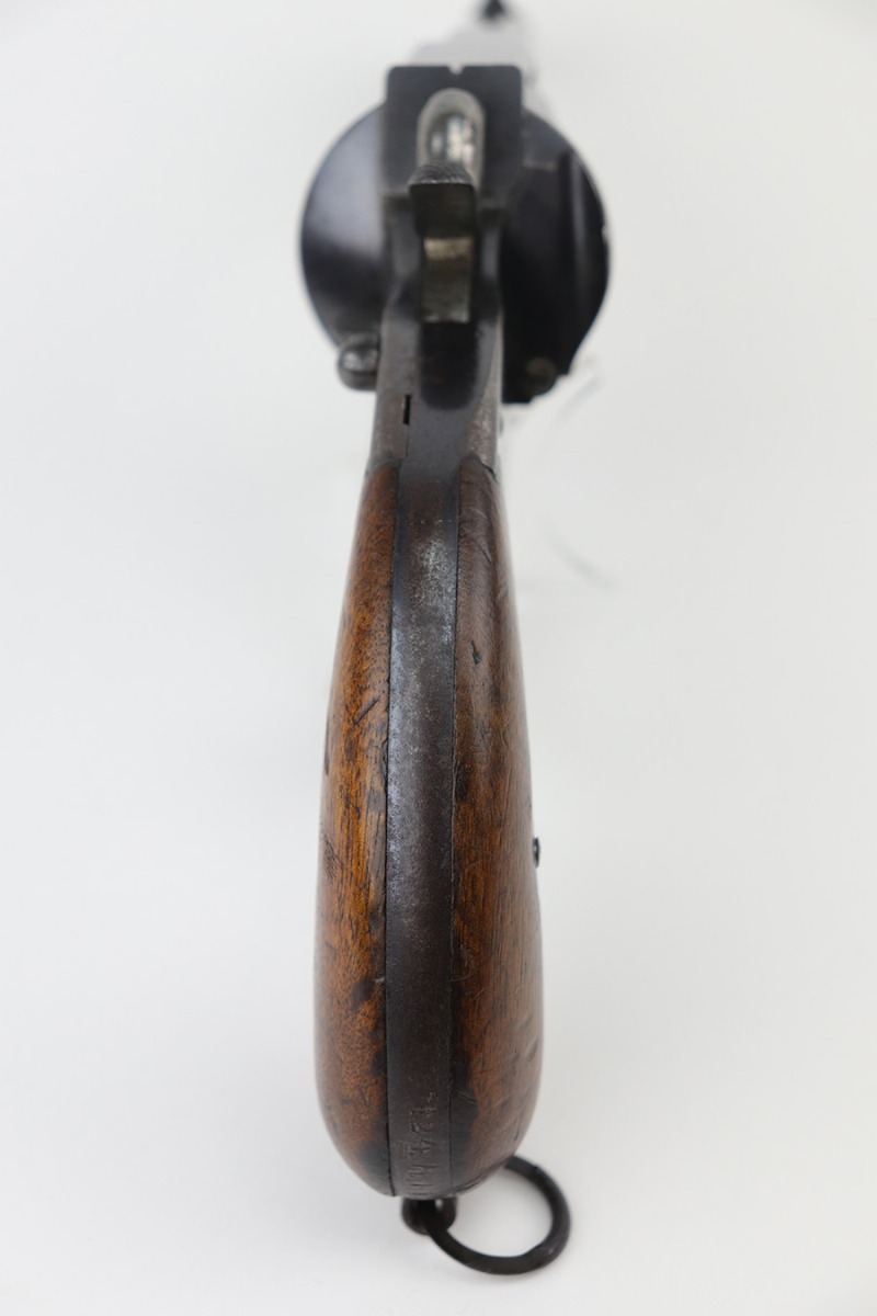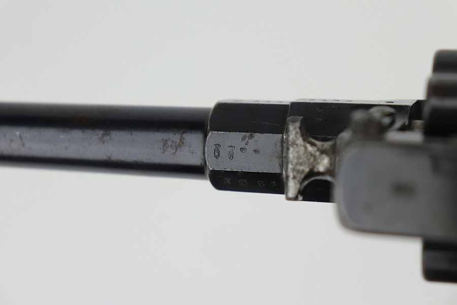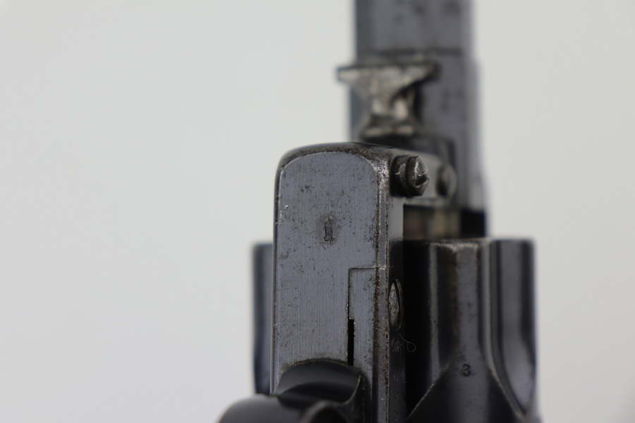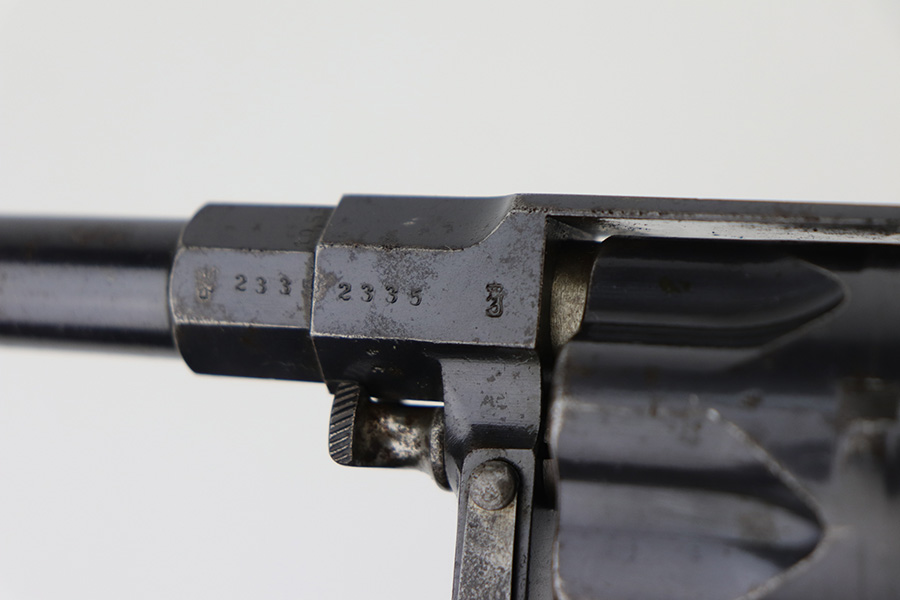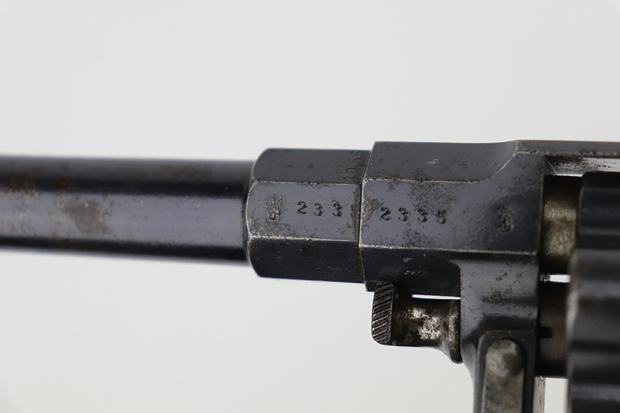 9/3/21 – This is a scarce Erfurt M1883 Reichsrevolver in all matching and original condition. All numbered parts of this revolver match, including frame, cylinder latch, barrel, cylinder, grips and even the grip screw! The finish rates at about 75-80%, and there are several patches of freckling and minor pitting. The frame is marked “124.R.1.B.R”, which means it went to the 124th infantry. The frame is dated 1896, meaning this antique requires no license. Bore is actually pretty shiny with fairly strong rifling considering the age and condition of the revolver, but there is some freckling. Appears fully functional.