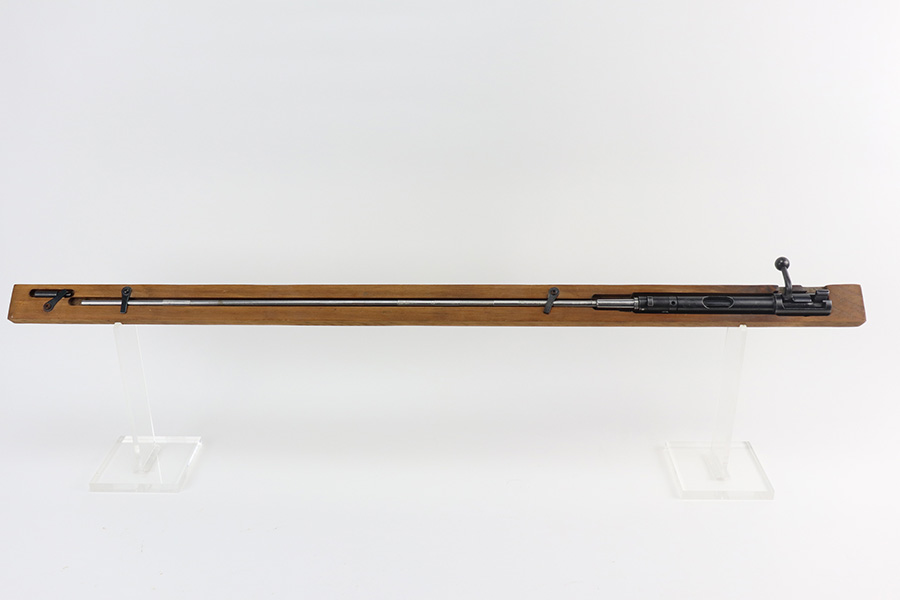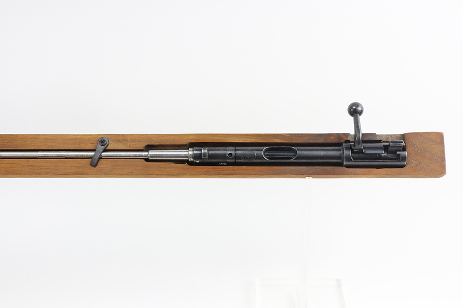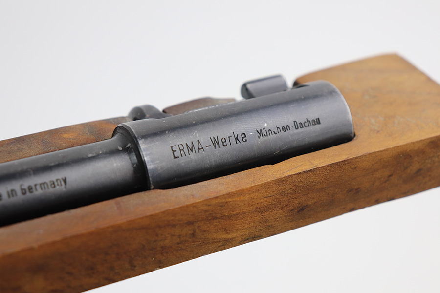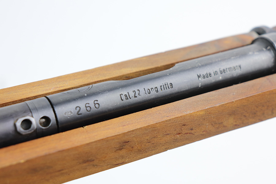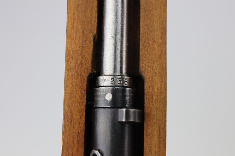 8/20/21 – This is a post WW2 production ERMA conversion kit for a K98 rifle. The kit includes a wood storage block, bolt assembly, barrel, and pin. Used as single-fire for training and practice purposes. The receiver and barrel are matching numbered 266. The blued finish on the bolt assembly and receiver are excellent with only mild finish loss in a few small areas. No rust or pitting. Smooth action and fully functional. The bore has some mild wear but generally is excellent and clean with strong rifling. Made in West Germany.