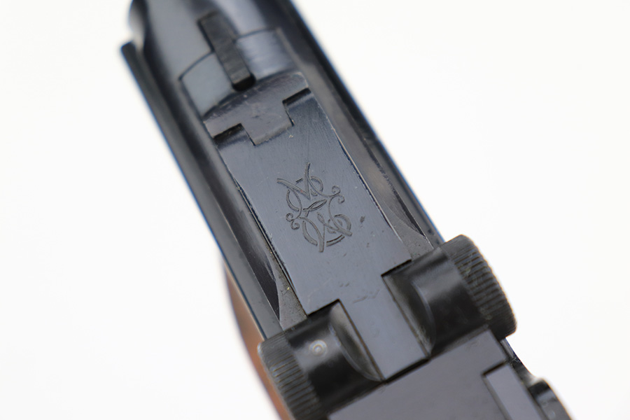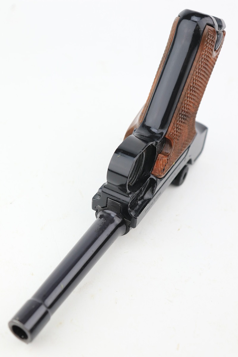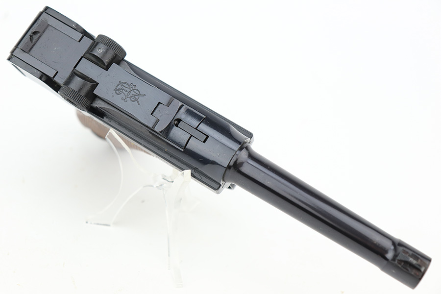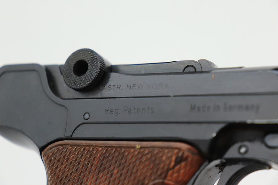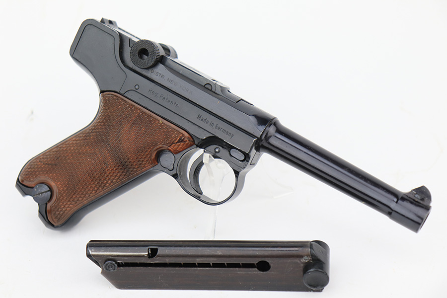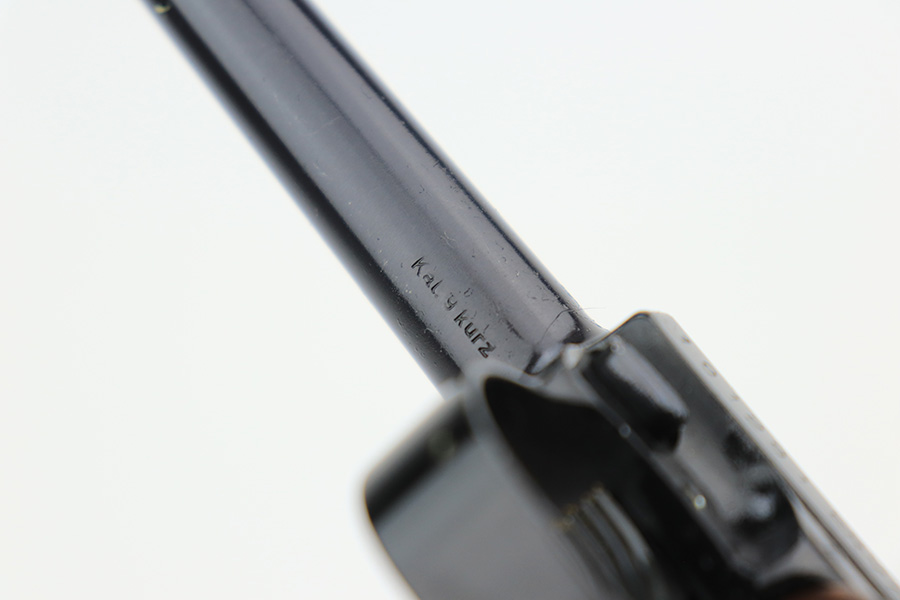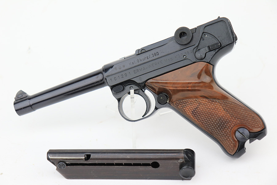 3/27/23 – This is a mint example of an Erma Model KGP 68A “Baby Luger” chambered in 9mm Kurz or .380 ACP. All matching with the proper West German proofs. “Made in Germany” export marking on the right side of the frame. It has retained essentially all of its finish with just a few very tiny handling marks on the grip straps. Excellent marbled brown/black plastic grips. Comes with one magazine. Mint bore.