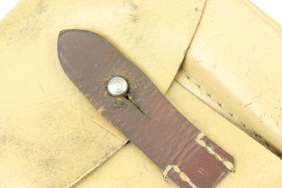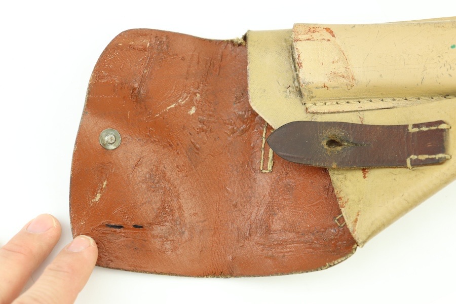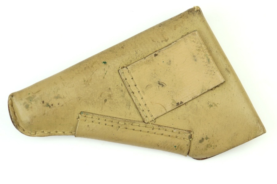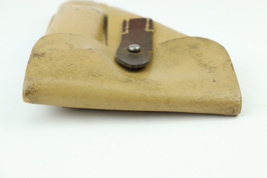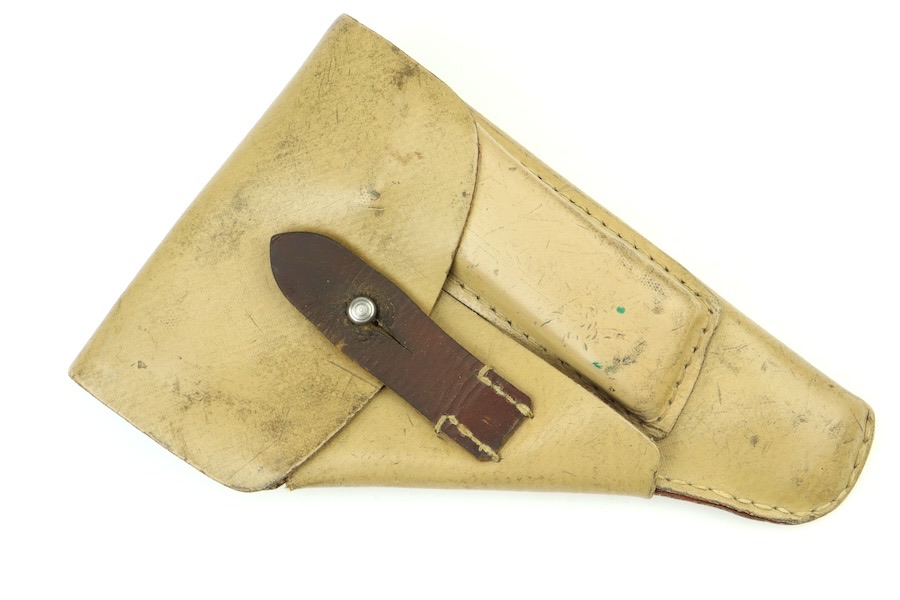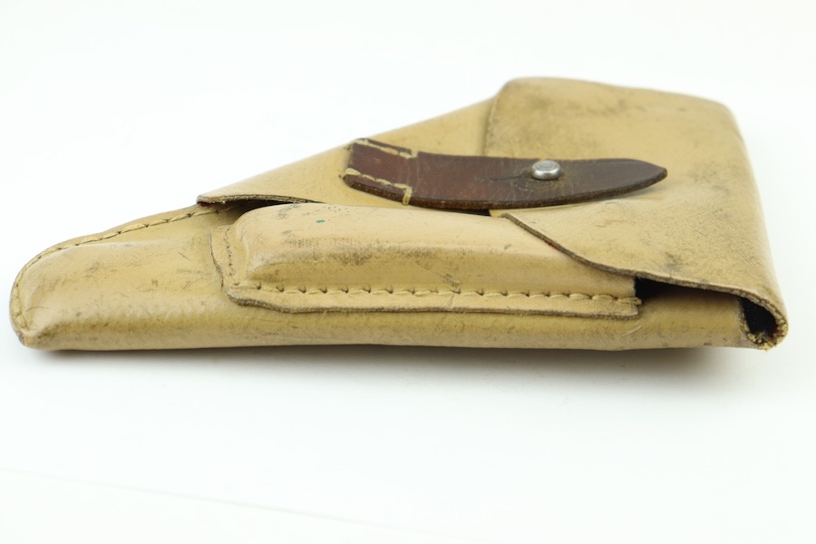 11/30/23 – This is an original and great condition late WW2 production Ersatz holster. Fits a Walther PP or similar-sized 7.65mm Axis pistol. The front part of the holster has light surface scratches near the toe and the magazine pouch, and there is scuffing on the back. The stitching is excellent and all original. Holster has a clean interior. An iconic late-war example.