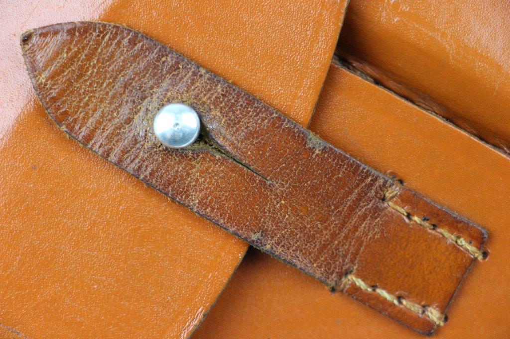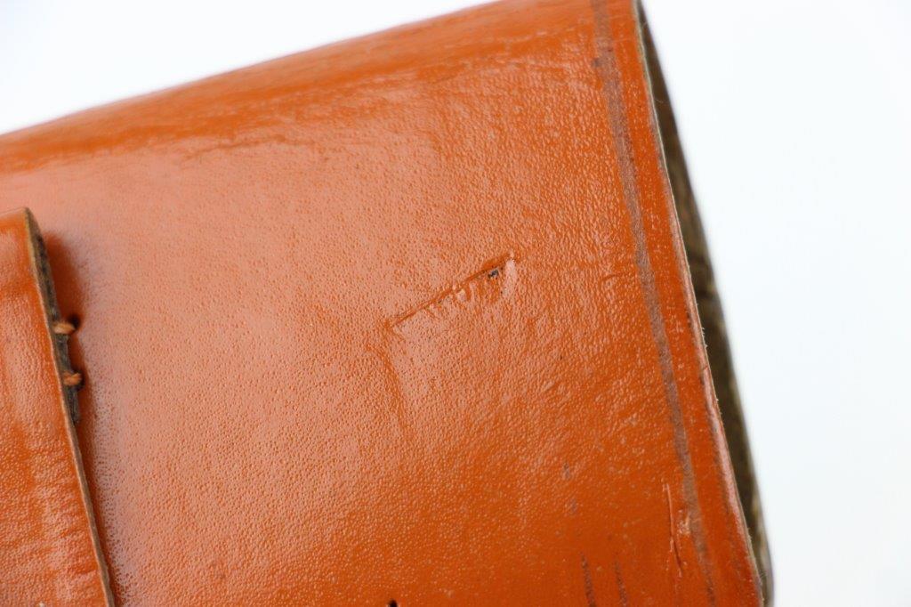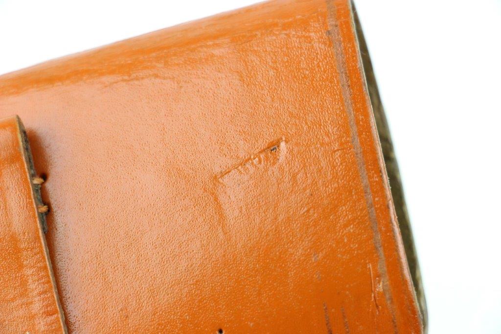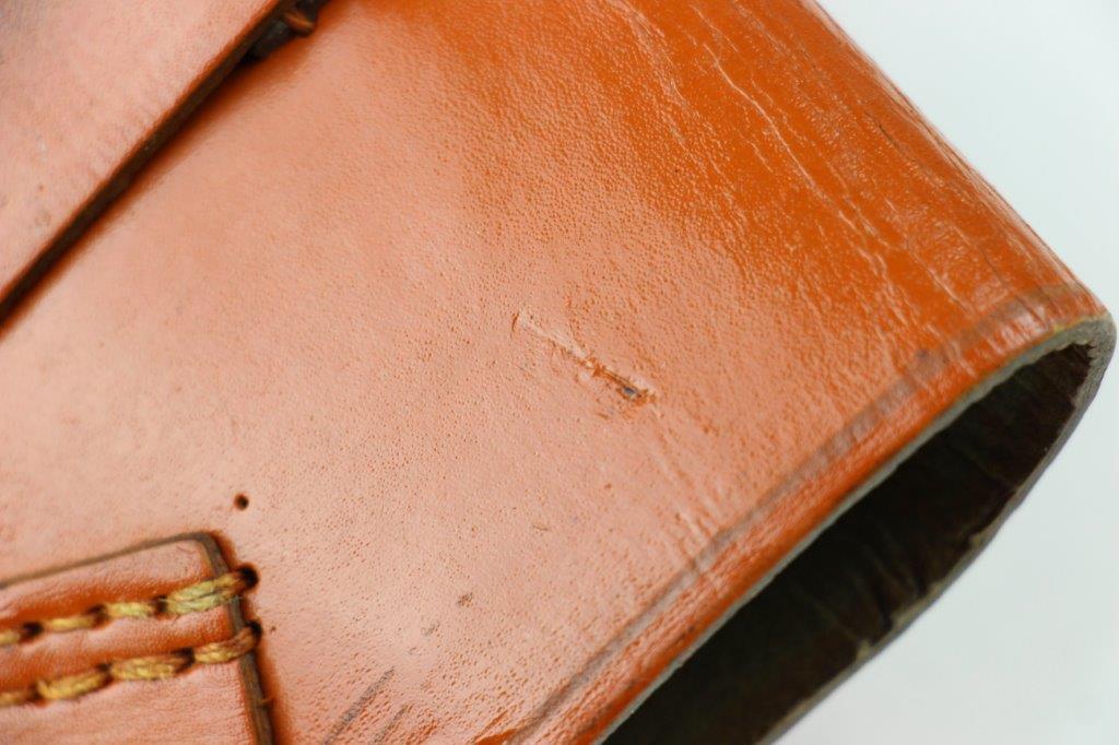 3/4/24 – This is an excellent condition example of a late WW2 production Ersatz German 7.65mm holster. Fits a Walther PPK, Sauer 38h, or Mauser HSC. The holster shows light use wear but has no major issues and minimal wrinkling and cracking, which is commonly found on these rough examples. This example is much nicer than most, and has all original stitching intact. The most desirable feature on this holster is the faint German military eagle proof stamp found on the back of the holster, as shown.