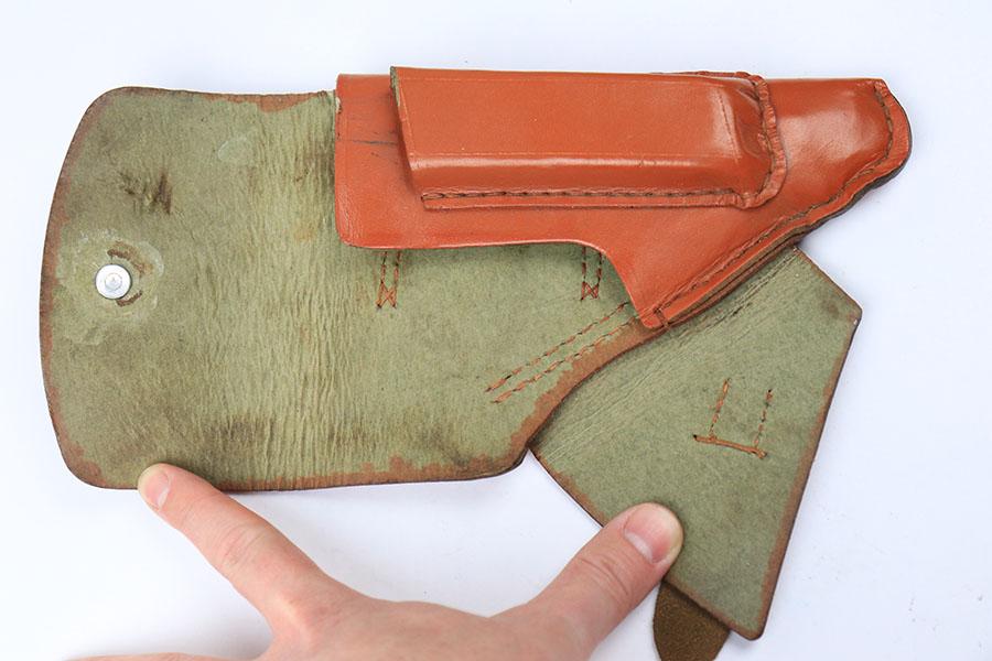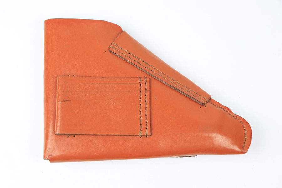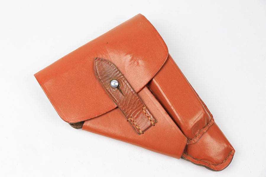 8/24/21 – This is an original, late WW2 ersatz style holster for a Walther PPK or similar sized 7.65mm pistol. The holster has clean light brown “paper” material and a leather closure strap. The stitching is all tight and in tact. No stamps or markings.