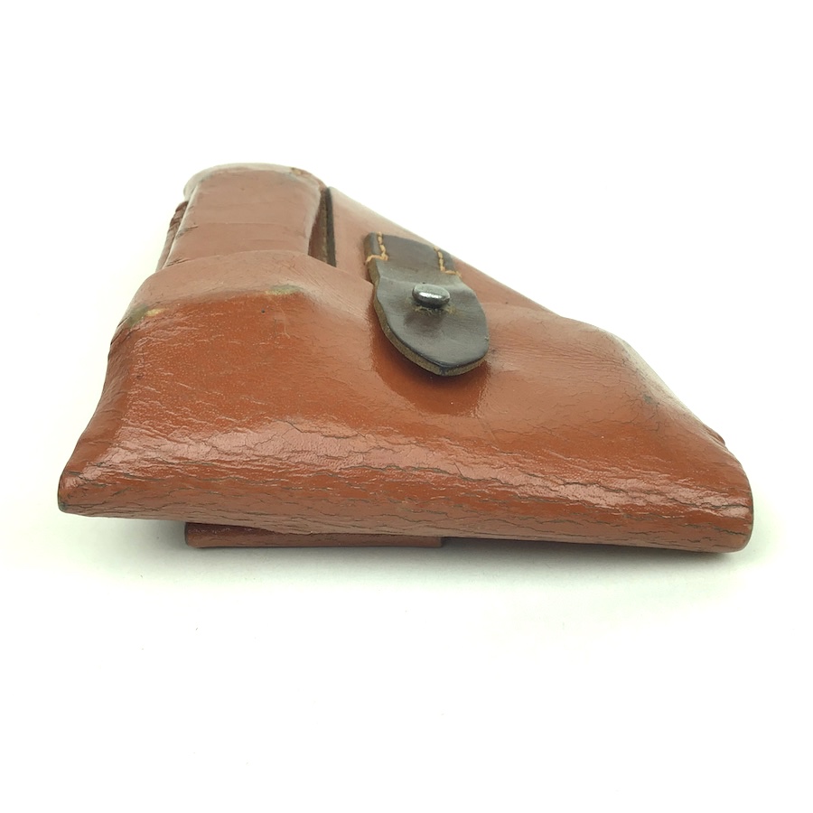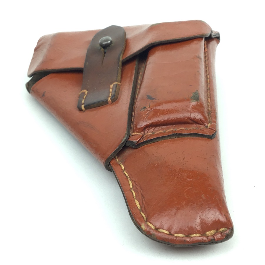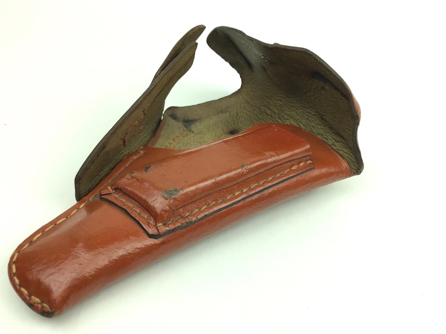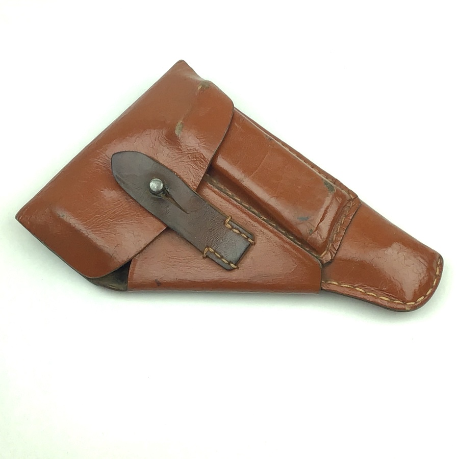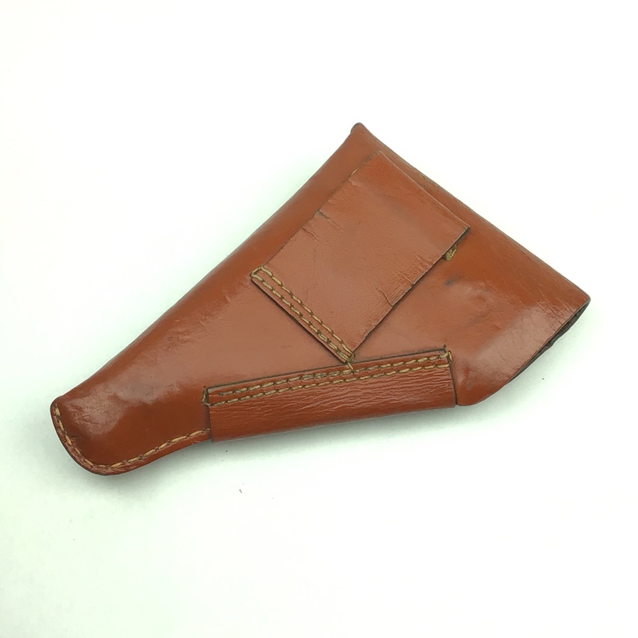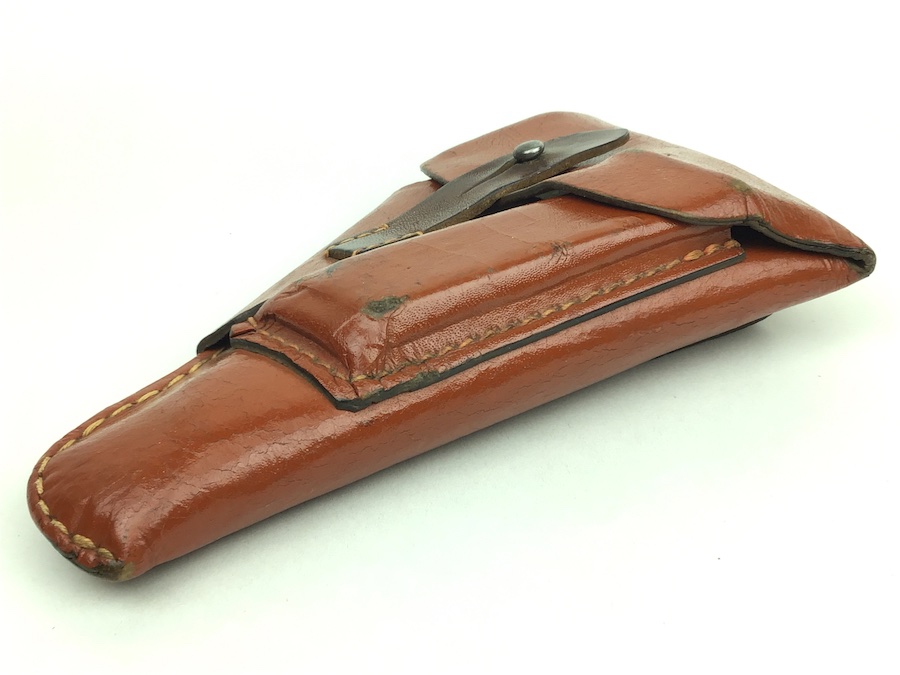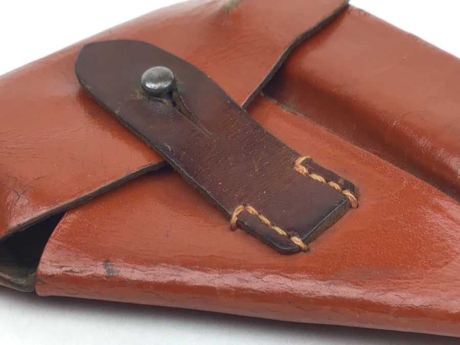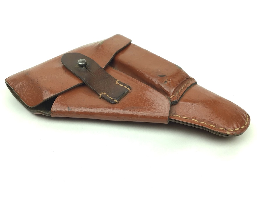 4/3/20 – This is a minty, light brown ersatz holster. Ersatz holsters were made from layers of recycled paper at the end of WW2 as supplies for the Germans ran low. The leather/paper is very strong and firm and in excellent condition. The stitching is all tight and original with no missing stitches. The only leather piece is the closure strap. There are no markings on the holster. Appropriate for a Walther PP or similar sized 7.65mm pistol.