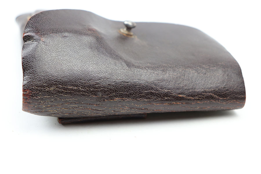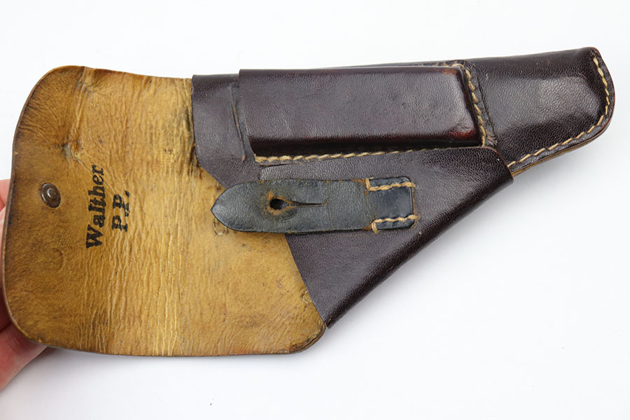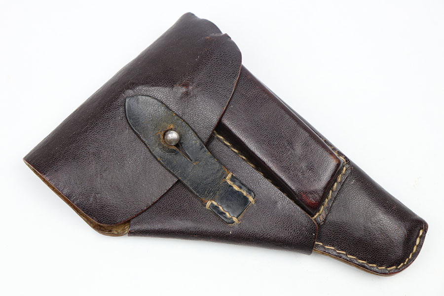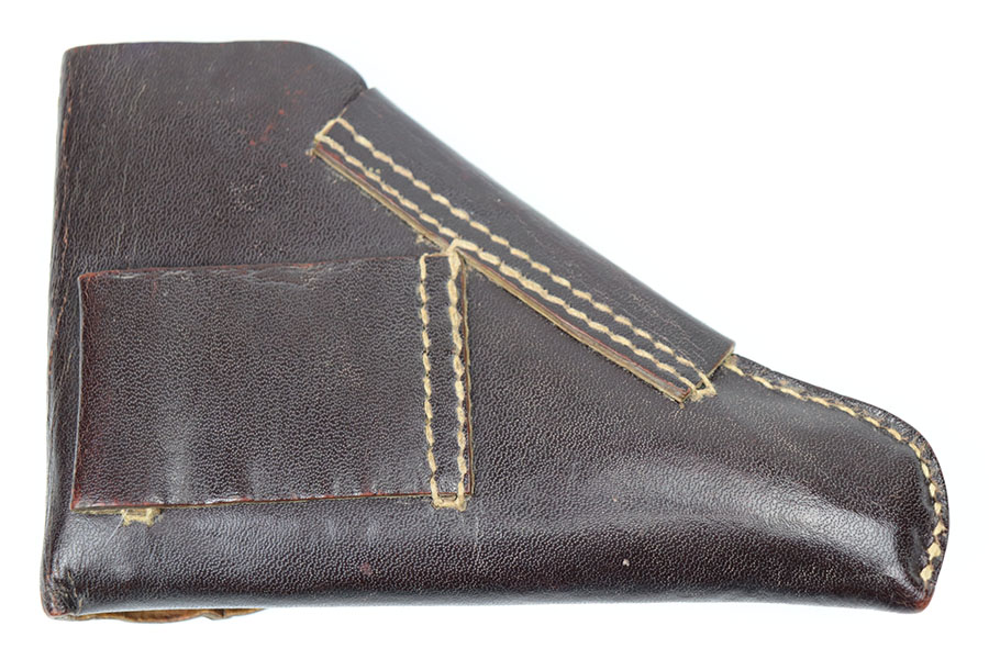 4/7/21 – This is an original, late war production Walther PP holster. The holster is “ersatz” meaning it’s made from compressed paper. Only the closure strap is leather. All original stitching is in tact. The exterior of the holster has some surface cracking but no major issues (cracking is typical for ersatz holsters). The interior leather has a crisp Walther PP ink stamp.