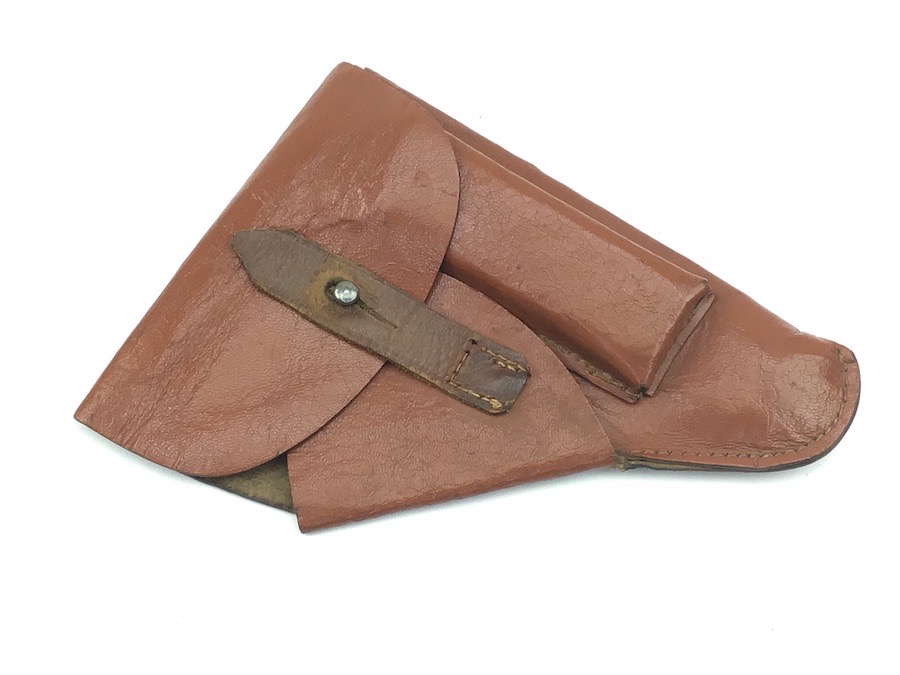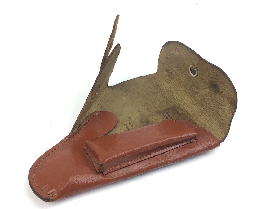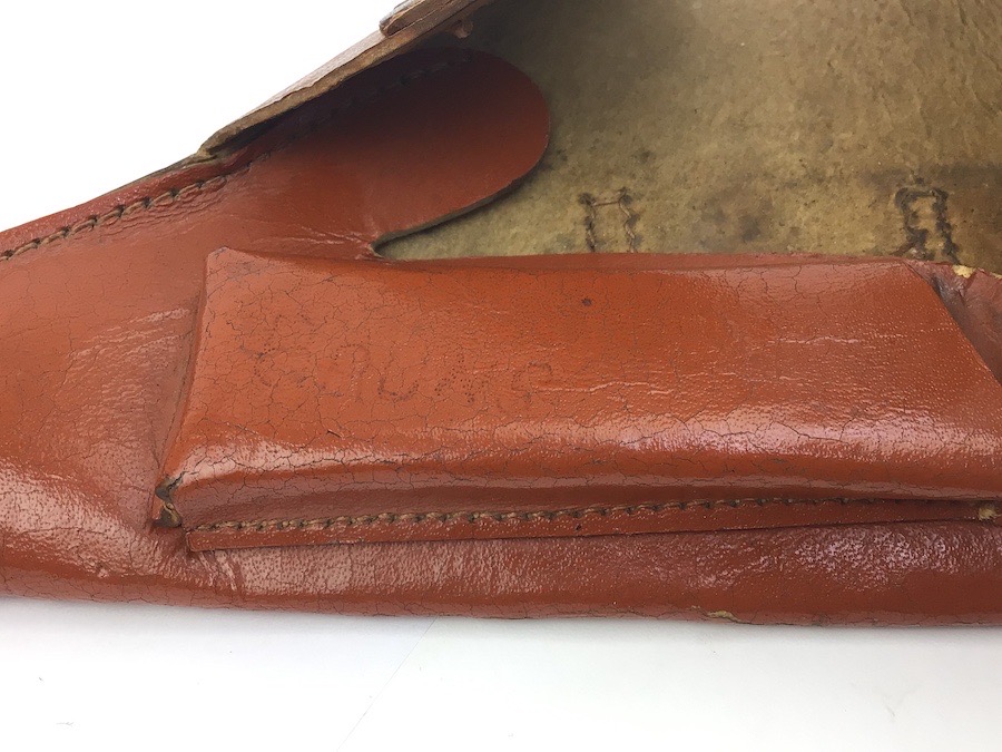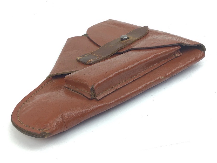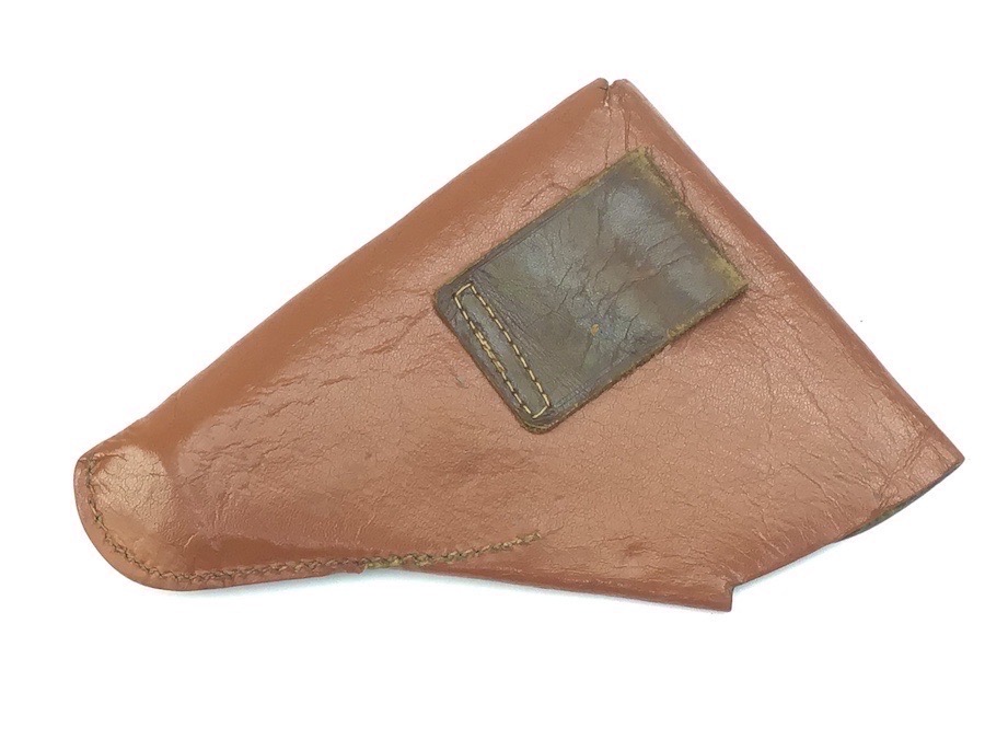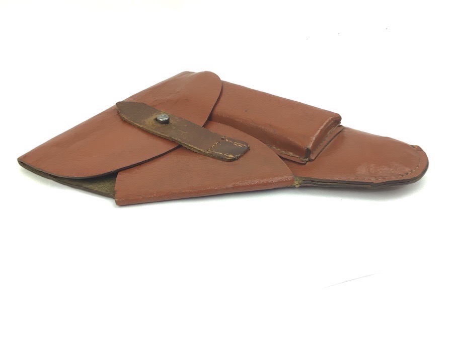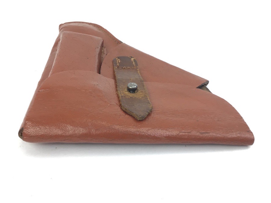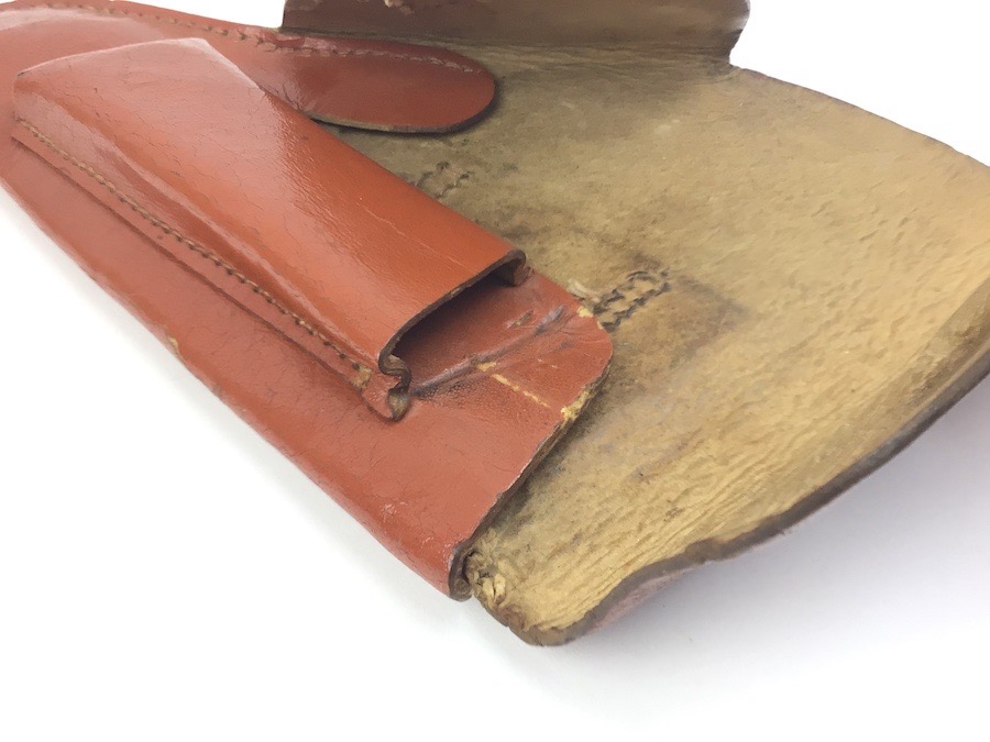 3/24/23 – This is an original, light brown ersatz holster. Ersatz holsters were made from layers of recycled paper at the end of WW2 as supplies for the Germans ran low. The leather/paper is very strong and firm and in very good condition. There is some minor discoloration and peeling of the paper, along with some wrinkling. The stitching is all tight and original with no missing stitches. Holster is somewhat flat, but still flexible. The only leather piece is the closure strap. There are no markings on the holster. Appropriate for a Walther PP or similar sized 7.65mm pistol.