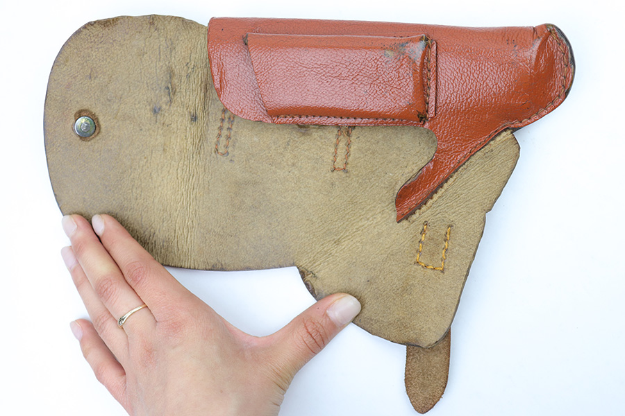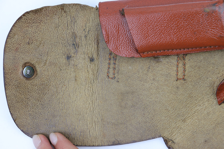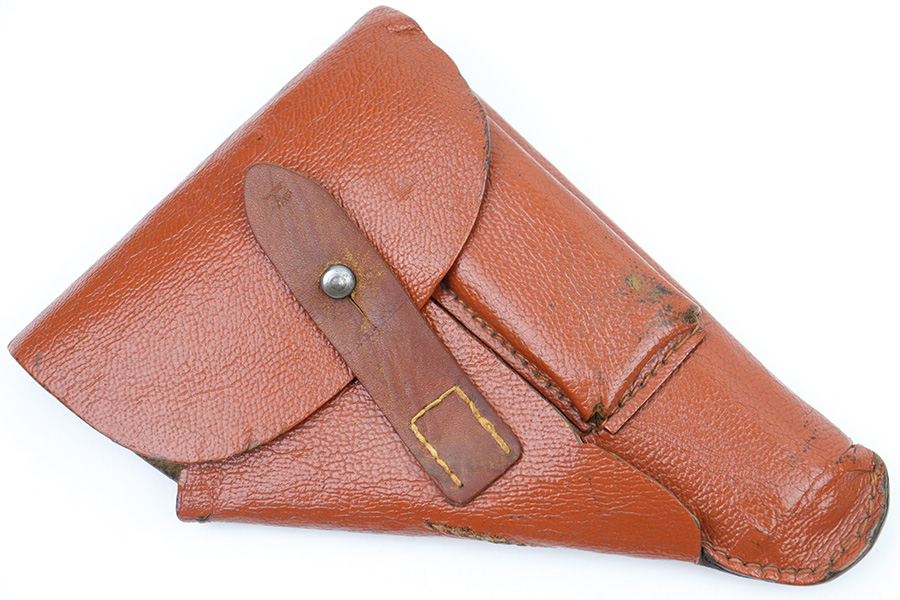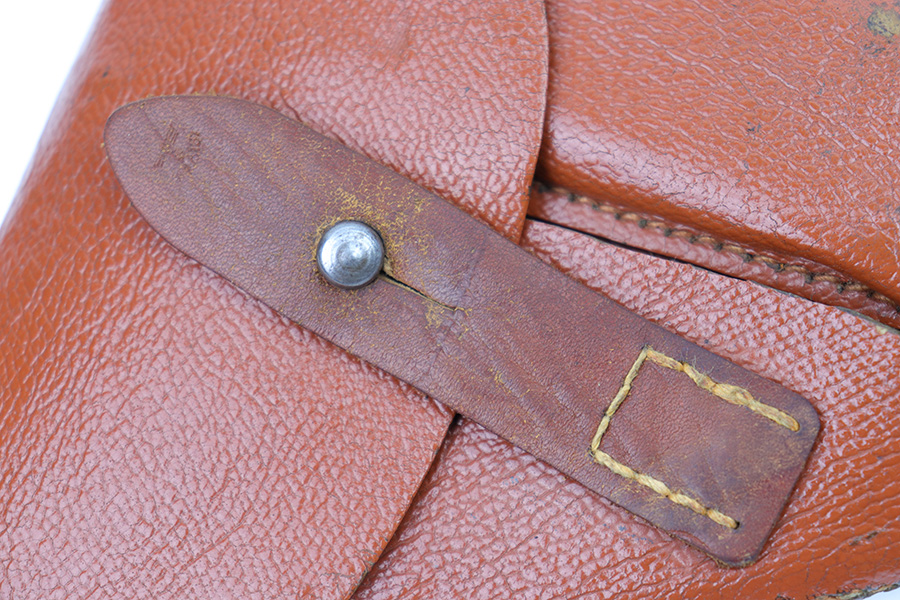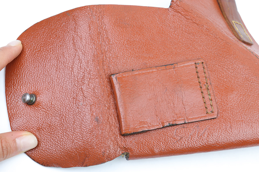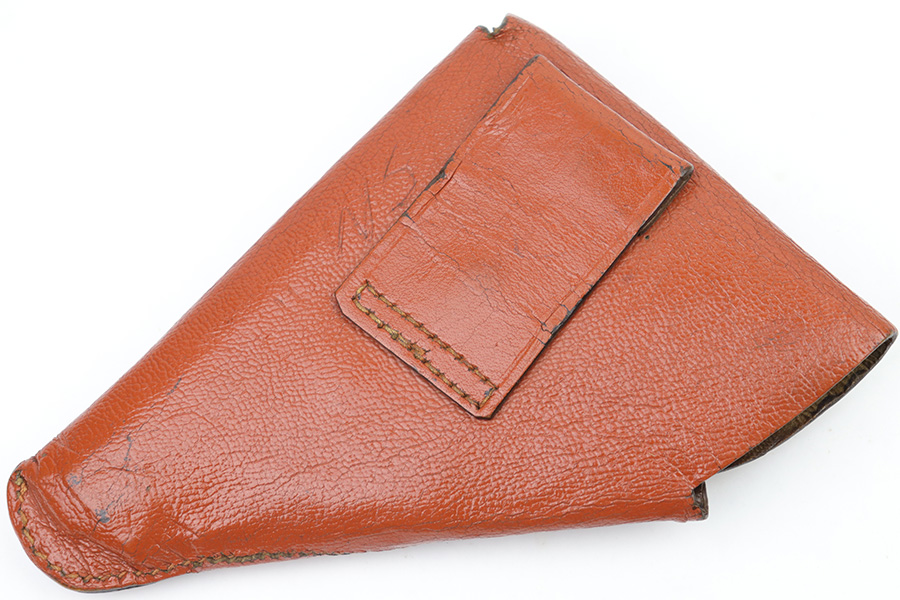 3/9/23 – This is a late WW2 production Ersatz style holster for a Walther PPK or similar sized 7.65mm pistol. The holster is made from recycled and compressed paper materials as the Germans were low on leather towards the end of the war. This example has a leather closure strap that’s waffen proof stamped. Most examples lack this waffen proof, making this one much more desirable and a great pairing with a late-war waffen PPK. There’s light surface wear and wrinkling on the holster, but no major issues.