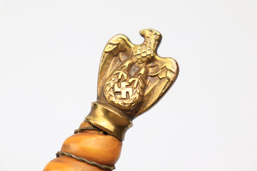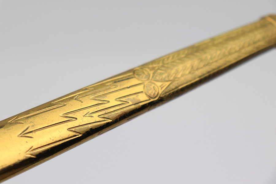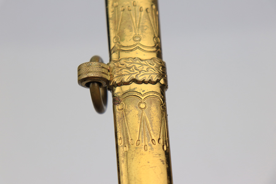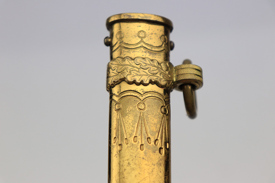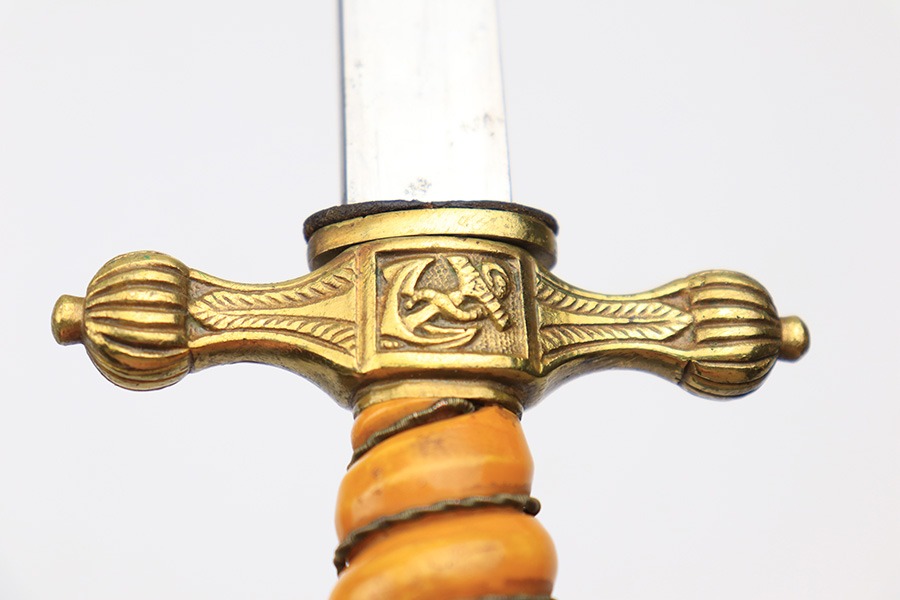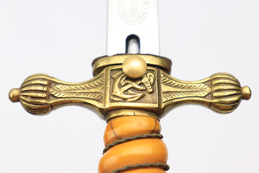 4/12/22 – This is a Kriegsmarine Officer’s Dagger by F.W. Holler made during WW2. The dagger comes with an original scabbard and features a double-etched blade. The engravings feature an anchor, battleships, and floral patterns. The etchings are slightly faded, and not as deep or crisp as other examples we’ve seen, but the blade is still in great overall condition with minimal discoloration and oxidation. No signs of sharpening. The leather stopper is still intact. The orange handle has some dark discoloration throughout, as well as a few small cracks near the base of the handle, where the handle meets the handguard. The pommel and hand guard have surface patina and edge wear throughout. Comes with a nice, original scabbard with a few imperfections, but no major issues. A great piece with some honest wear from use and aging.