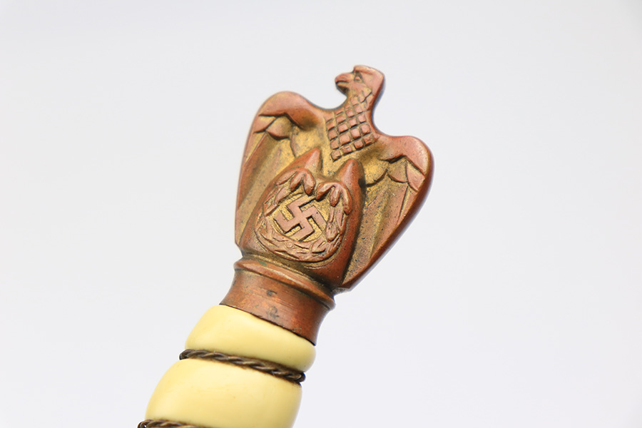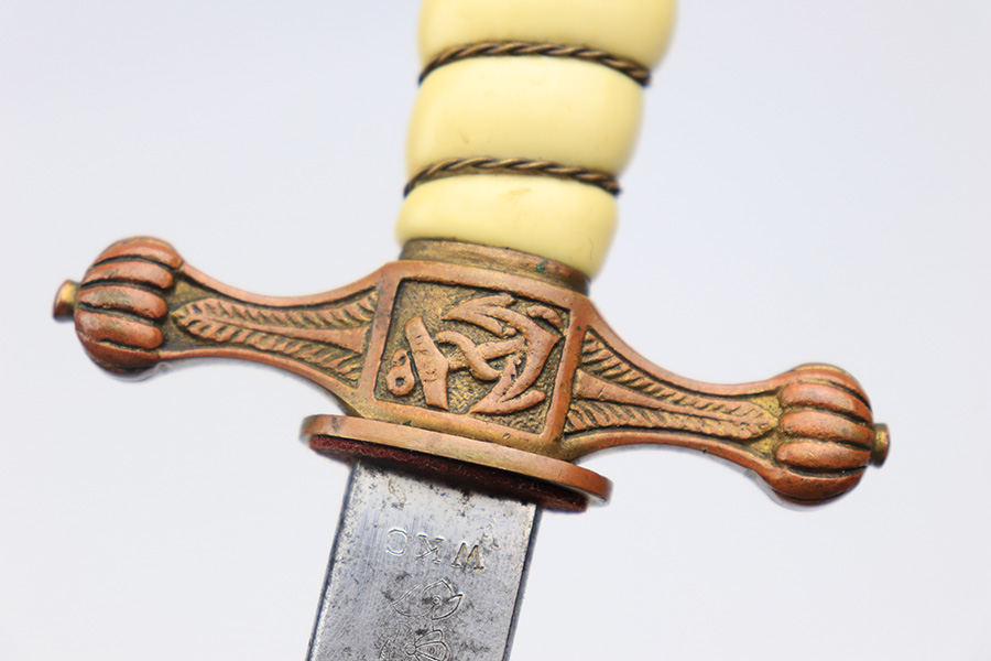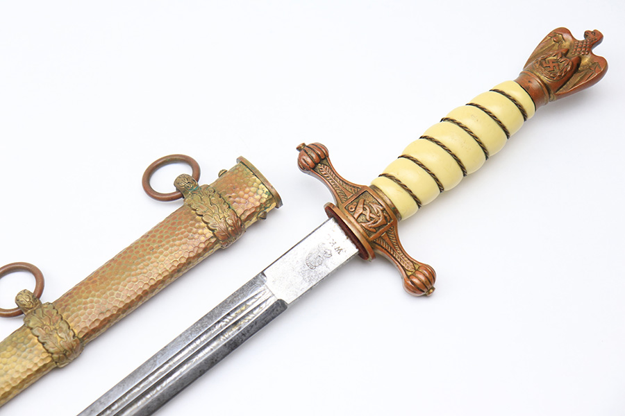 4/1/22 – This is a Kriegsmarine Officer’s Dagger by WKC. The dagger features an etched blade that’s engraved on both sides with naval motifs such as anchors, serpentine creatures, and floral patterns. One side of the ricasso is WKC maker stamped. The original red leather stopper is still visible. The blade has some mild oxidation and surface patina throughout but there are no signs of sharpening nor any major issues on the blade. The hand guard and pommel have both aged to show a darker burnt orange color, but are in great overall condition. The handle has no notable cracks or chips. Accompanying this piece is a desirable hammered style scabbard. The scabbard has some mild aging / surface wear but no dents.