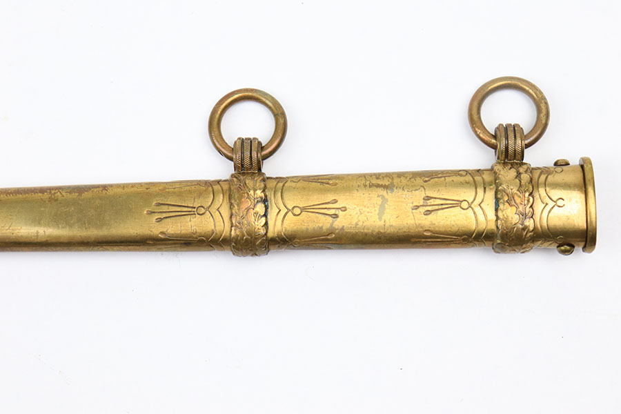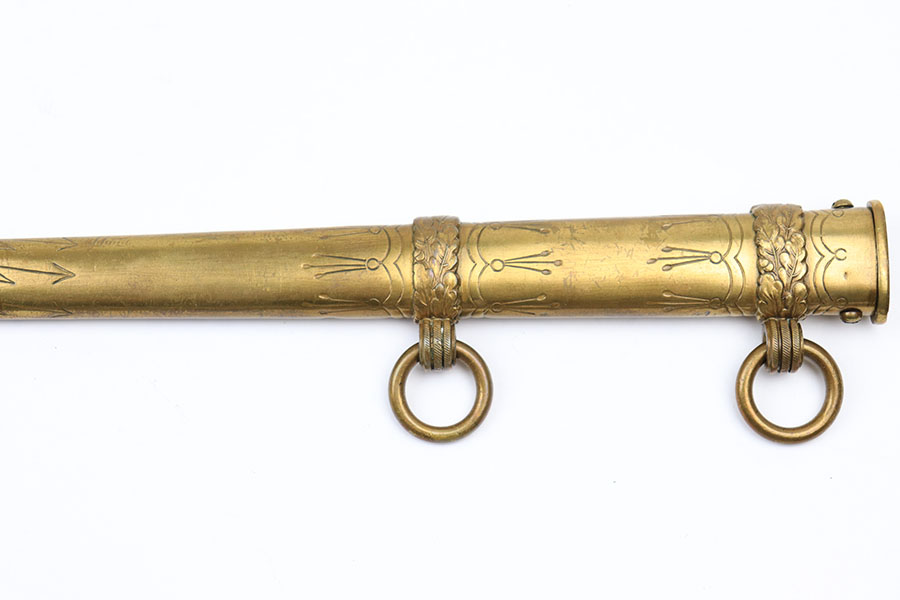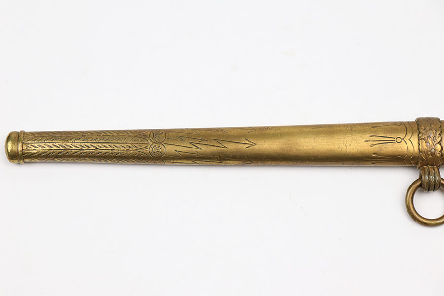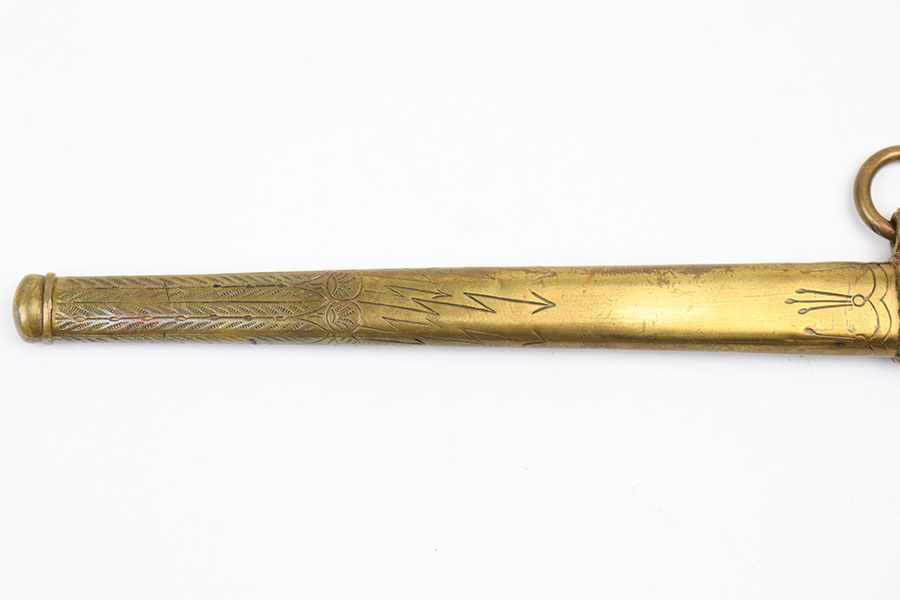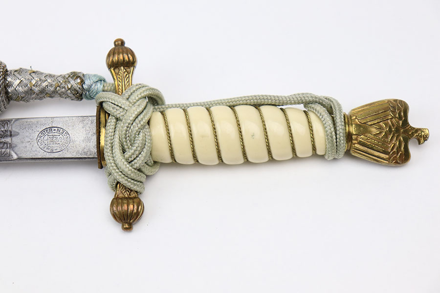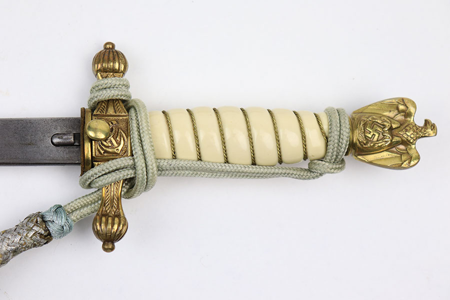 2/10/21 – This is an original Kriegsmarine dagger with etched blade and an original portepee. The blade is etched on both sides, which is an earlier, scarce variation. There is some light patina throughout in the form of normal surface oxidation. The off-white bakelite handle has no cracks or chips and is in excellent condition. the portepee has an excellent rope and some mild wear on the knot. Some light surface wear on the sheath and a mild dent near the toe.
