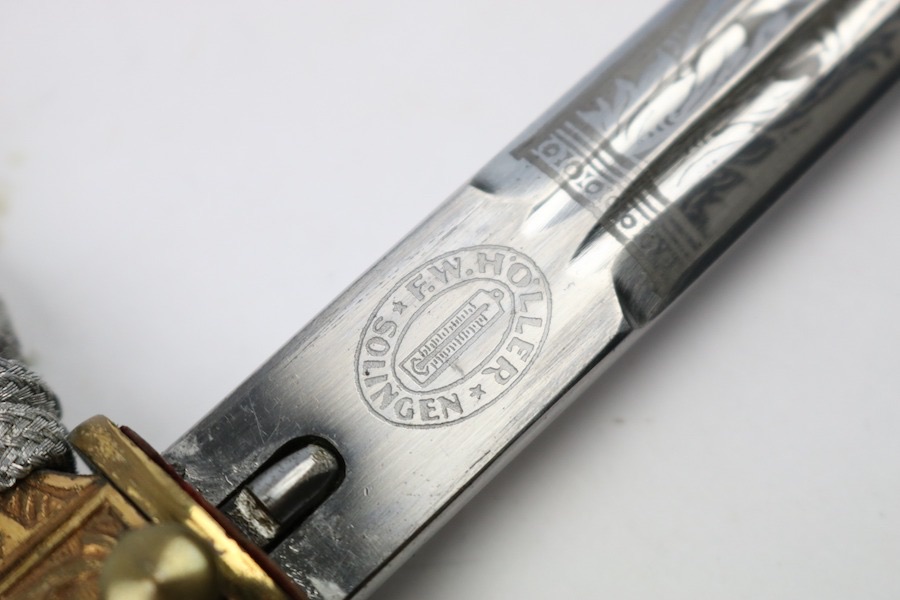 4/1/22 – This is an original WW2 Kriegsmarine dagger with the desirable engraved or “etched” blade. The blade is maker stamped by F.W. Holler and excellent overall. Very clean with minimal wear. The red leather stopper is still in tact although thin and shows wear. The handle is excellent with no cracks or chips, and a silver portepee is attached. The portepee has minimal fraying and is excellent as well. The scabbard has no dents or notable flaws.