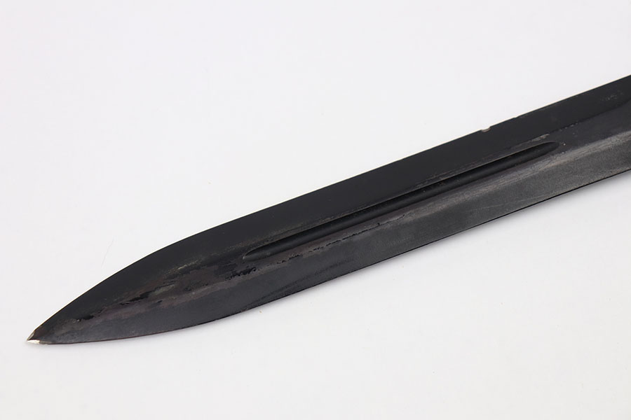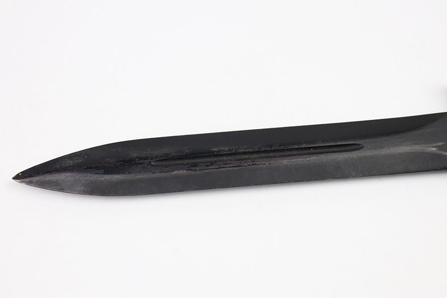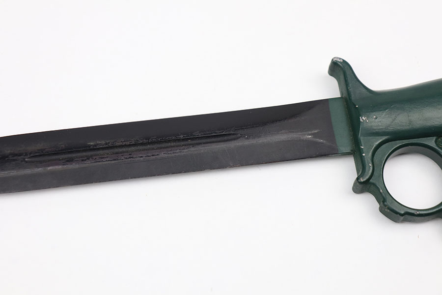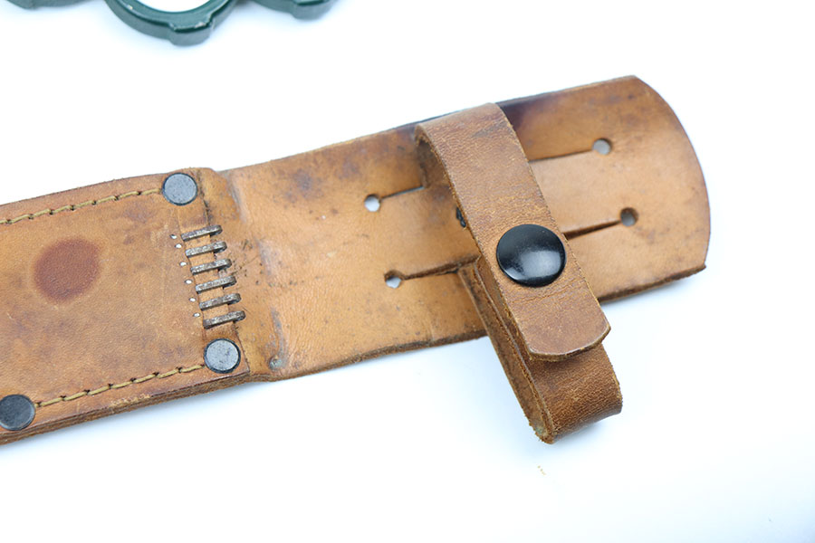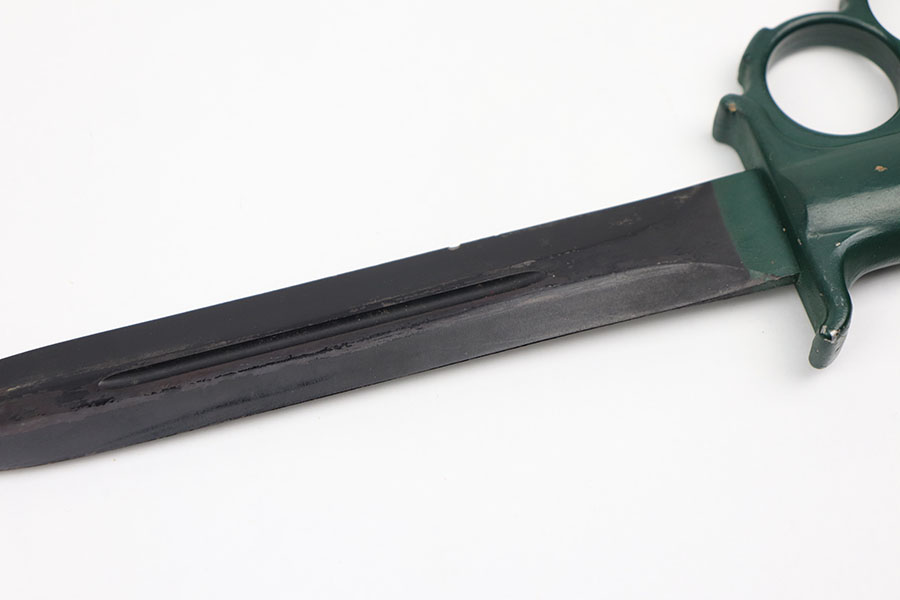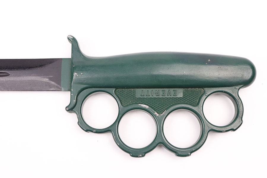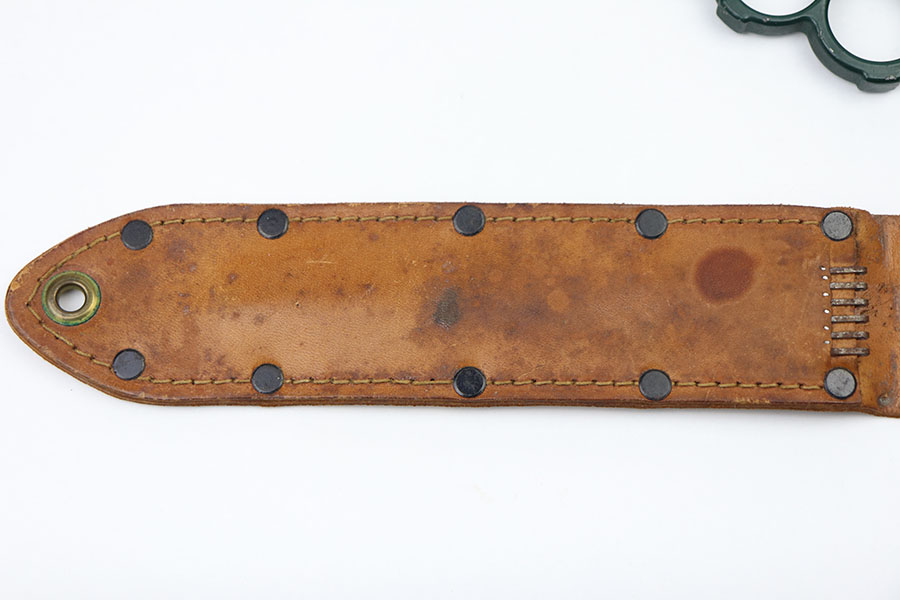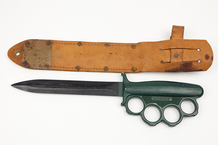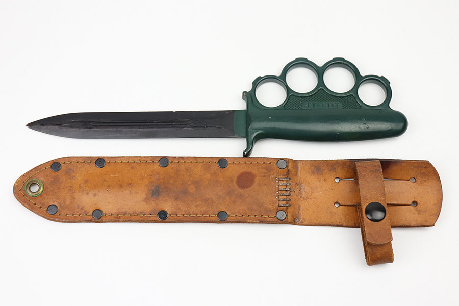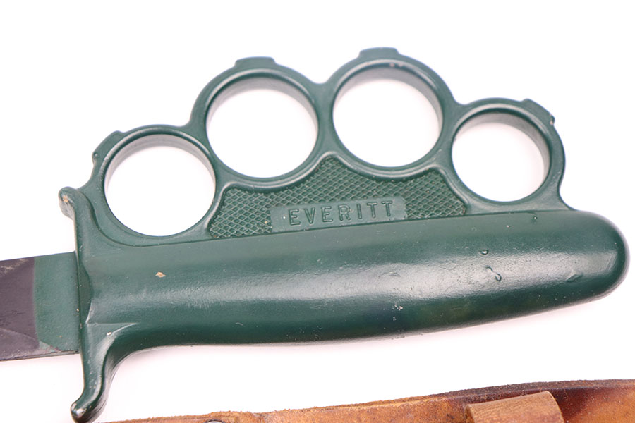 4/1/21 – This is a rare and especially nice example of the Everitt Knuckle knife & sheath from the World War II era. It is believed these knives were used by US soldiers during WW2 as a trench knife in the Pacific theater, but this isn’t confirmed. The handles were finished with either black or green enamel paint, and this one is obviously green. The blades were painted black. This example is nearly as nice as you’ll find them, with just a bit of finish loss on the blade and bits of edge wear on the handle. Original sheath is in great condition with some mild signs of aging and no markings or stamps.