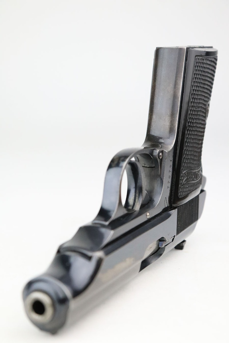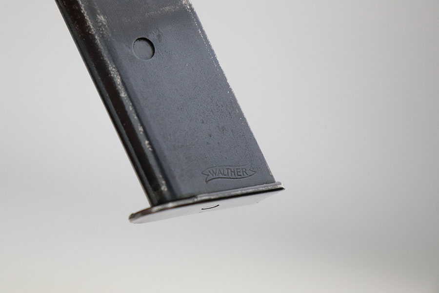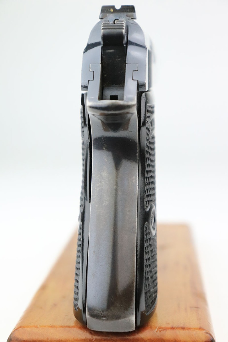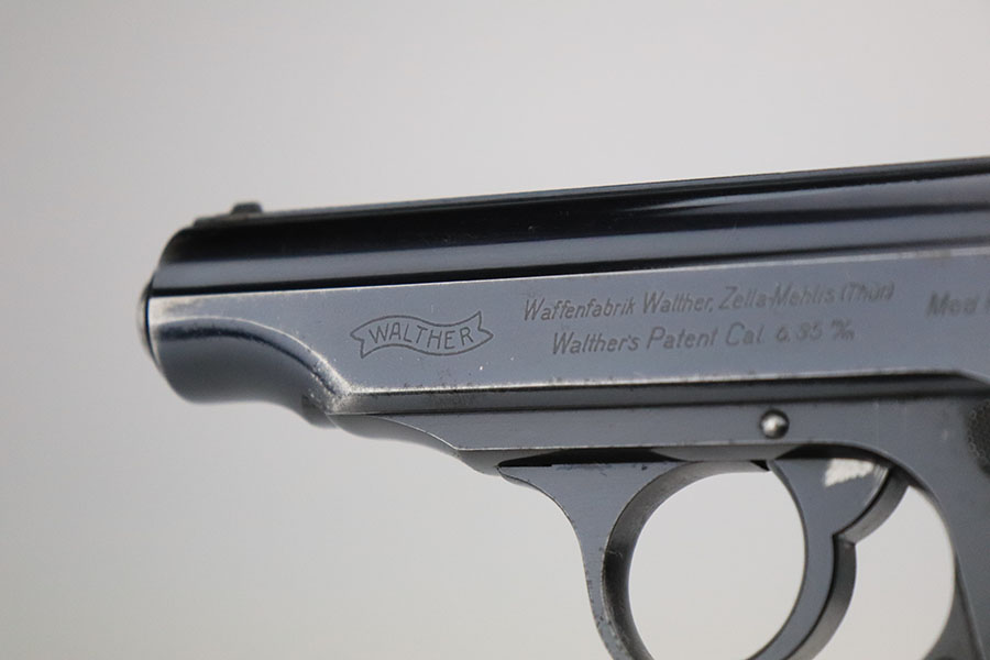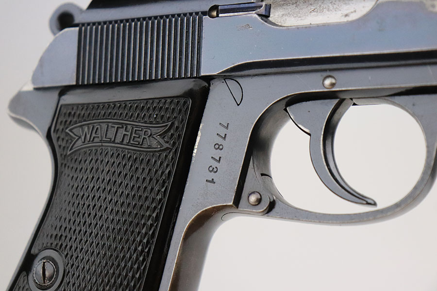 10/24/22 – This is an exceedingly rare Walther PP chambered in 6.35mm and sold in the commercial market in 1933. Only 50 guns of this variation were ever manufactured! They are even rarer than the .25 Caliber Walther PPK. This one is all matching, has the proper “Crown N” commercial proofs, and is marked “6.35mm” on the slide. The gun has retained roughly 85% of its original high polish finish. The most obvious sign of wear is an area of finish loss on the front half of the right side of the slide. There is minor wear around the high edges of the slide and around the muzzle. Minor thinning and brown patina on both grip straps. Comes with nice period-correct black grips – on the left panel, there is cracking along the edges and repaired chip on the right edge. Also comes with a period-correct magazine – these were originally 7.65mm magazine tubes that have a 6.35mm Walther Model 8 magazine inserted inside. This one is correct. Near-mint bore.