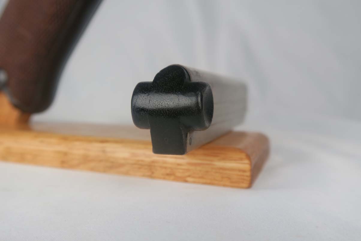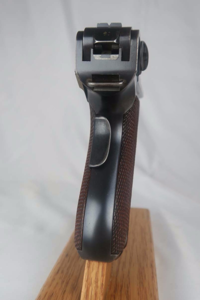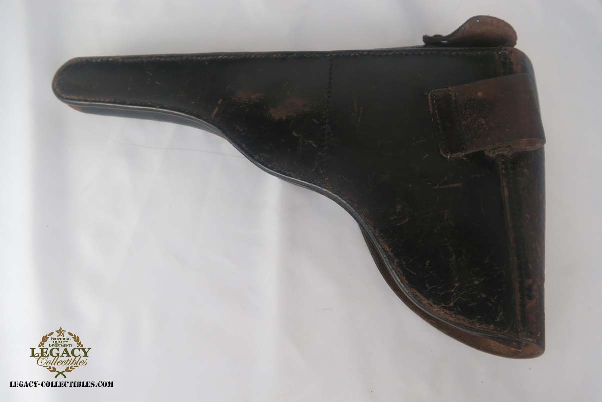 5/25/17 – While not minty this is an excellent example of a 1900 Commercial Luger Rig.   The gun is all original finish in about 95% condition.   The original straw color small parts are at about 70%.   Numbered parts are all matching.   It comes in 30 caliber luger.  It has the wide trigger guard, “dish” toggle and grip safety.   The “mystery” part is the safety lever.   I was not familiar with this style but by searching a bit found the identical lever on a 1900 Swiss luger.   So, I believe this unusual style is original to the gun.  However, if you would prefer it swapped for a standard lever, I can have that done as I do have a spare.   The grips are in excellent condition and numbered to the gun.  The frame is “Germany” marked so the gun was made for export.  The markings have proper “halos”.   Comes with excellent magazine which is properly blank.   The bore is also very nice but has a little frosting – I’d rate it 7 out of 10.    Comes with a correct luger holster, which has cracking and wear.   There is a name written inside the flap.   Also comes with a correct cleaning rod with oiler.