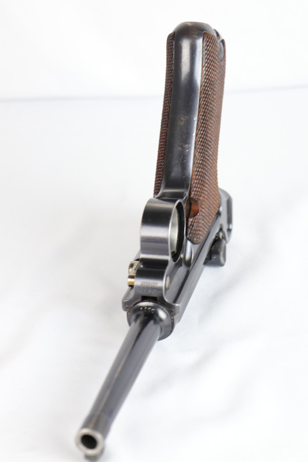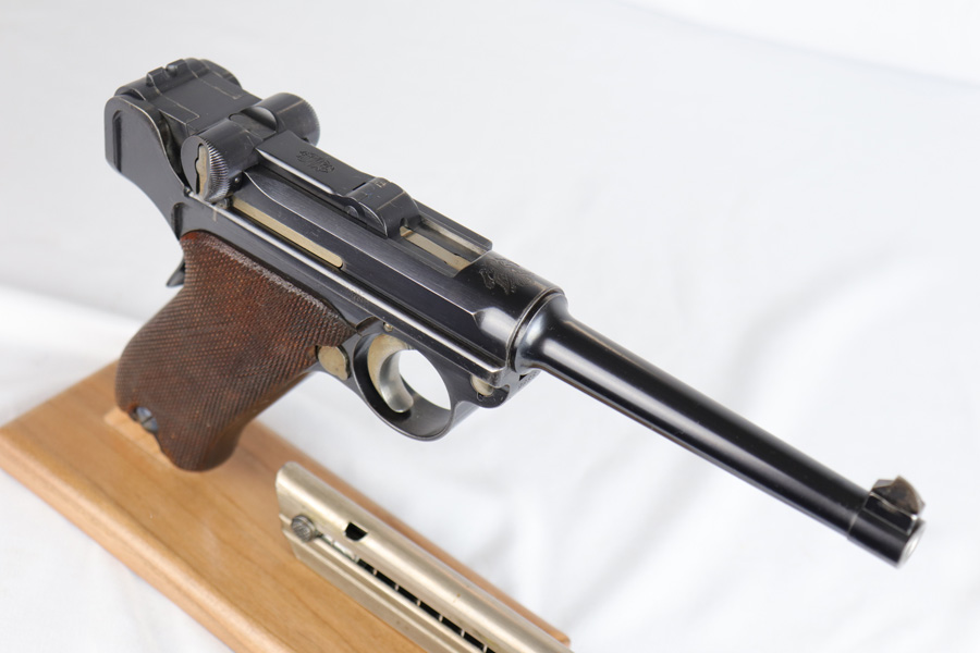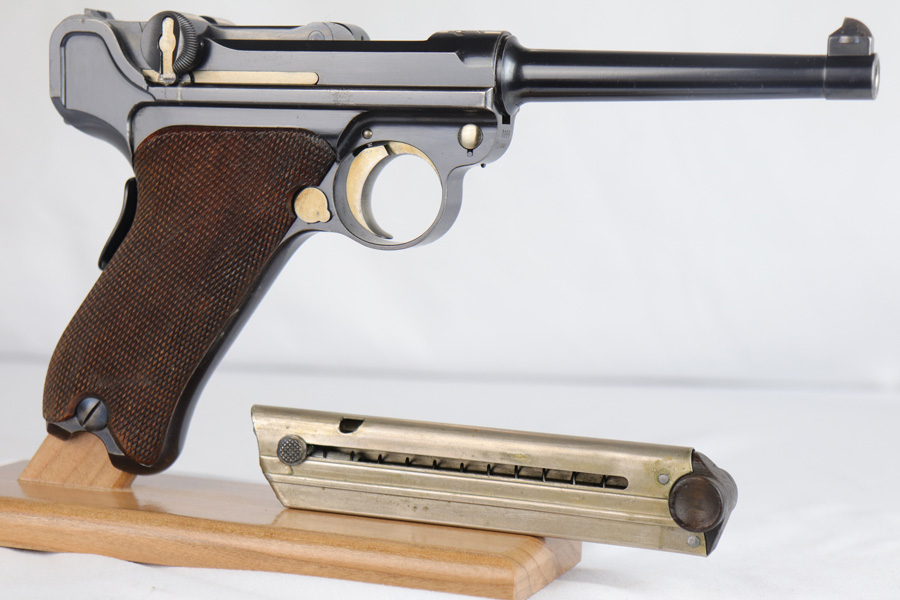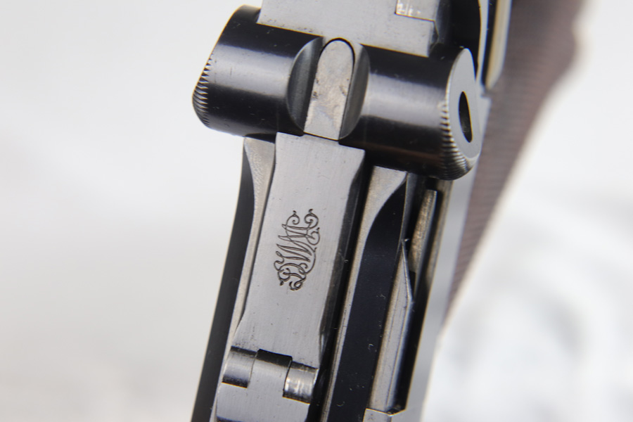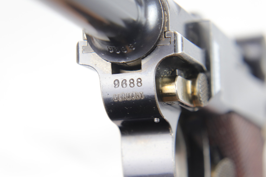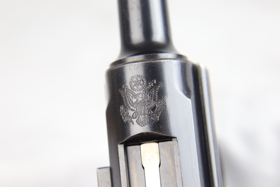 2/22/19 – This is a rare DWM model 1900 luger with American Eagle crest on the chamber. This is the first production model of this variation, made in or around 1900 with early dish toggle. These pistols went to the US retail market and the manufacturers at DWM realized that nation-based crests increased sales of these lugers, so that is why you find the American Eagle over the chamber. This is also why you see GERMANY marked on the frame, denoting these were exported for commercial sale. This pistol is in excellent original condition, with a beautiful profile view. Majority of the finish loss is found on the straps, though there is a small area of surface freckling on the right side rail. All matching numbers on the pistol with correct blank-bottom wood magazine. Bore has some frost throughout. The excellent grips are numbered and matching to the gun.