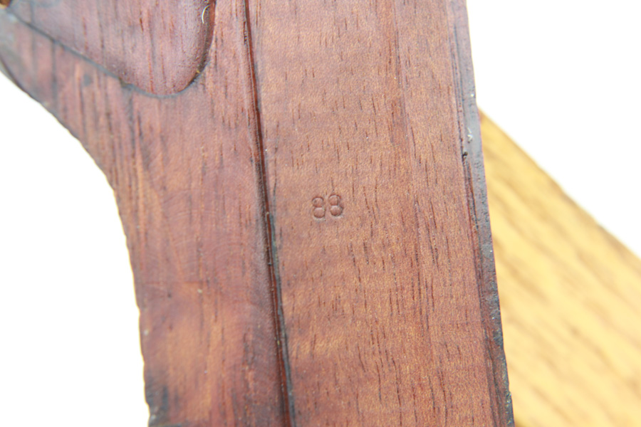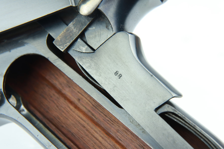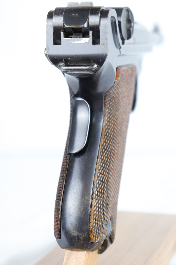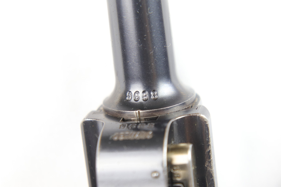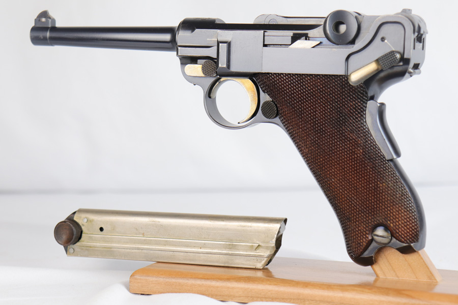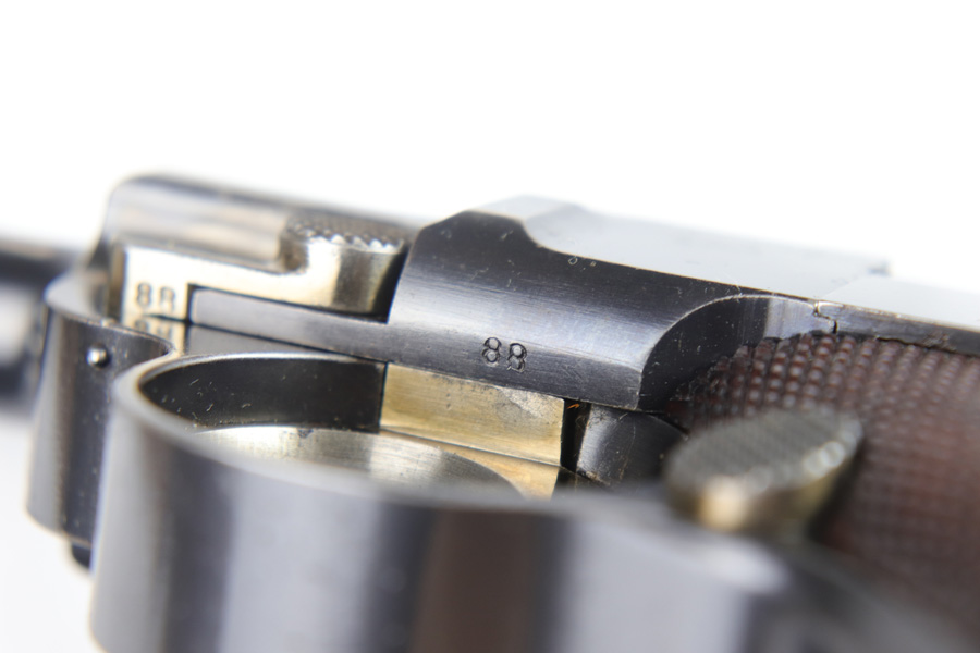 2/22/19 – This is a rare DWM model 1900 luger with American Eagle crest on the chamber. This is the first production model of this variation, made in or around 1900 with early dish toggle. These pistols went to the US retail market and the manufacturers at DWM realized that nation-based crests increased sales of these lugers, so that is why you find the American Eagle over the chamber. This is also why you see GERMANY marked on the frame, denoting these were exported for commercial sale. This pistol is in excellent original condition, with a beautiful profile view. Majority of the finish loss is found on the straps, though there is a small area of surface freckling on the right side rail. All matching numbers on the pistol with correct blank-bottom wood magazine. Bore has some frost throughout. The excellent grips are numbered and matching to the gun.