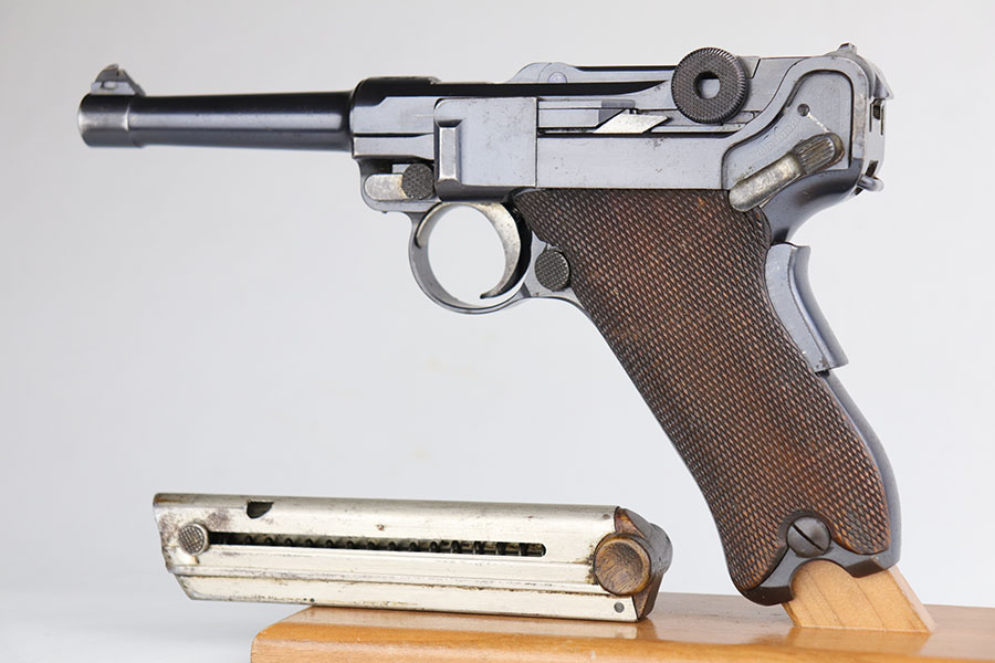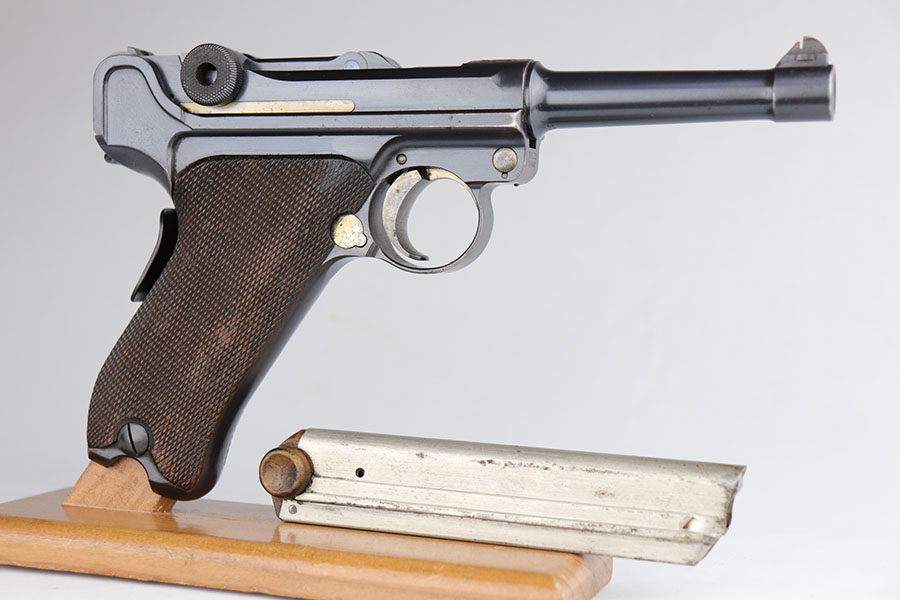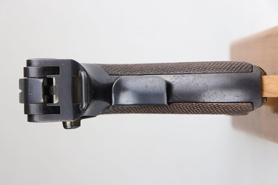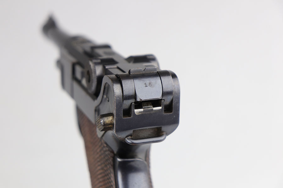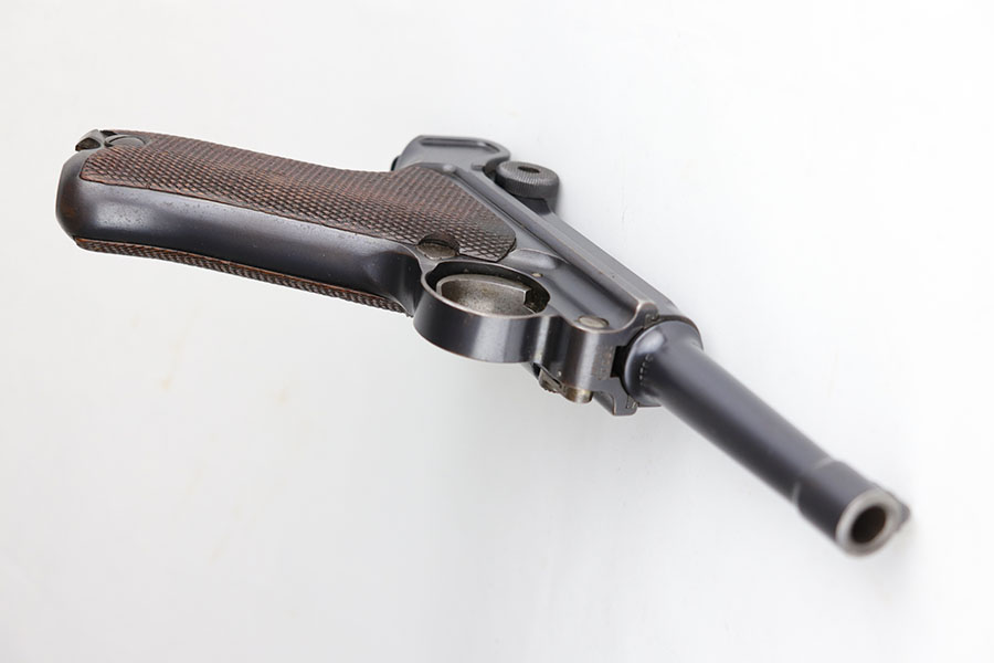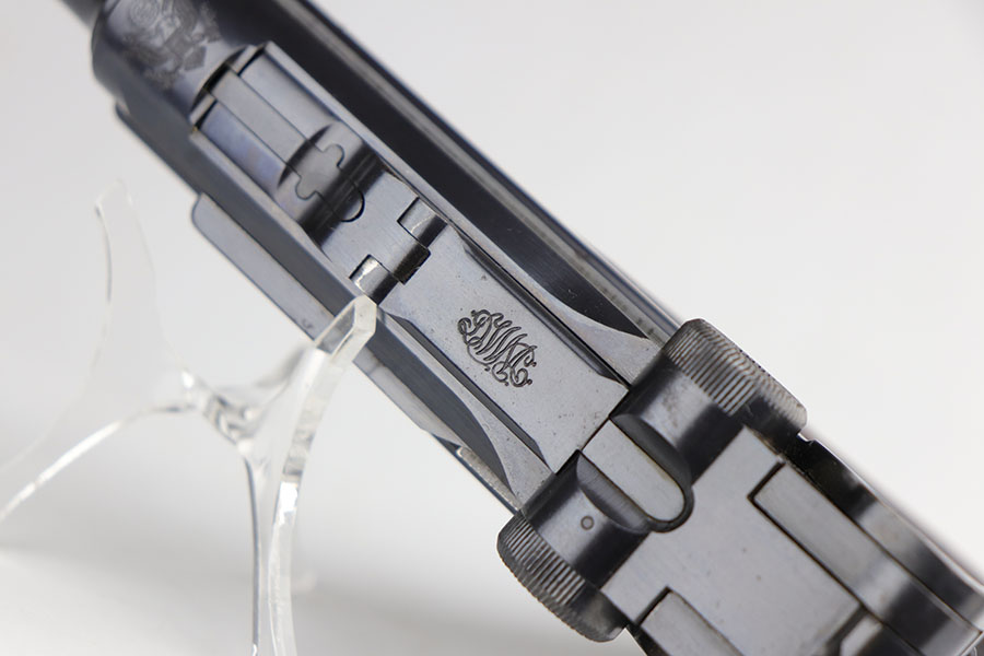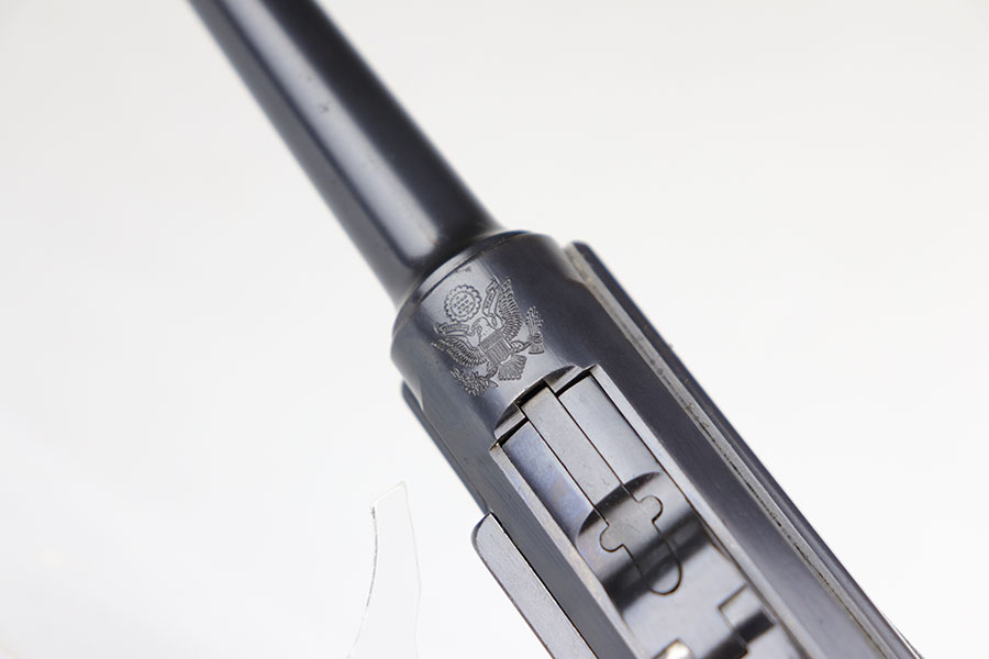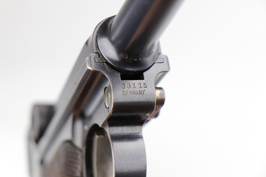 6/23/20 – This is a very nice, all original 1906 DWM American Eagle Luger. The pistol is all matching with about 97-98% blue remaining. There’s very little actual bluing loss, mainly on muzzle and sideplate. But there is some oxidation in most areas, most pronounced on the straps. Small parts retain very little of the original straw. Grips show minor handling wear, are mismatched to the gun and there is a small, repaired chip under the safety. The pistol comes with a WWI era military magazine in excellent condition. These pistols went to the US retail market and the manufacturers at DWM realized that nation-based crests increased sales of these Lugers, so that is why you find the American Eagle over the chamber. This is also why you see GERMANY marked on the frame, denoting these were exported for commercial sale. Unfortunately, the bore was not well cared for on this one and has notable pitting throughout with worn rifling.