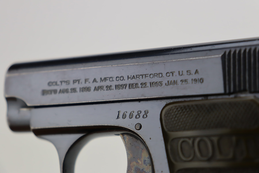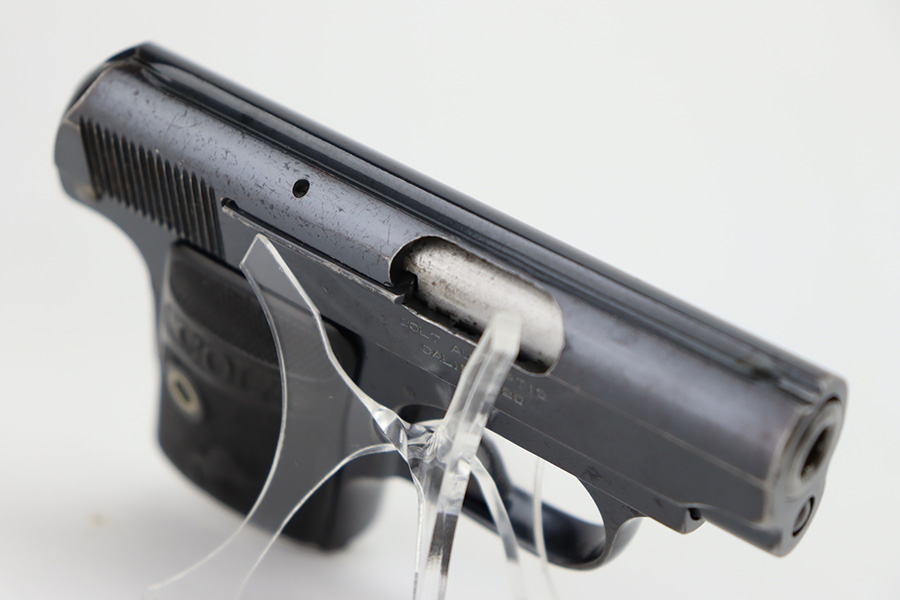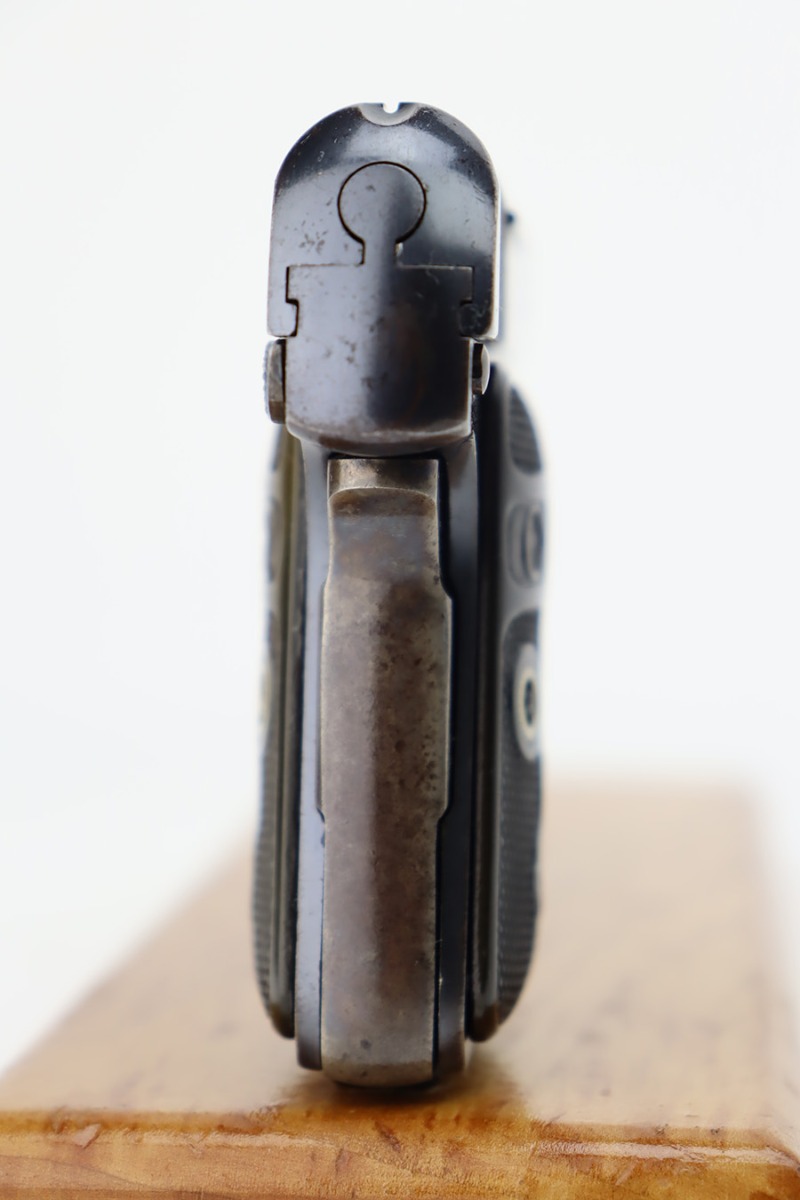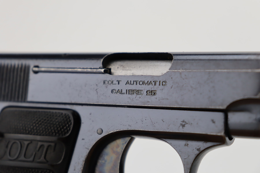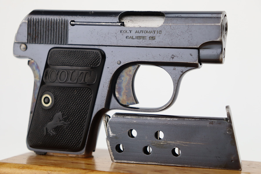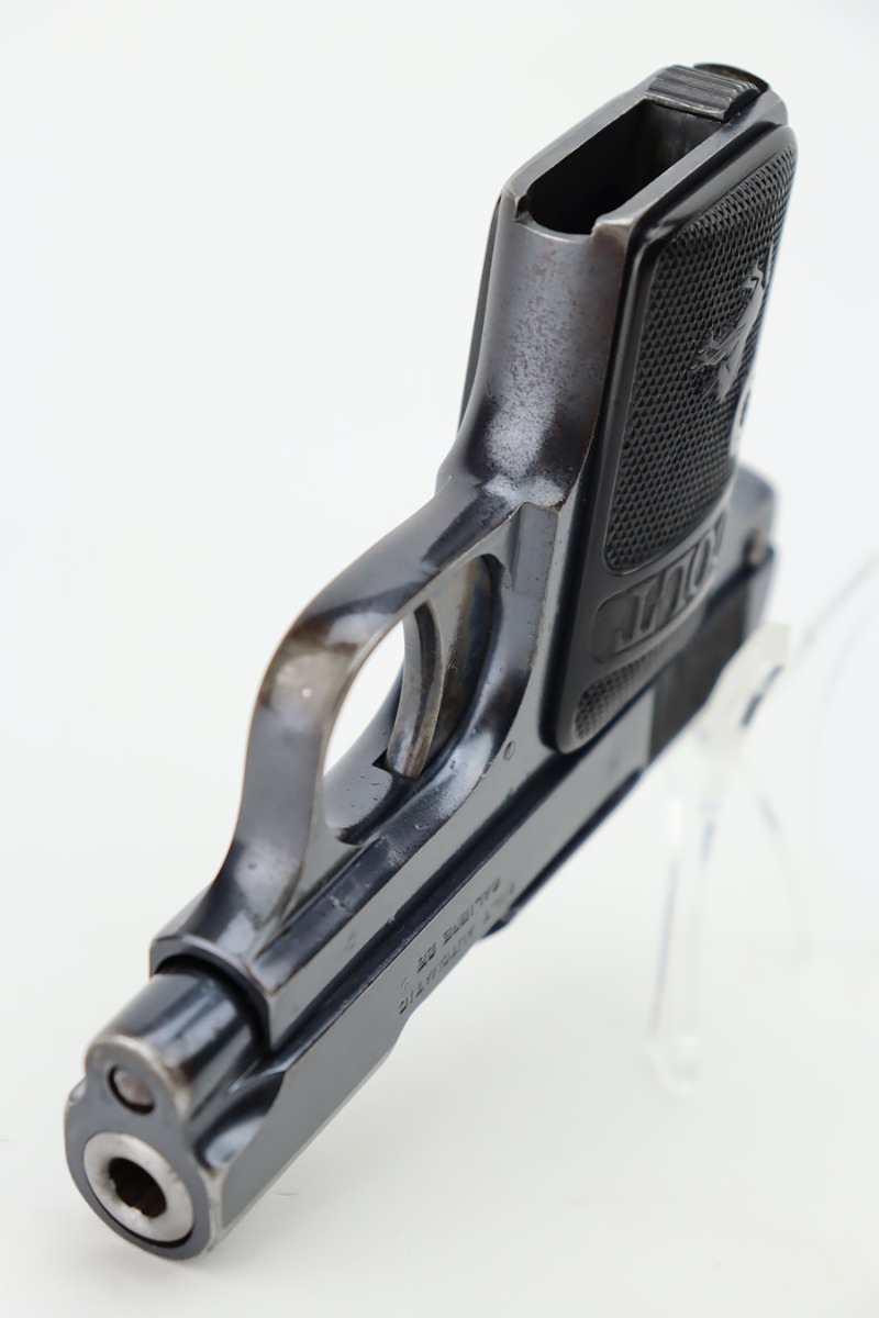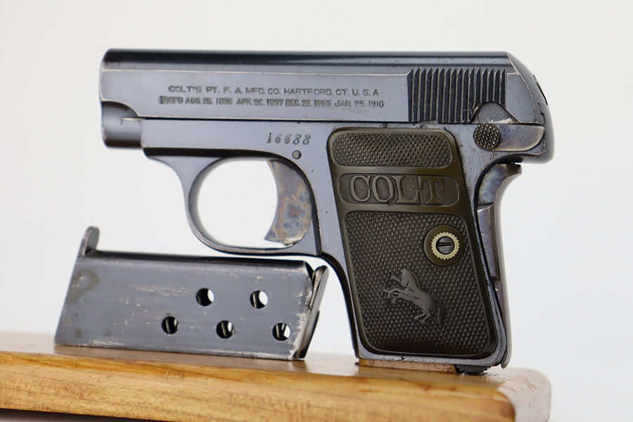 10/9/23 – This is an excellent Colt Model 1908 Vest Pocket, manufactured in 1909 and chambered in .25 ACP. The bluing rates about 97% with just very minor wear around the muzzle and on the high edges and some light freckling on the grip straps and on the right side of the gun. Fitted with excellent hard rubber grips and comes with one proper magazine. The bore has great rifling with very minor frosting in the grooves.
