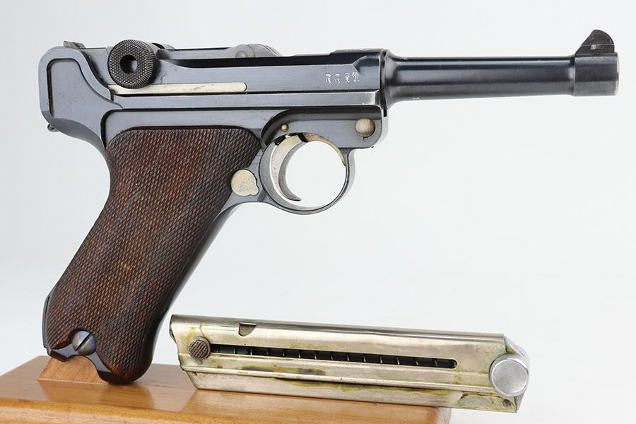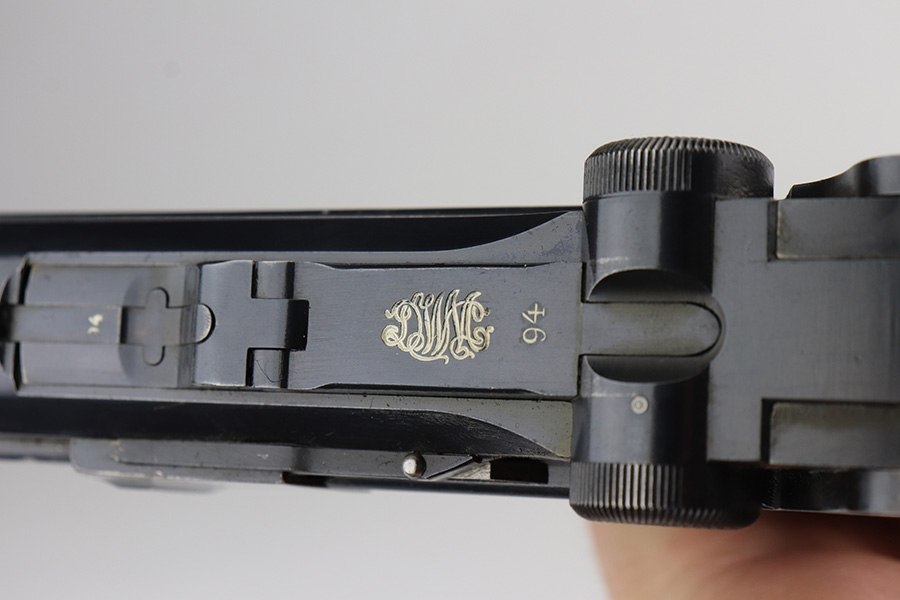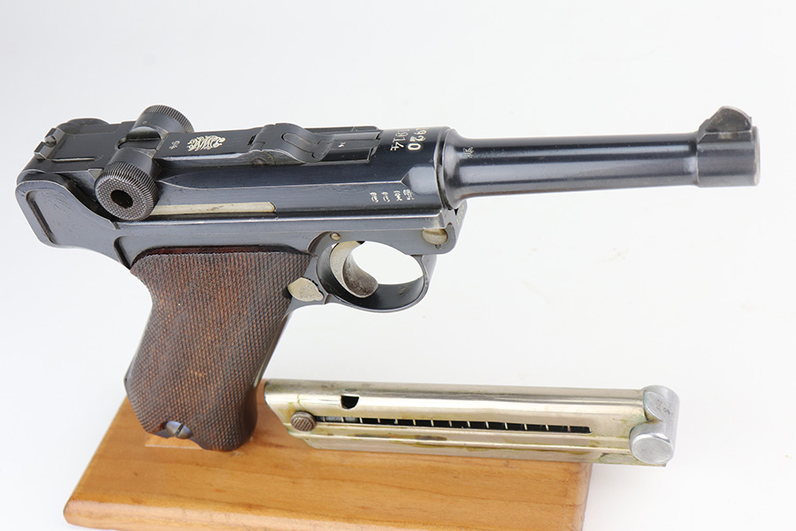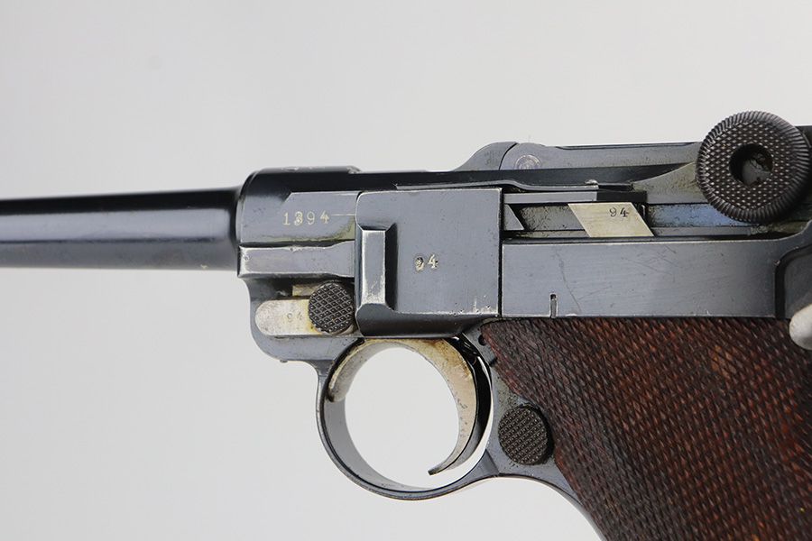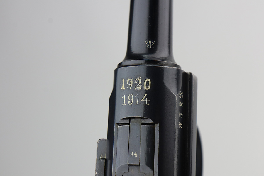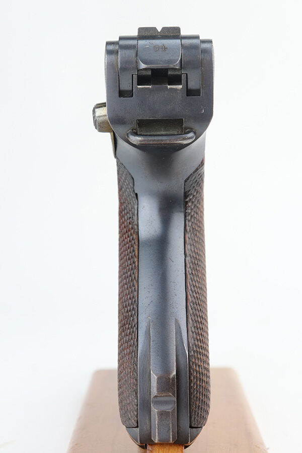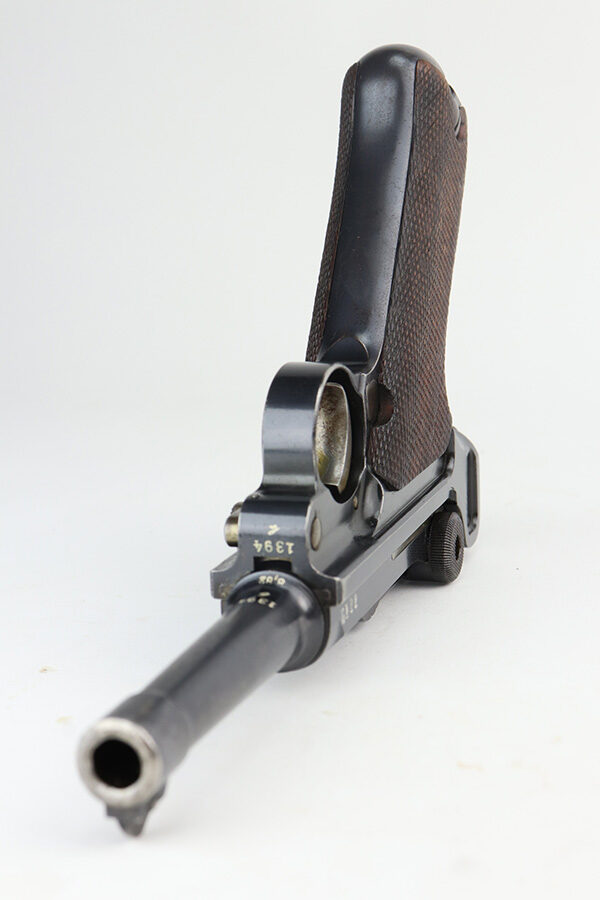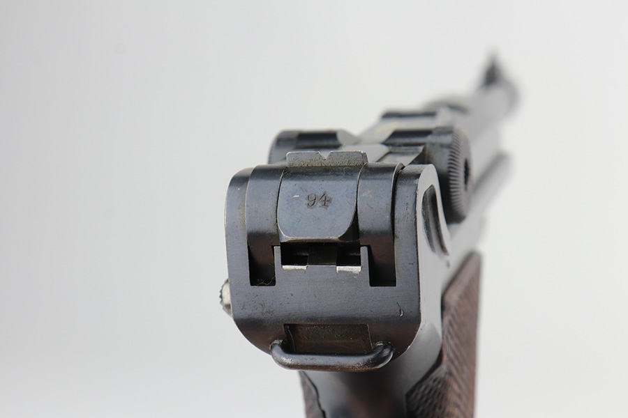 6/9/21 – This is an excellent example of a DWM Luger rig that was initially issued to the Imperial German Army in 1914. It was then reworked after the war and eventually issued to the Nazi police force during WW2. It has a “1920” rework marking on the chamber, an added police sear safety, and a matching WW2-era Armorer’s replacement magazine (numbered at the police arsenal). The gun also comes with a 1935-dated police-style holster – the stitching that holds the top flap on is coming undone. The gun is all matching and has the proper Imperial proofs. It has retained about 97% of its original bluing. There are just hints of wear on the side plate, side rails, and around the muzzle. Very minor pin-pricking on the straps. Comes with excellent original matching grips. Excellent bore – shiny with strong rifling.