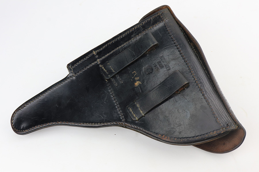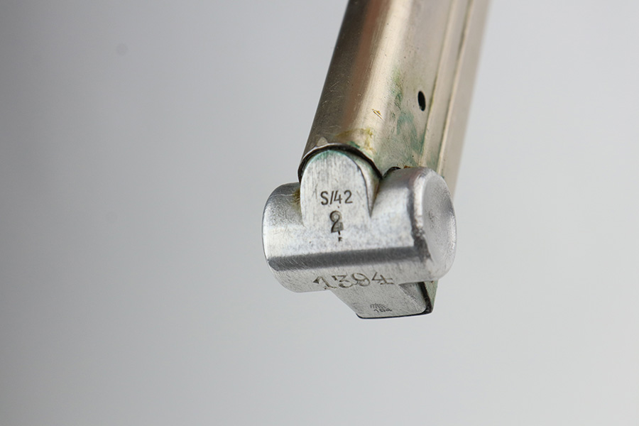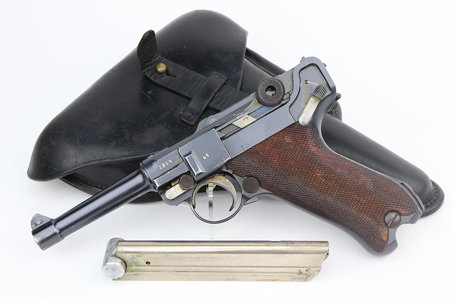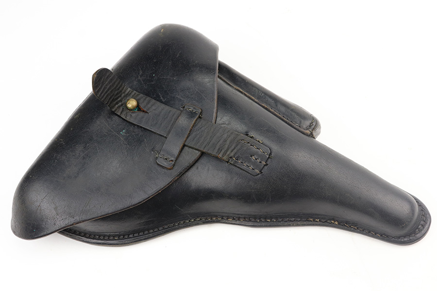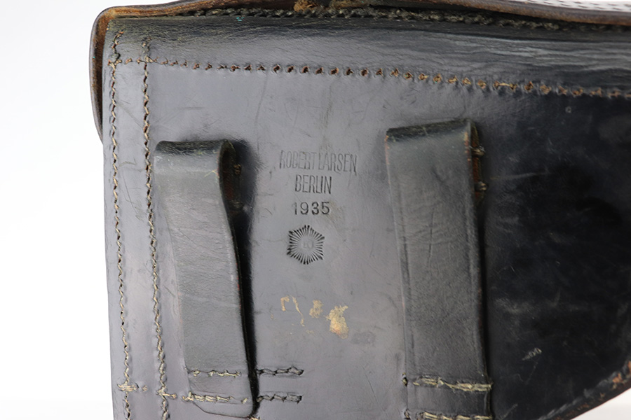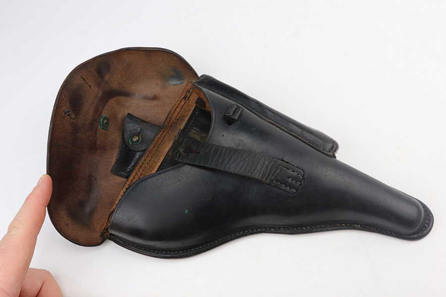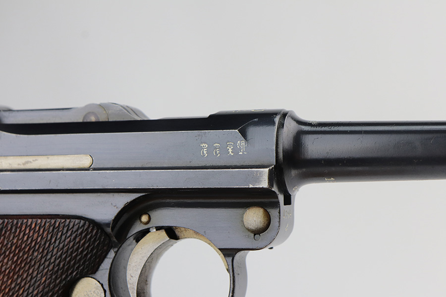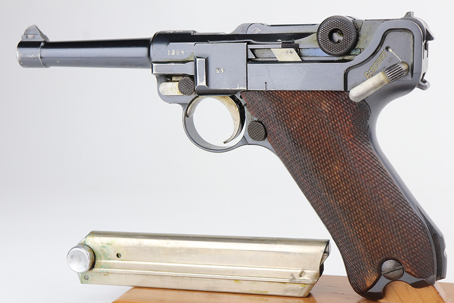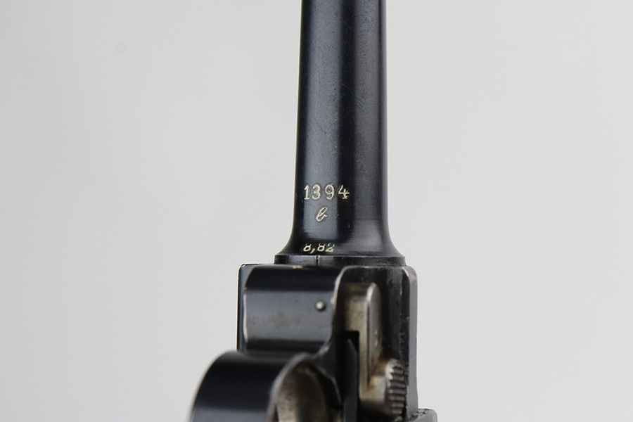 6/9/21 – This is an excellent example of a DWM Luger rig that was initially issued to the Imperial German Army in 1914. It was then reworked after the war and eventually issued to the Nazi police force during WW2. It has a “1920” rework marking on the chamber, an added police sear safety, and a matching WW2-era Armorer’s replacement magazine (numbered at the police arsenal). The gun also comes with a 1935-dated police-style holster – the stitching that holds the top flap on is coming undone. The gun is all matching and has the proper Imperial proofs. It has retained about 97% of its original bluing. There are just hints of wear on the side plate, side rails, and around the muzzle. Very minor pin-pricking on the straps. Comes with excellent original matching grips. Excellent bore – shiny with strong rifling.