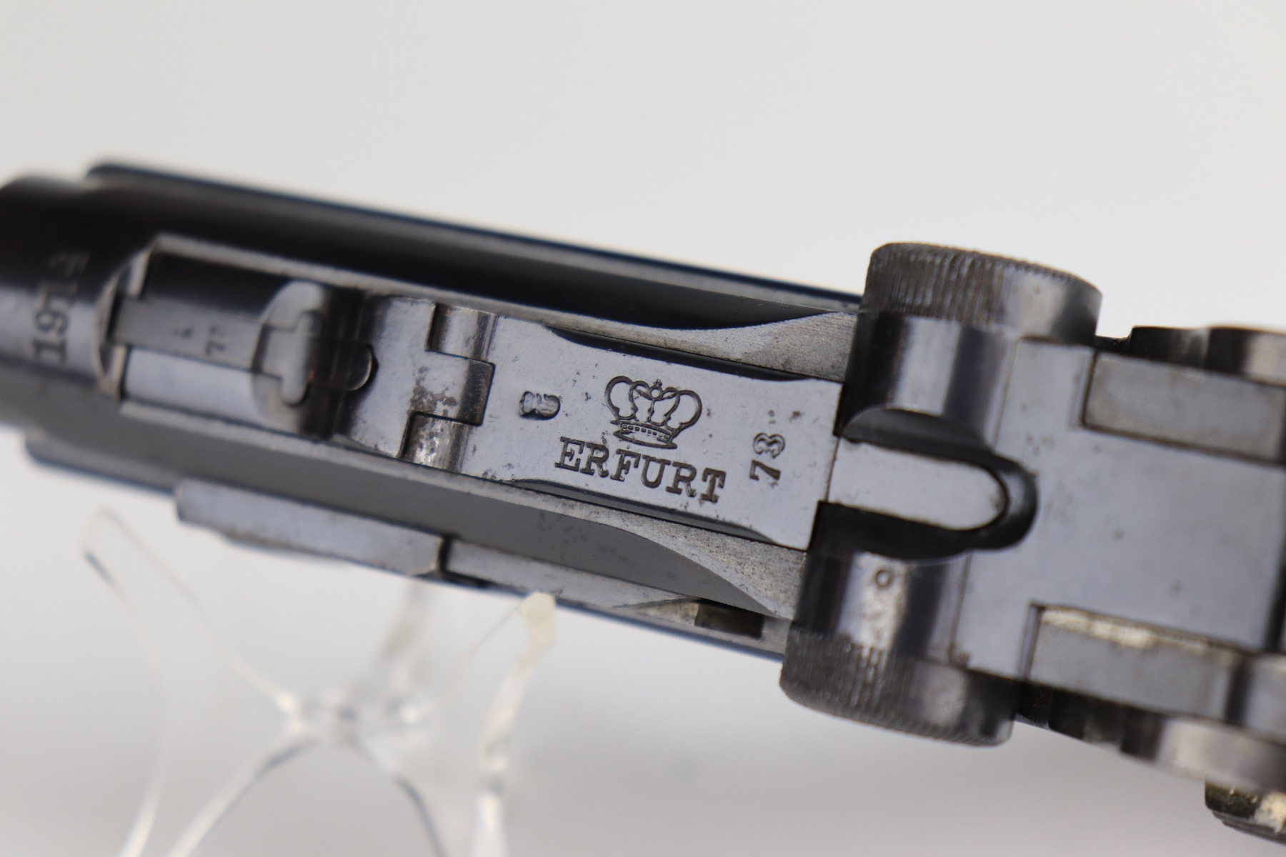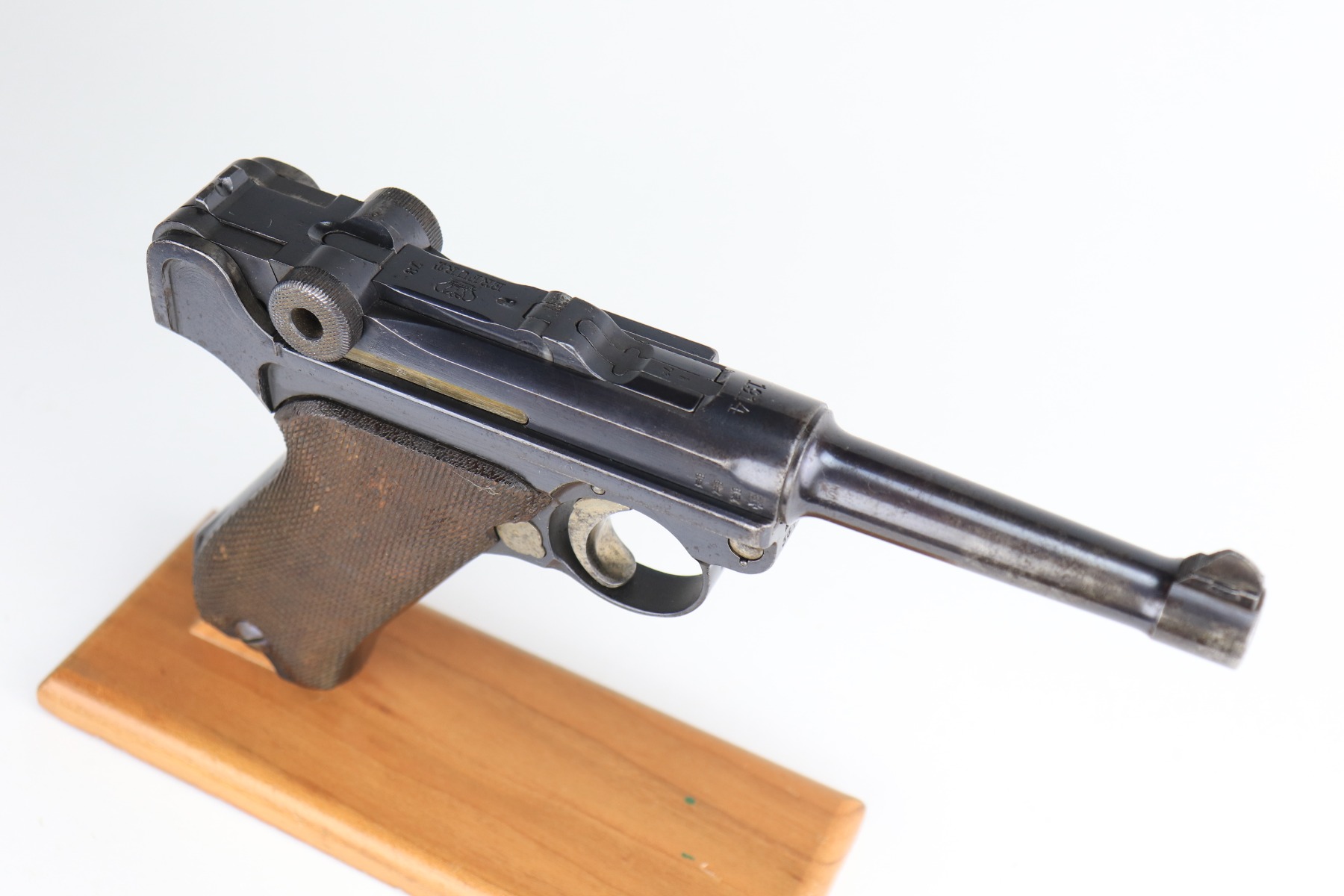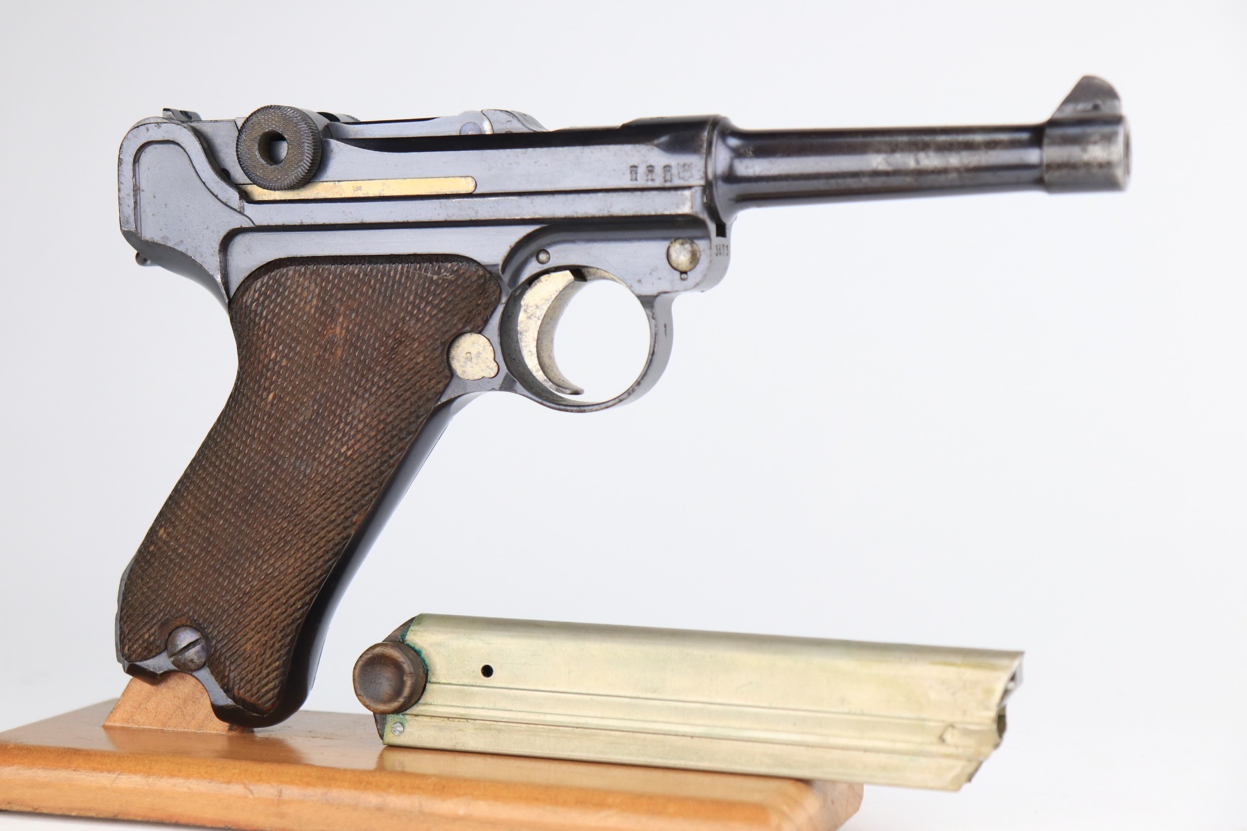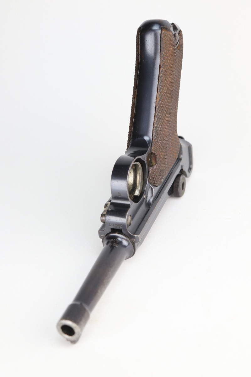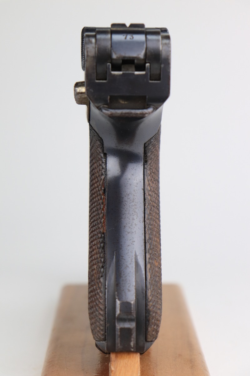 1/8/21 – This is an excellent example of an Erfurt Luger issued to the Imperial German Army in 1914. It is all matching and has the proper Imperial and Erfurt proofs. It has retained about 95% of its original bluing. While there is not much actual finish loss, there is noticeable spotty oxidation throughout. There are areas of minor pitting on the barrel and side plate. Freckling on the straps. There is minor wear around the muzzle, barrel, side plate, and high edges of the frame. It has excellent original matching-numbered grips. It also comes with a mismatched period-correct Erfurt magazine – small crack in the base. The bore is excellent – shiny with strong rifling.