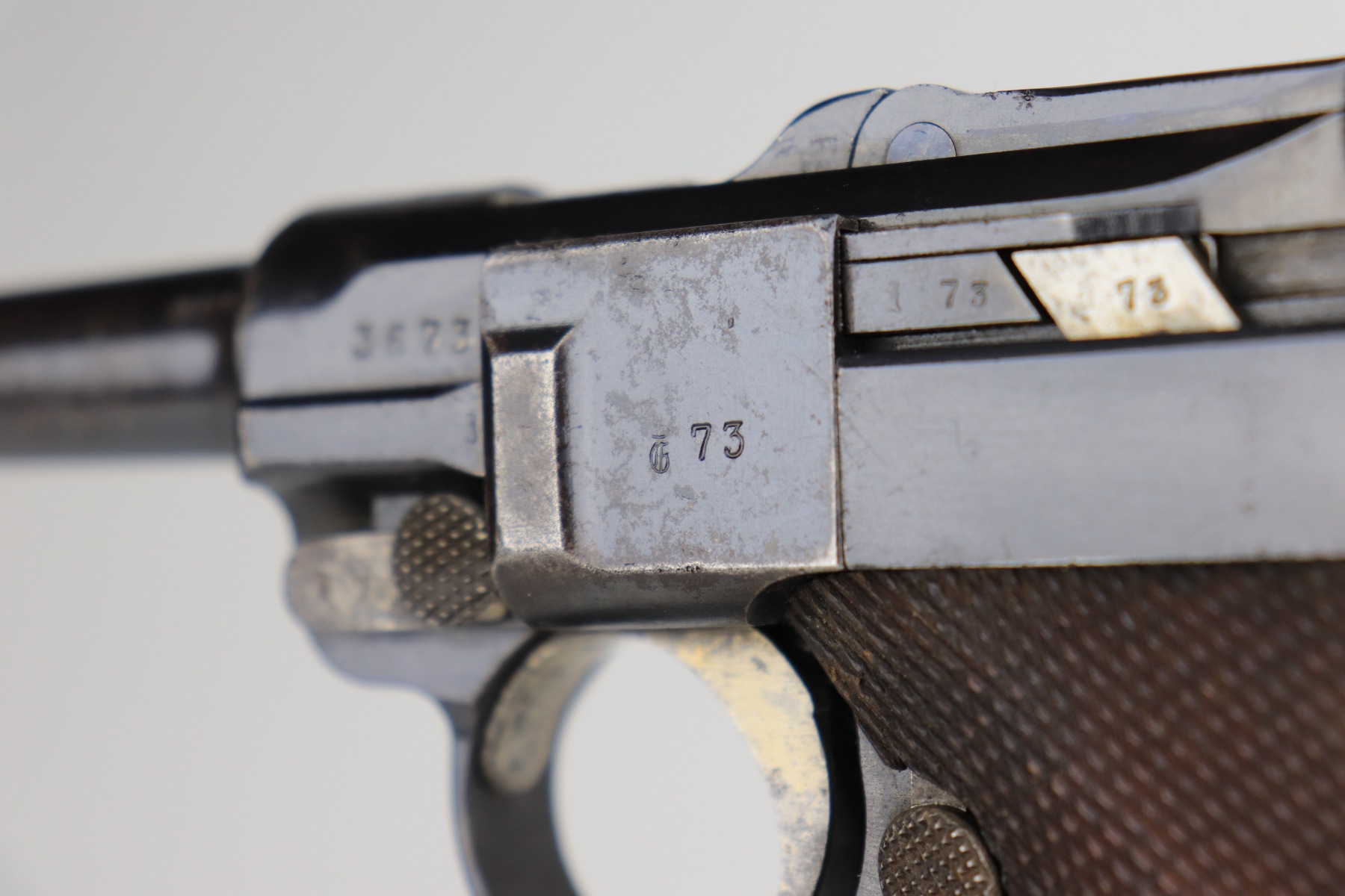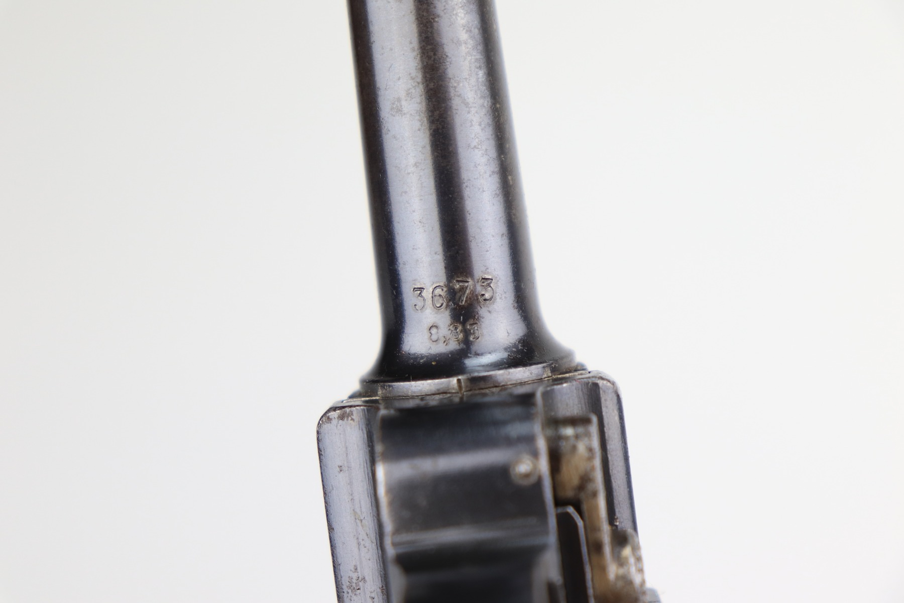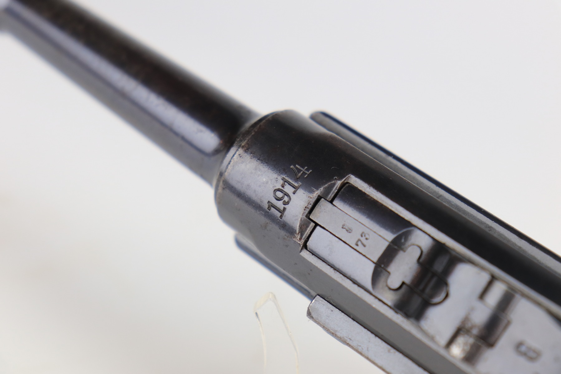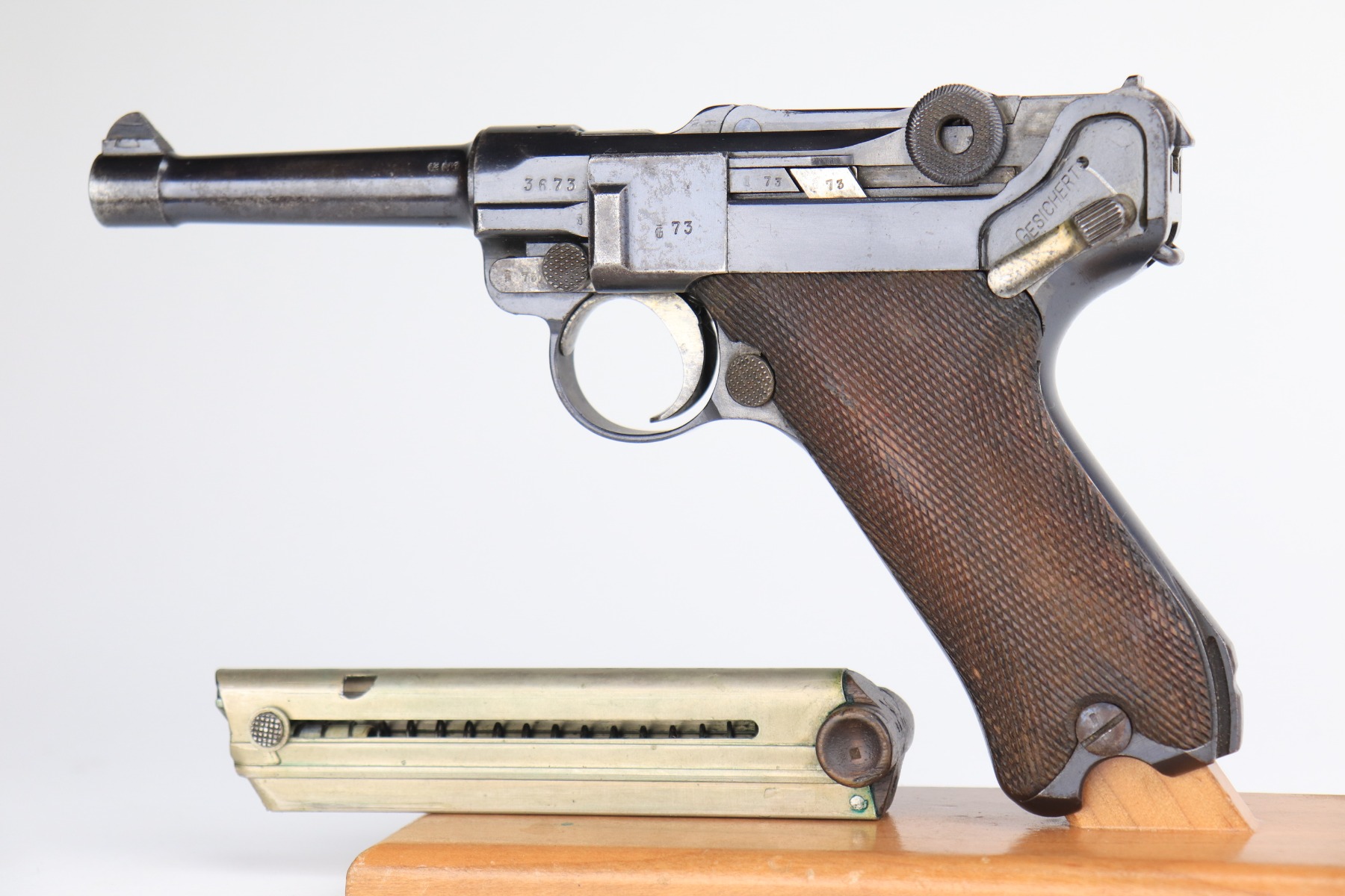 1/8/21 – This is an excellent example of an Erfurt Luger issued to the Imperial German Army in 1914. It is all matching and has the proper Imperial and Erfurt proofs. It has retained about 95% of its original bluing. While there is not much actual finish loss, there is noticeable spotty oxidation throughout. There are areas of minor pitting on the barrel and side plate. Freckling on the straps. There is minor wear around the muzzle, barrel, side plate, and high edges of the frame. It has excellent original matching-numbered grips. It also comes with a mismatched period-correct Erfurt magazine – small crack in the base. The bore is excellent – shiny with strong rifling.