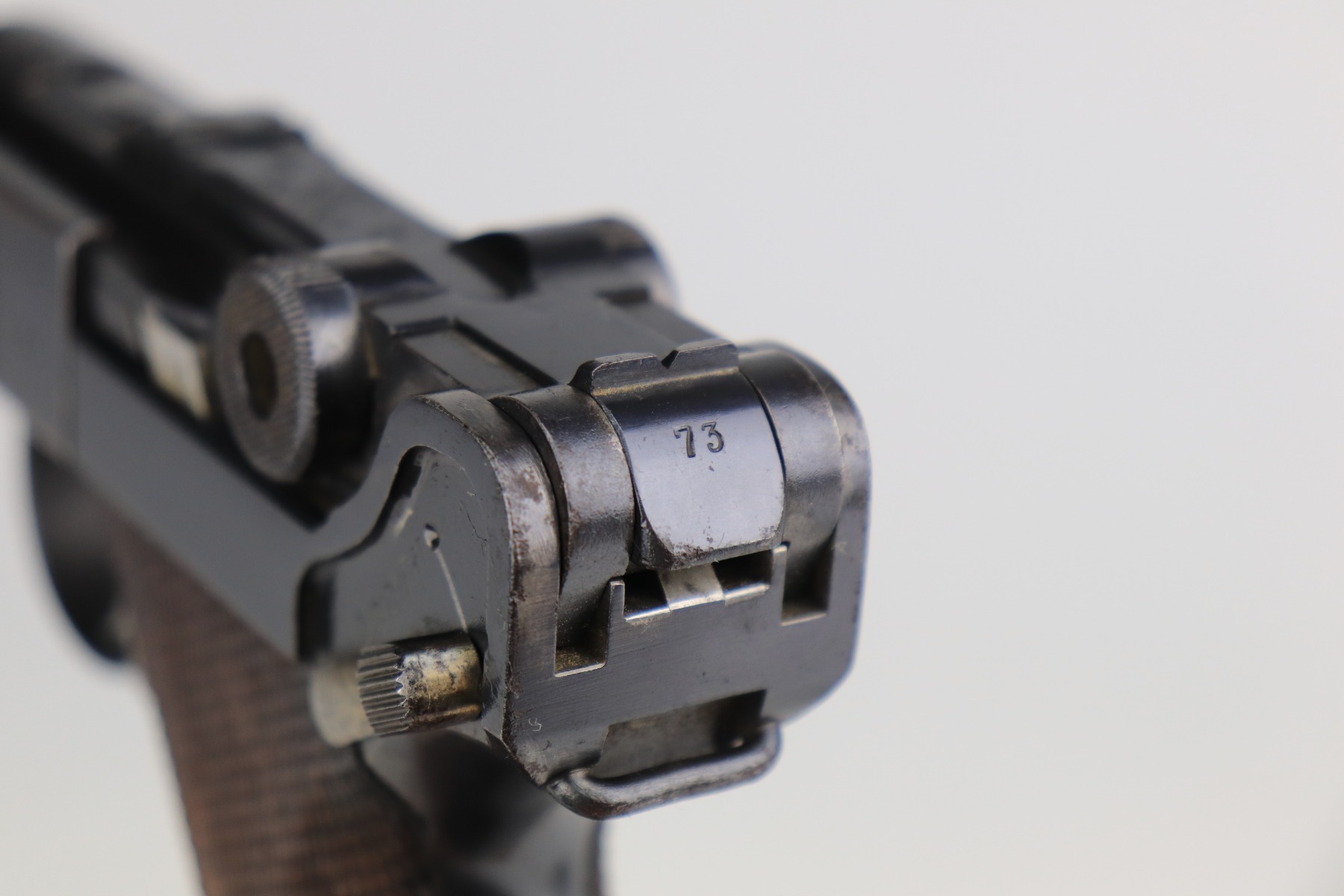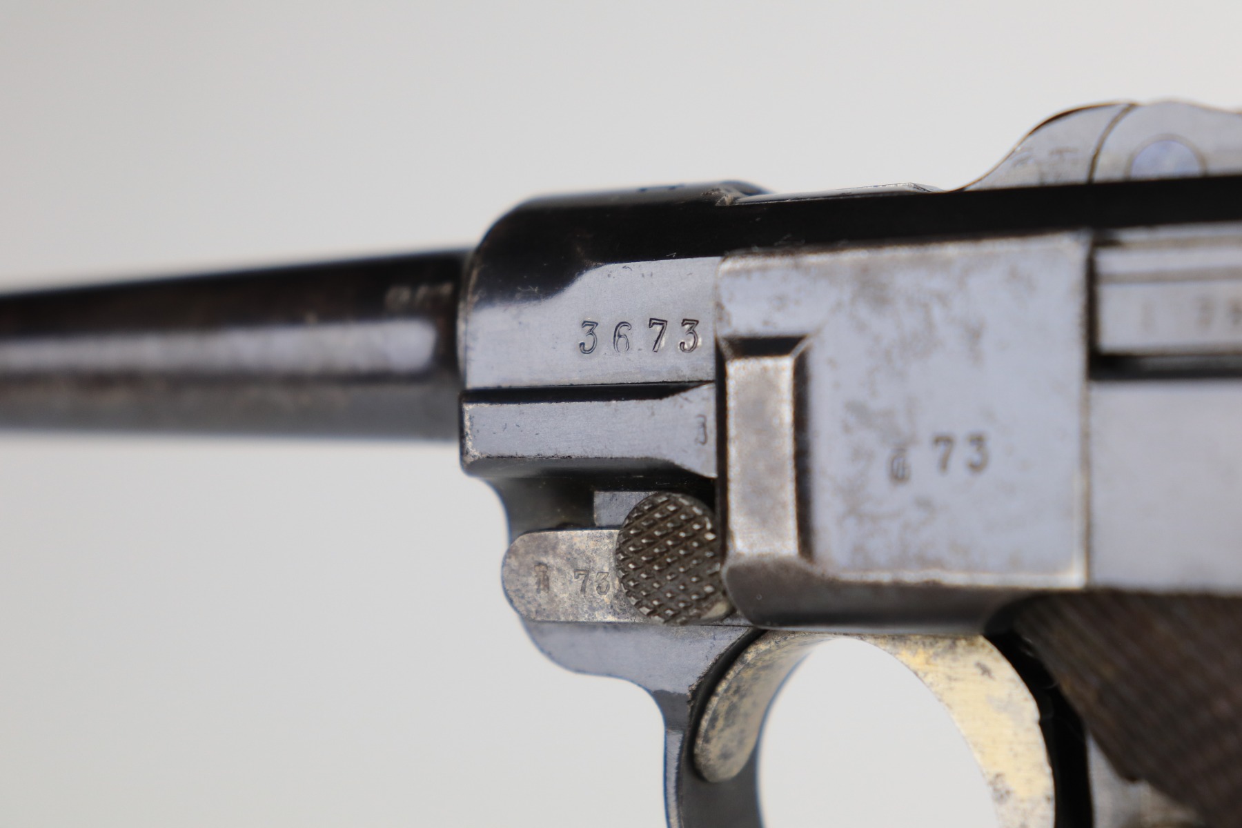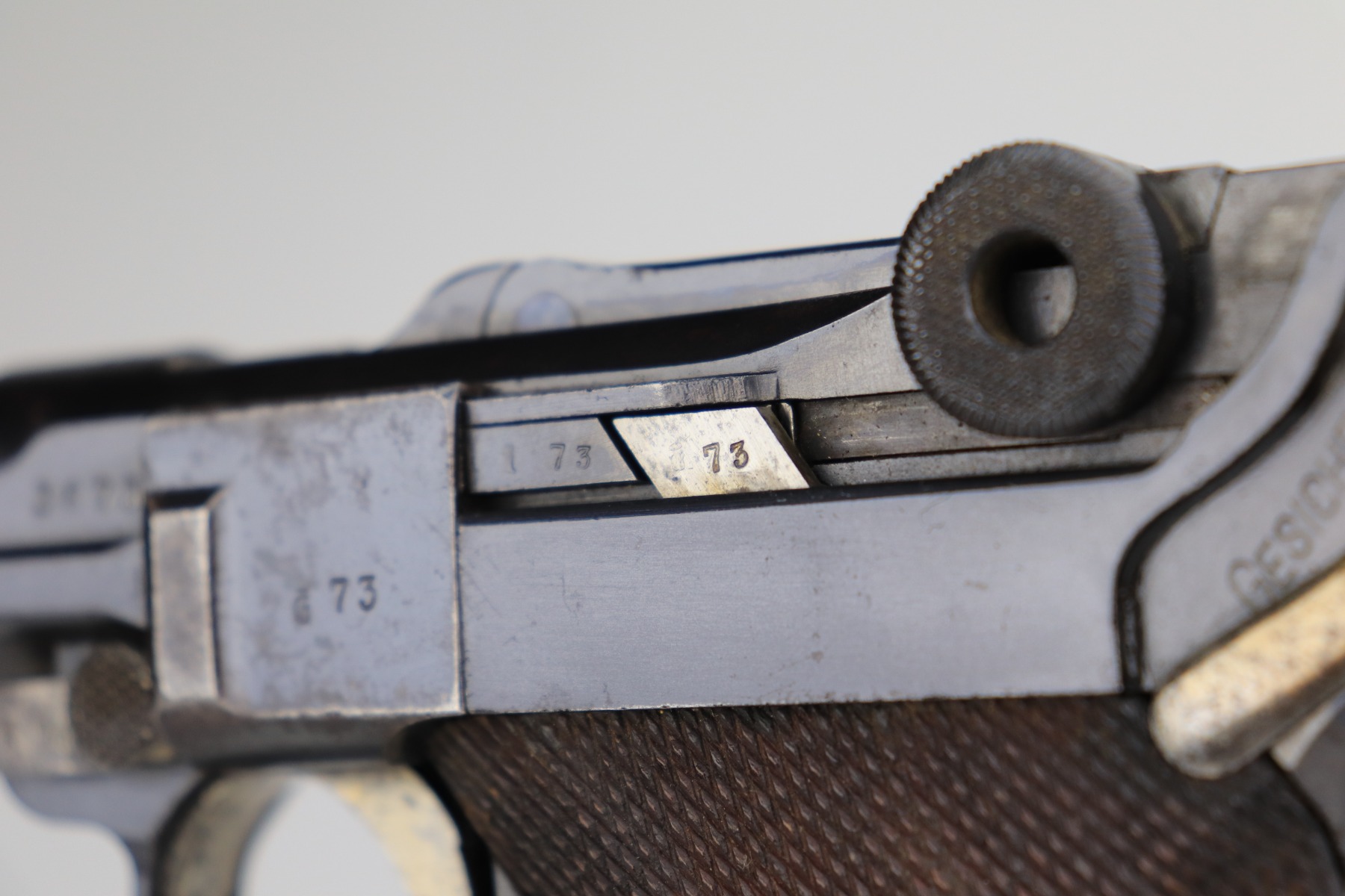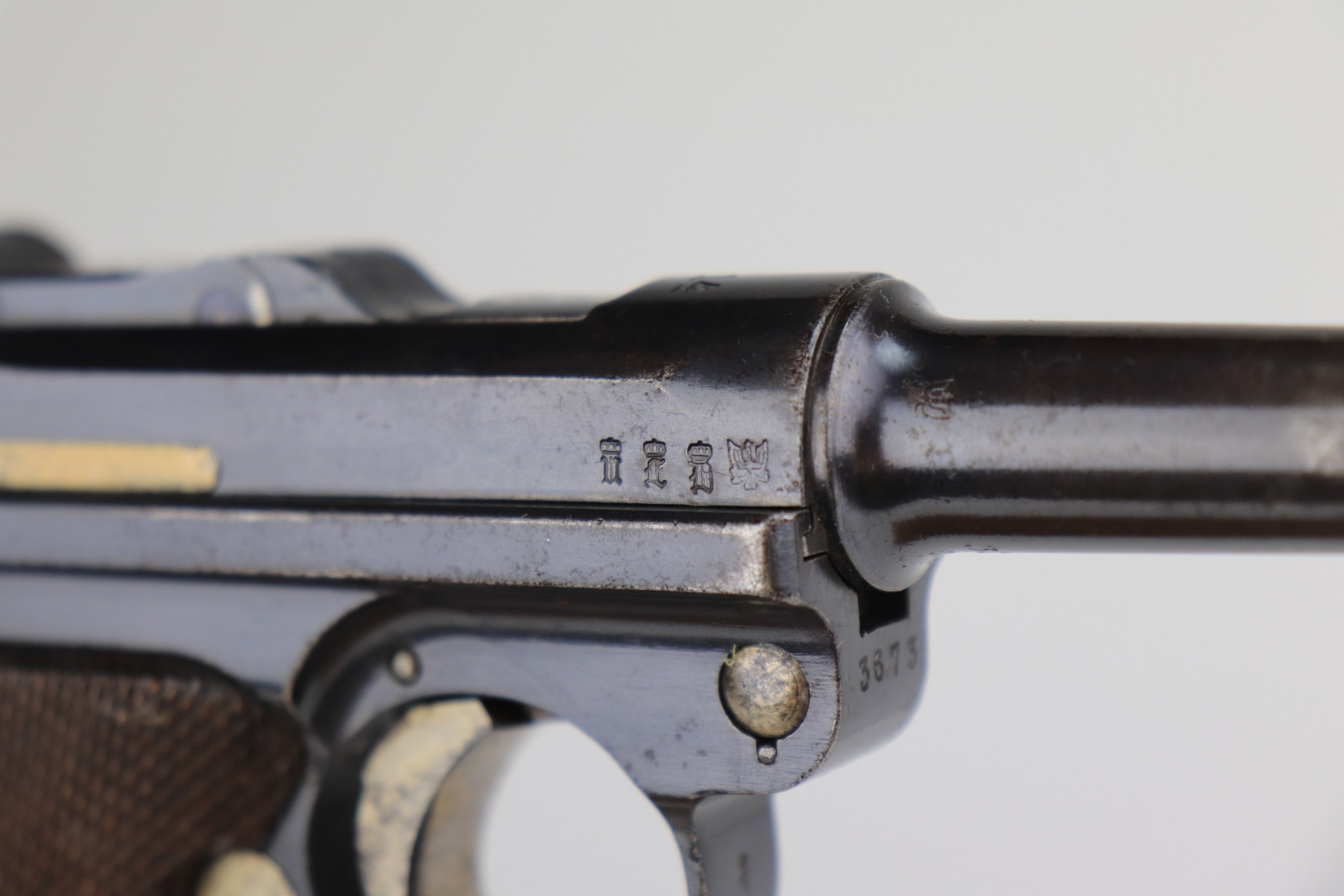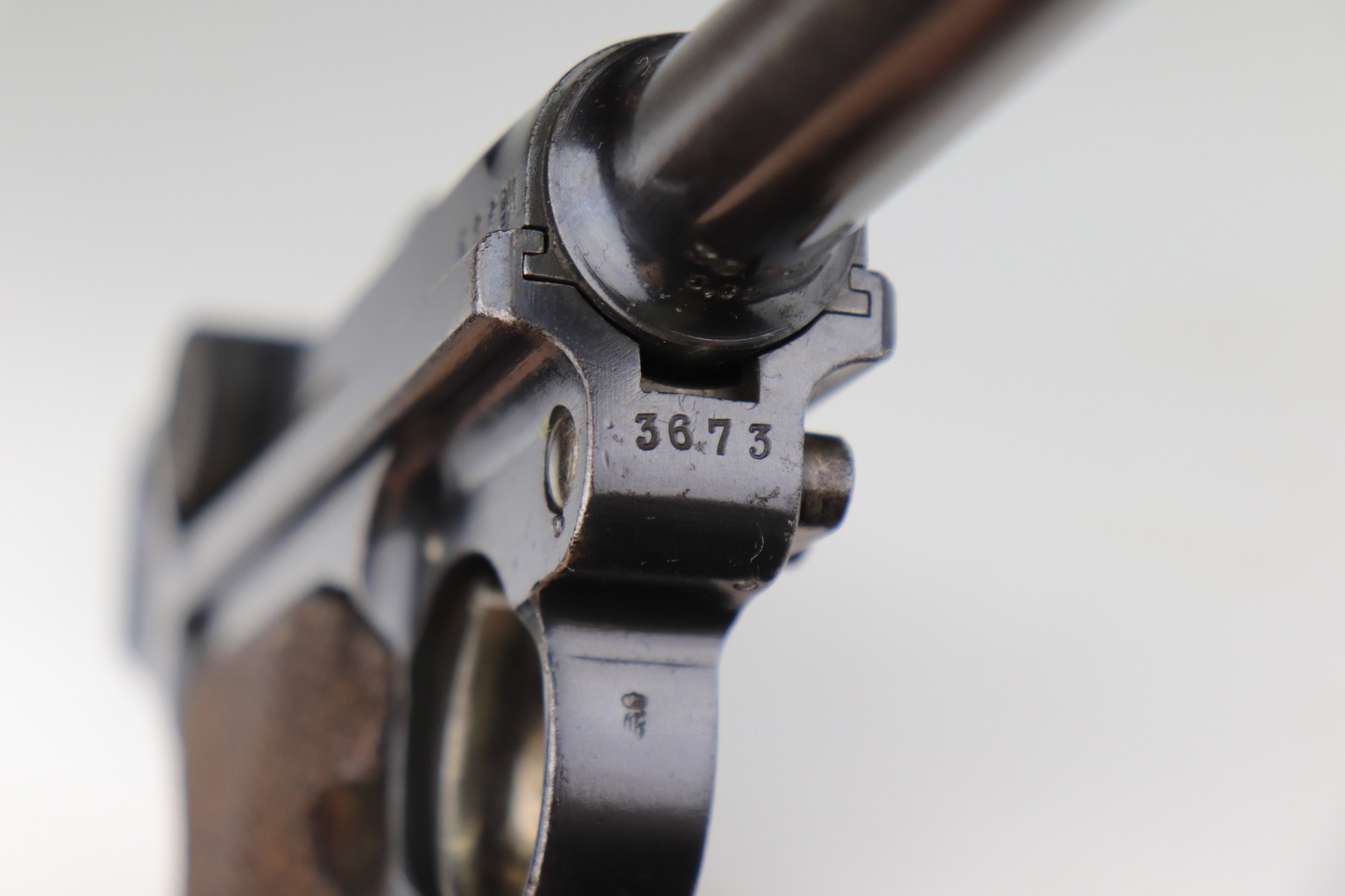 1/8/21 – This is an excellent example of an Erfurt Luger issued to the Imperial German Army in 1914. It is all matching and has the proper Imperial and Erfurt proofs. It has retained about 95% of its original bluing. While there is not much actual finish loss, there is noticeable spotty oxidation throughout. There are areas of minor pitting on the barrel and side plate. Freckling on the straps. There is minor wear around the muzzle, barrel, side plate, and high edges of the frame. It has excellent original matching-numbered grips. It also comes with a mismatched period-correct Erfurt magazine – small crack in the base. The bore is excellent – shiny with strong rifling.