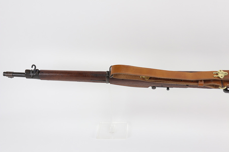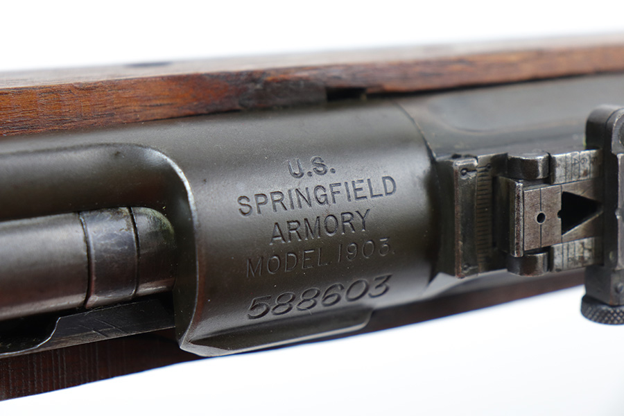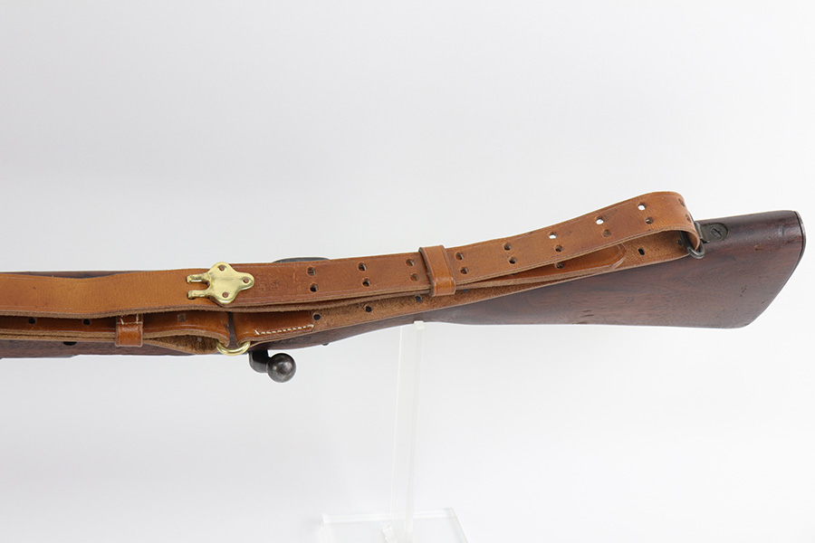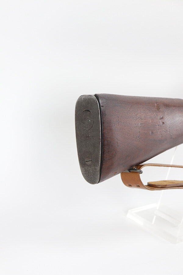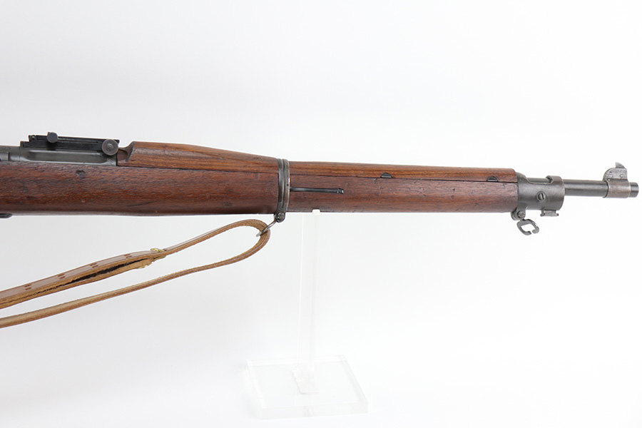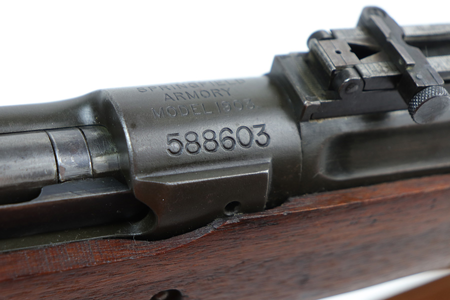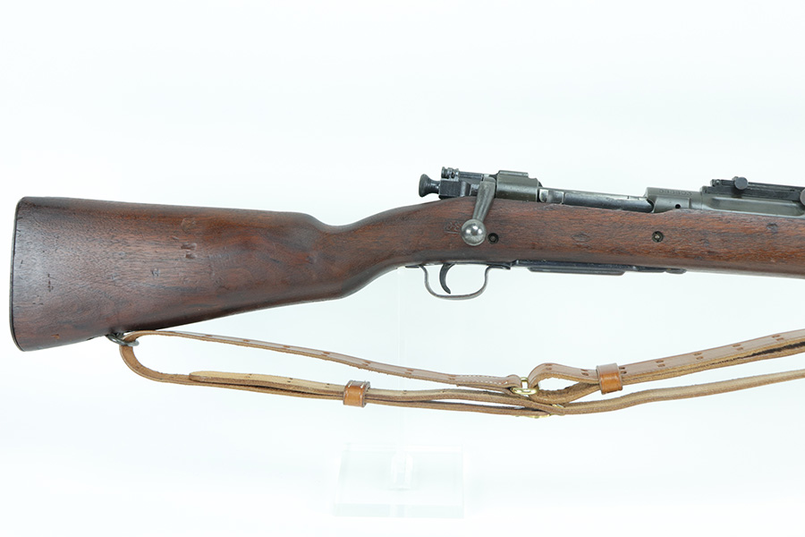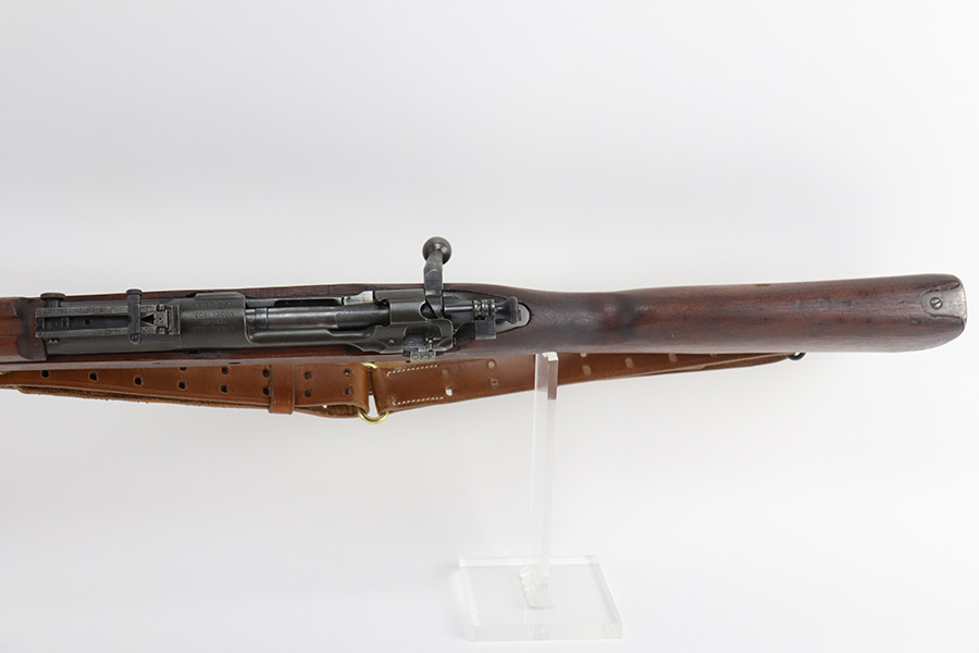 10/20/21 – This is an excellent example of a Springfield Model 1903 Rifle originally issued to the US Military in 1914. There is a “C-SAA” arsenal marking on the right side of the stock indicating this gun was reworked, likely for issue during WW2. That would make sense because the barrel is dated March of 1939. It is also Springfield Armory-marked and has a flaming bomb military proof. There is a “P” on the wrist of the stock. Comes with a reproduction 1917-dated leather sling. The gun has retained most of its parkerized finish. There is minor wear around the high edges of the receiver and spotty/scratchy wear on the front sight, front barrel band, floor plate, and trigger group. Spotty oxidation in the same areas and on the barrel. The stock is nice with some noticeable dings here and there, an area of scratching on the underside about halfway down the gun, and a light streak of white paint on the left side of the butt stock. The bore has decent rifling with minor pin-pricking throughout.