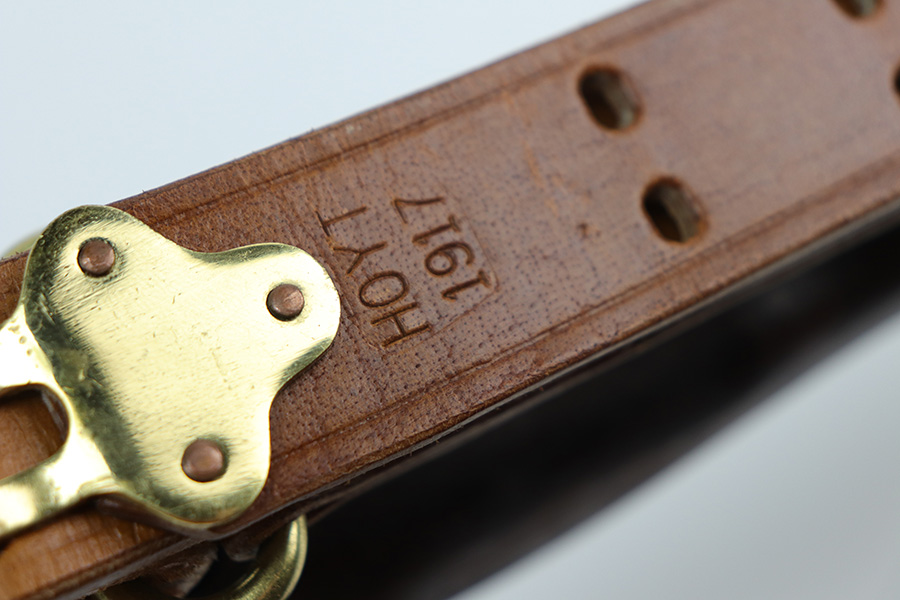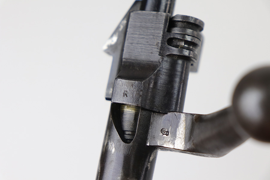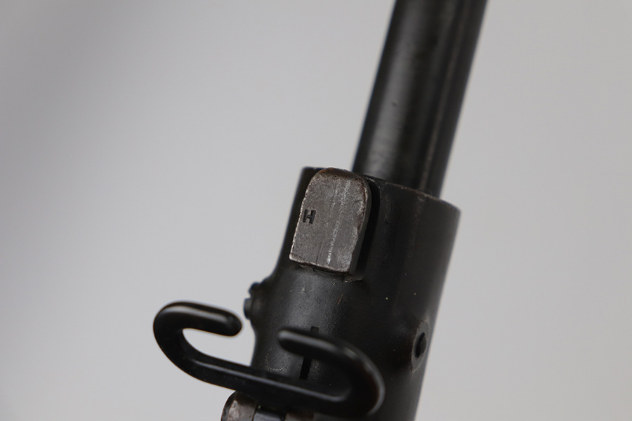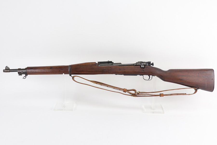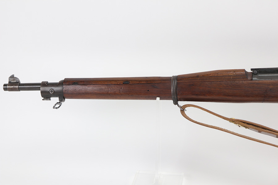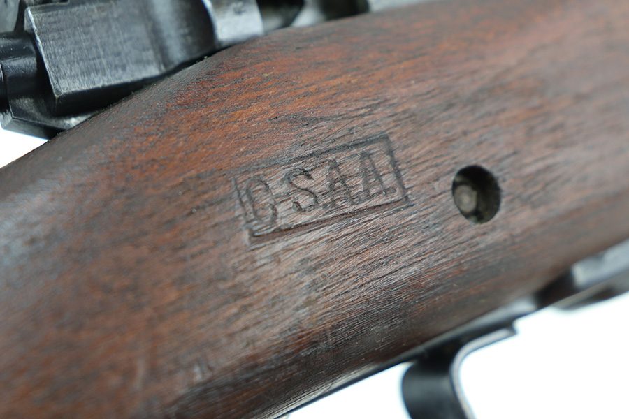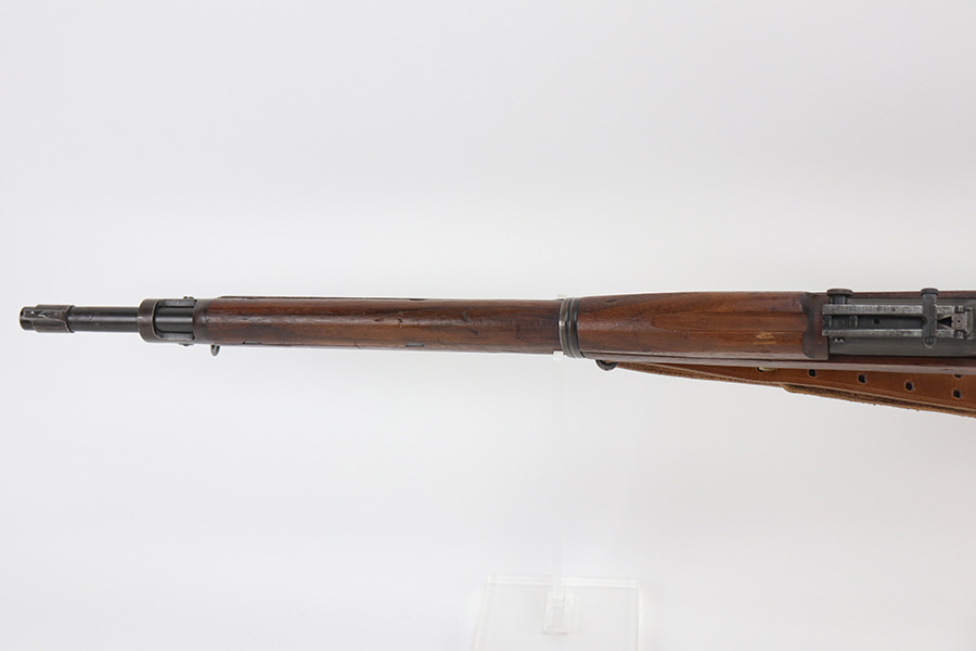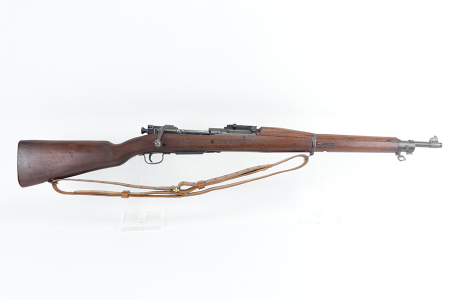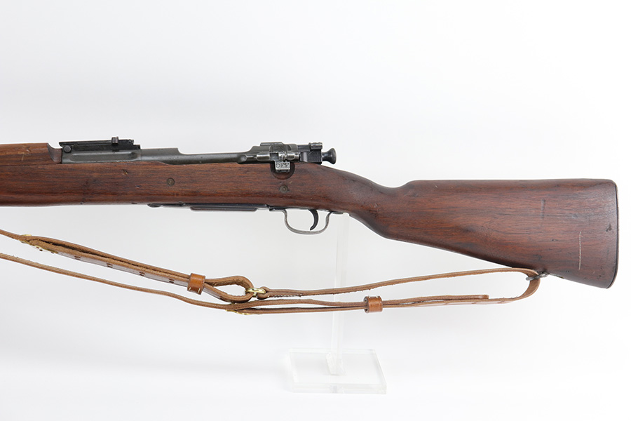10/20/21 – This is an excellent example of a Springfield Model 1903 Rifle originally issued to the US Military in 1914. There is a “C-SAA” arsenal marking on the right side of the stock indicating this gun was reworked, likely for issue during WW2. That would make sense because the barrel is dated March of 1939. It is also Springfield Armory-marked and has a flaming bomb military proof. There is a “P” on the wrist of the stock. Comes with a reproduction 1917-dated leather sling. The gun has retained most of its parkerized finish. There is minor wear around the high edges of the receiver and spotty/scratchy wear on the front sight, front barrel band, floor plate, and trigger group. Spotty oxidation in the same areas and on the barrel. The stock is nice with some noticeable dings here and there, an area of scratching on the underside about halfway down the gun, and a light streak of white paint on the left side of the butt stock. The bore has decent rifling with minor pin-pricking throughout.