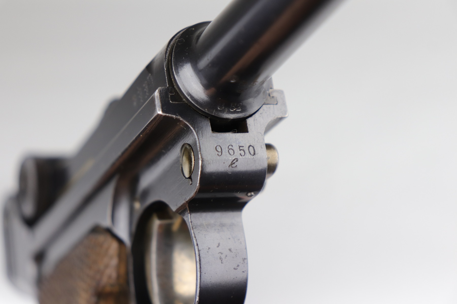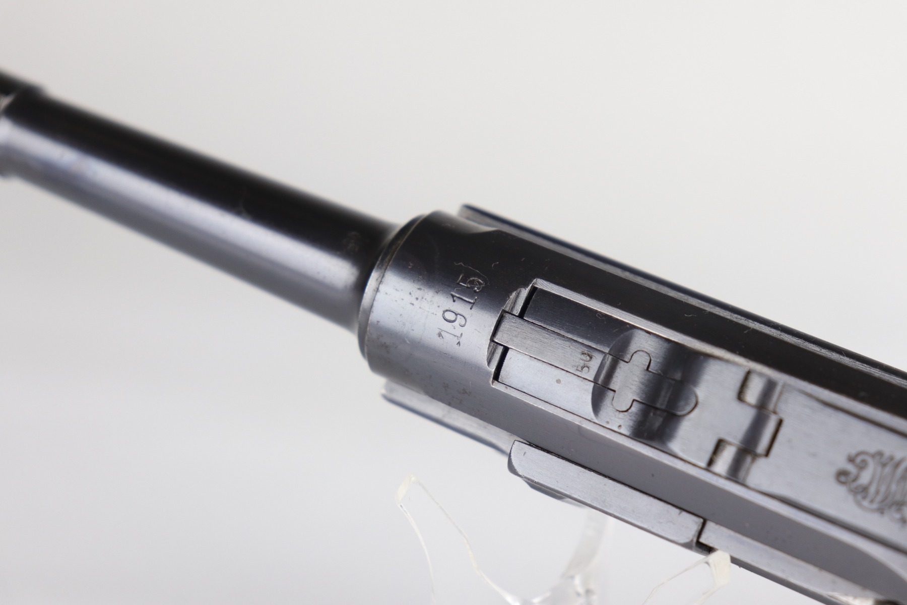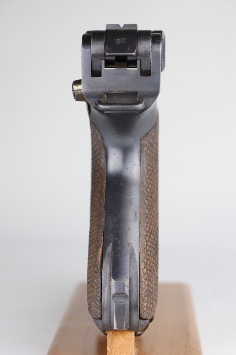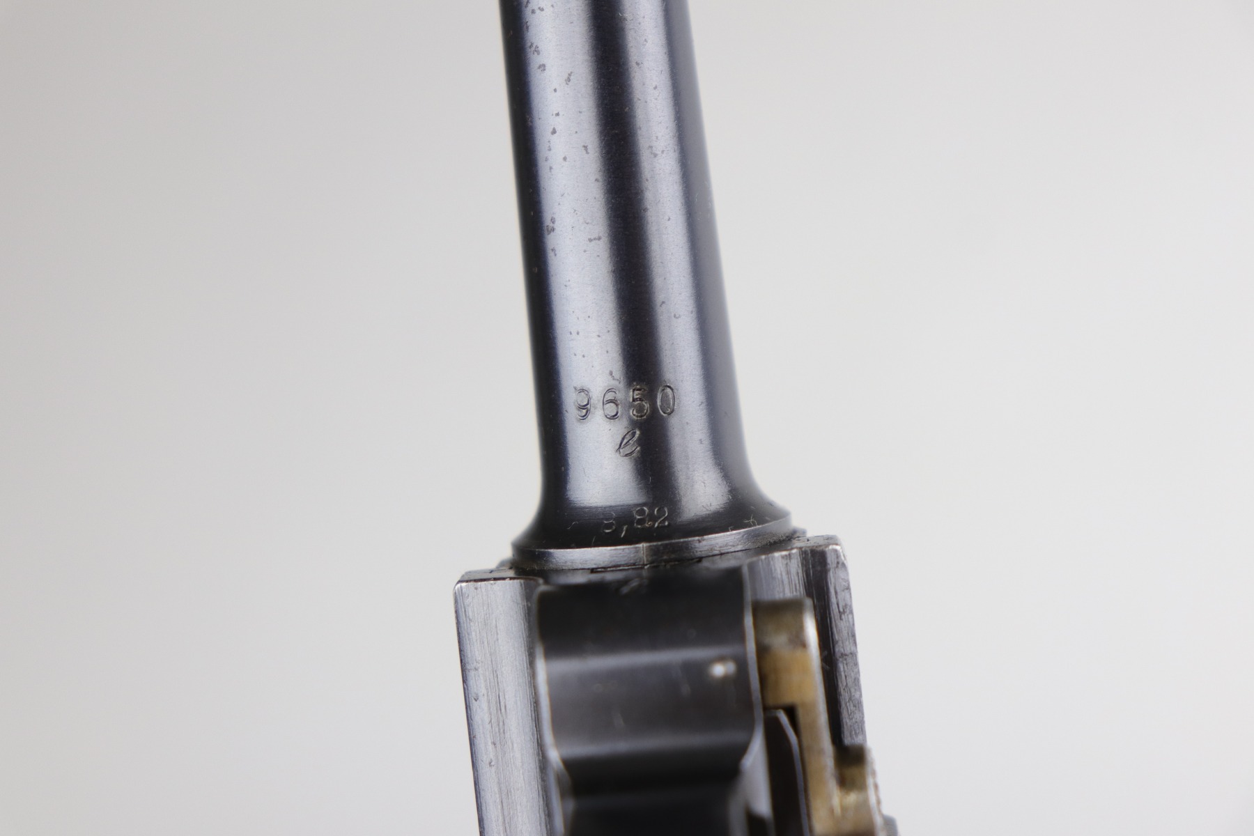 7/28/20 – This is an excellent WW1 Luger manufactured in 1915. It has German imperial military proofs on the right side of the slide. It is all matching. Overall, it is in excellent condition, retaining about 97-98% of its original finish. There is very little actual finish loss. There is very minor muzzle and high edge wear on the side plate. There is minor freckling here and there, especially on the straps. Most of the original strawed finish is in tact on the small parts. Excellent wood grips. Comes with an imperial-marked, unnumbered magazine. The bore is excellent – shiny with very strong rifling.