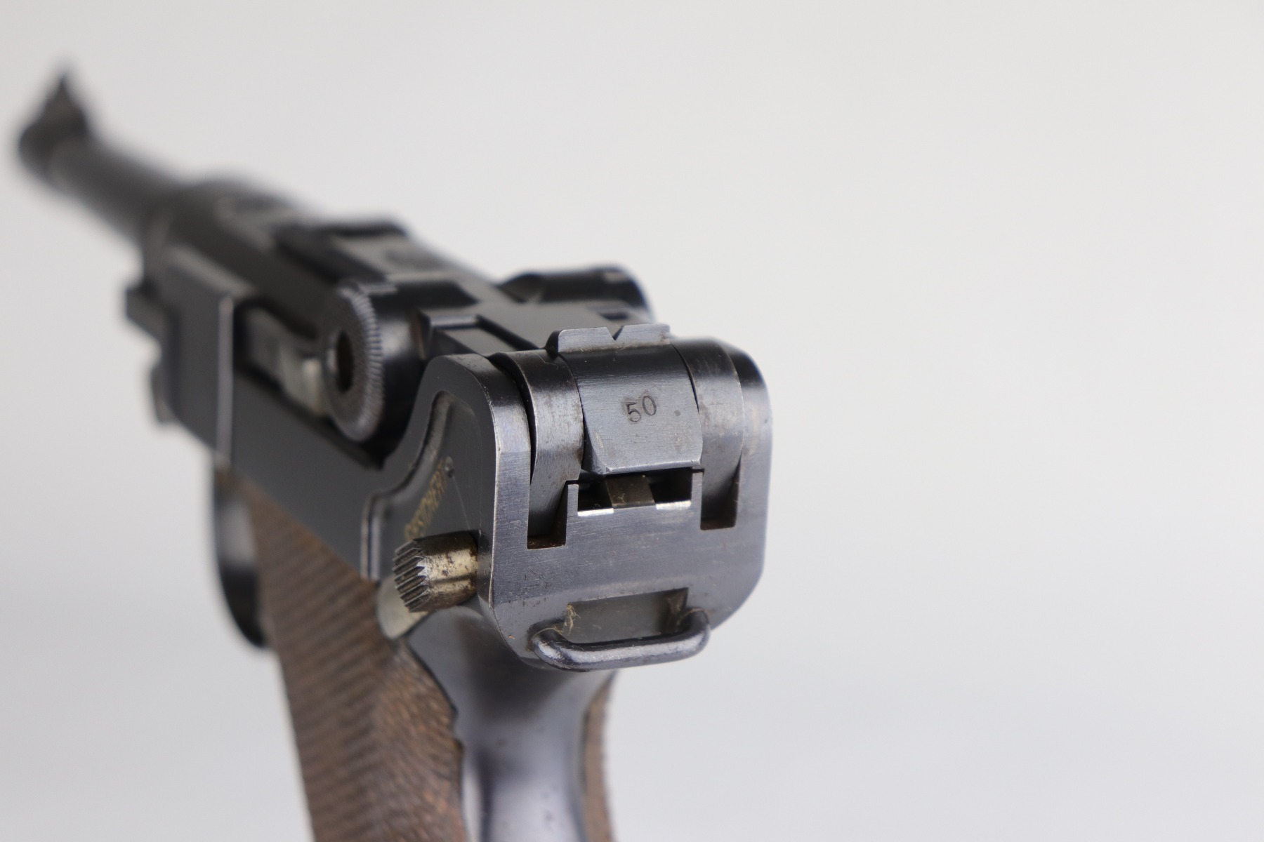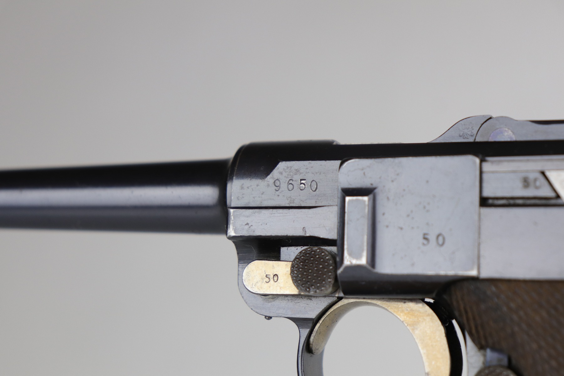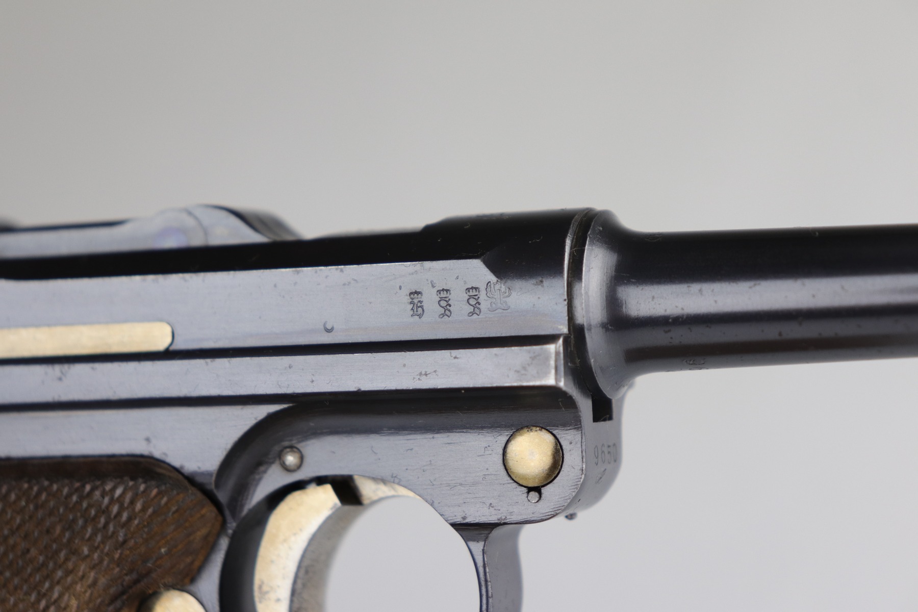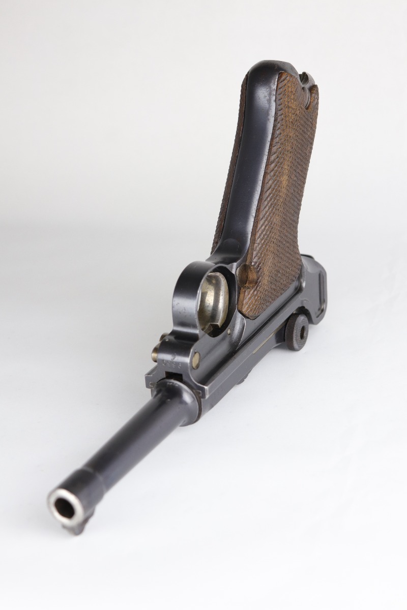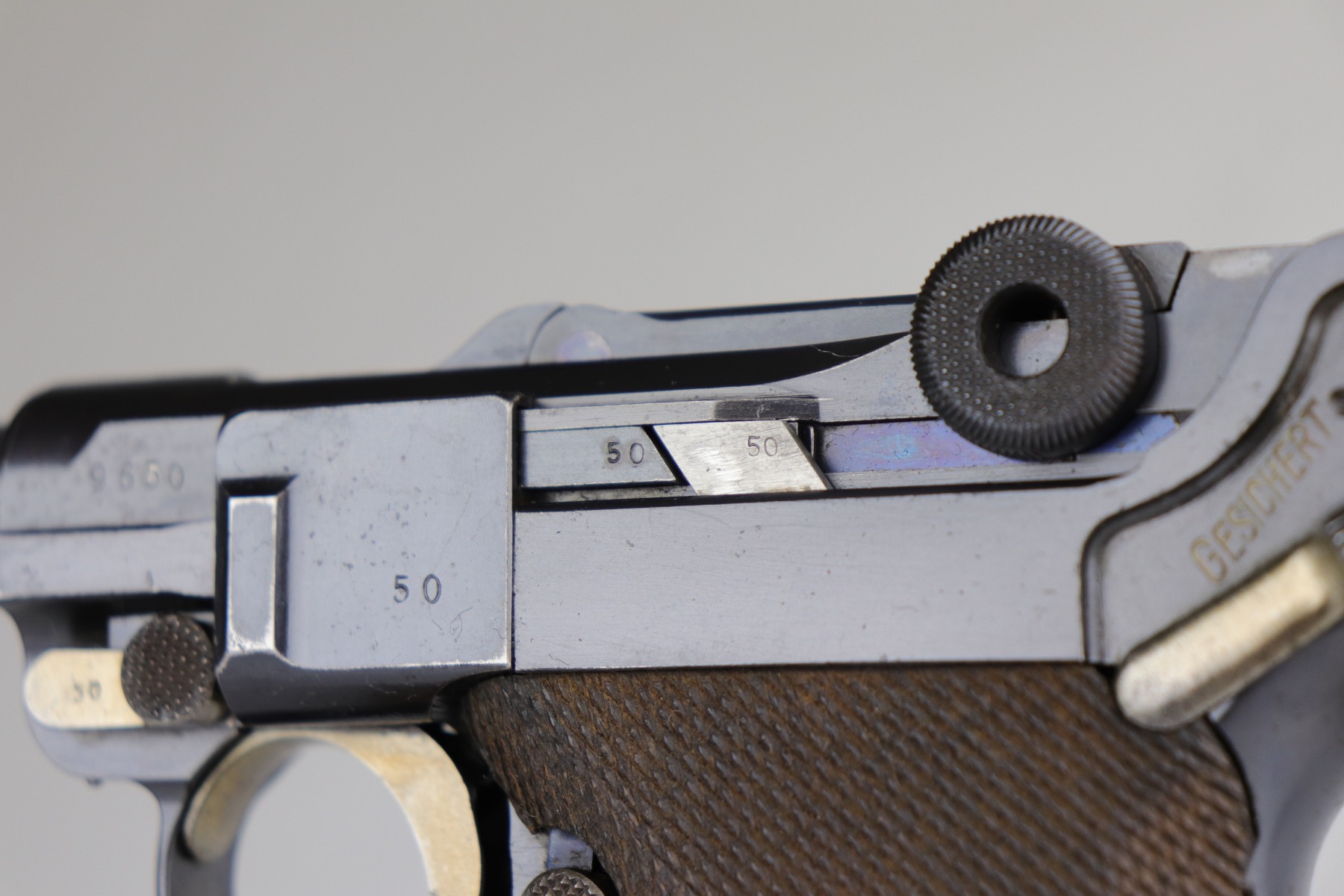 7/28/20 – This is an excellent WW1 Luger manufactured in 1915. It has German imperial military proofs on the right side of the slide. It is all matching. Overall, it is in excellent condition, retaining about 97-98% of its original finish. There is very little actual finish loss. There is very minor muzzle and high edge wear on the side plate. There is minor freckling here and there, especially on the straps. Most of the original strawed finish is in tact on the small parts. Excellent wood grips. Comes with an imperial-marked, unnumbered magazine. The bore is excellent – shiny with very strong rifling.