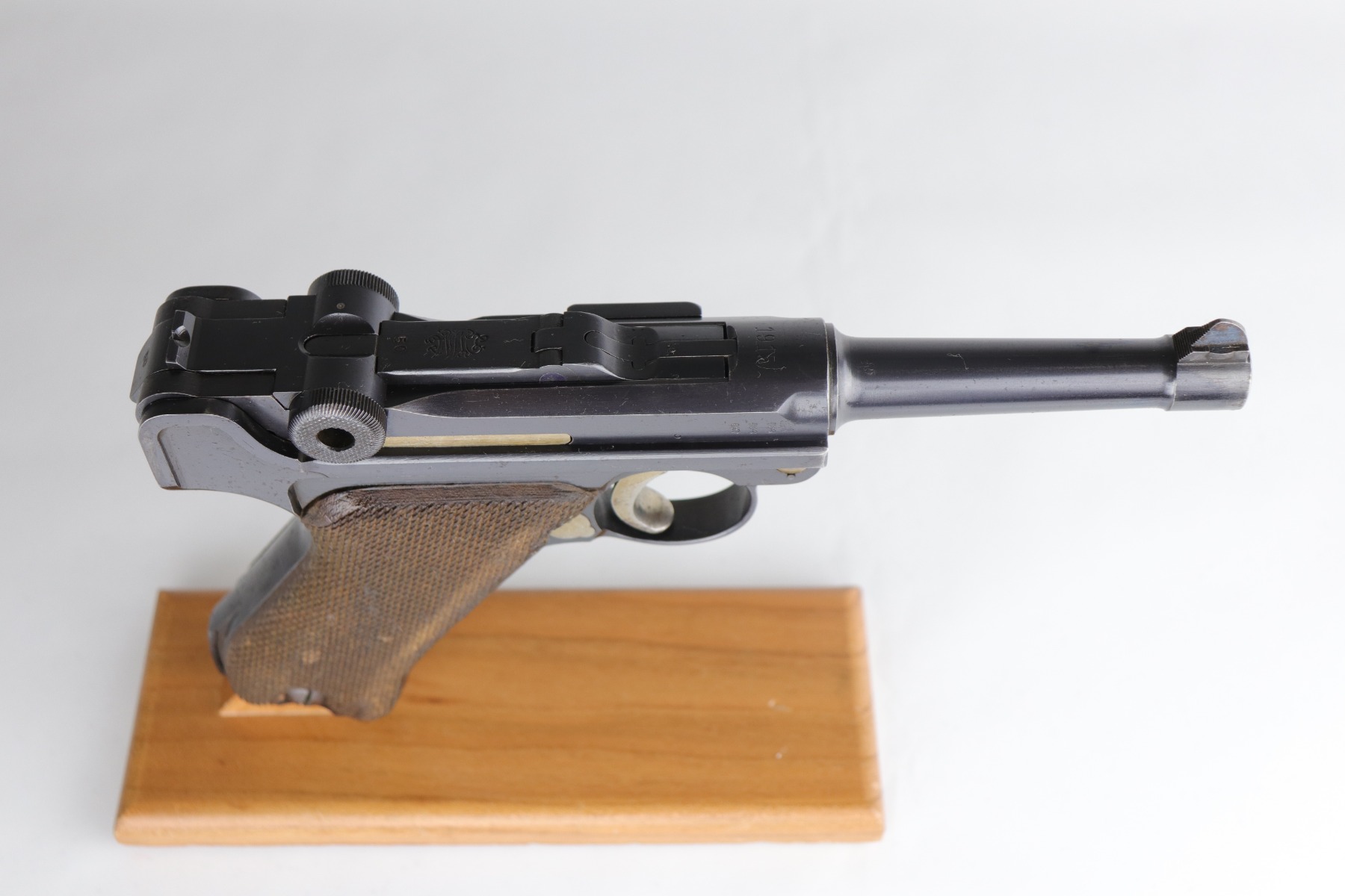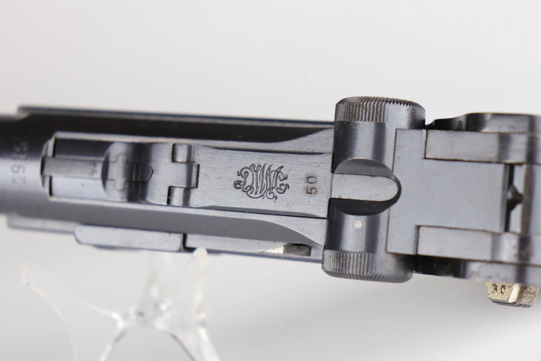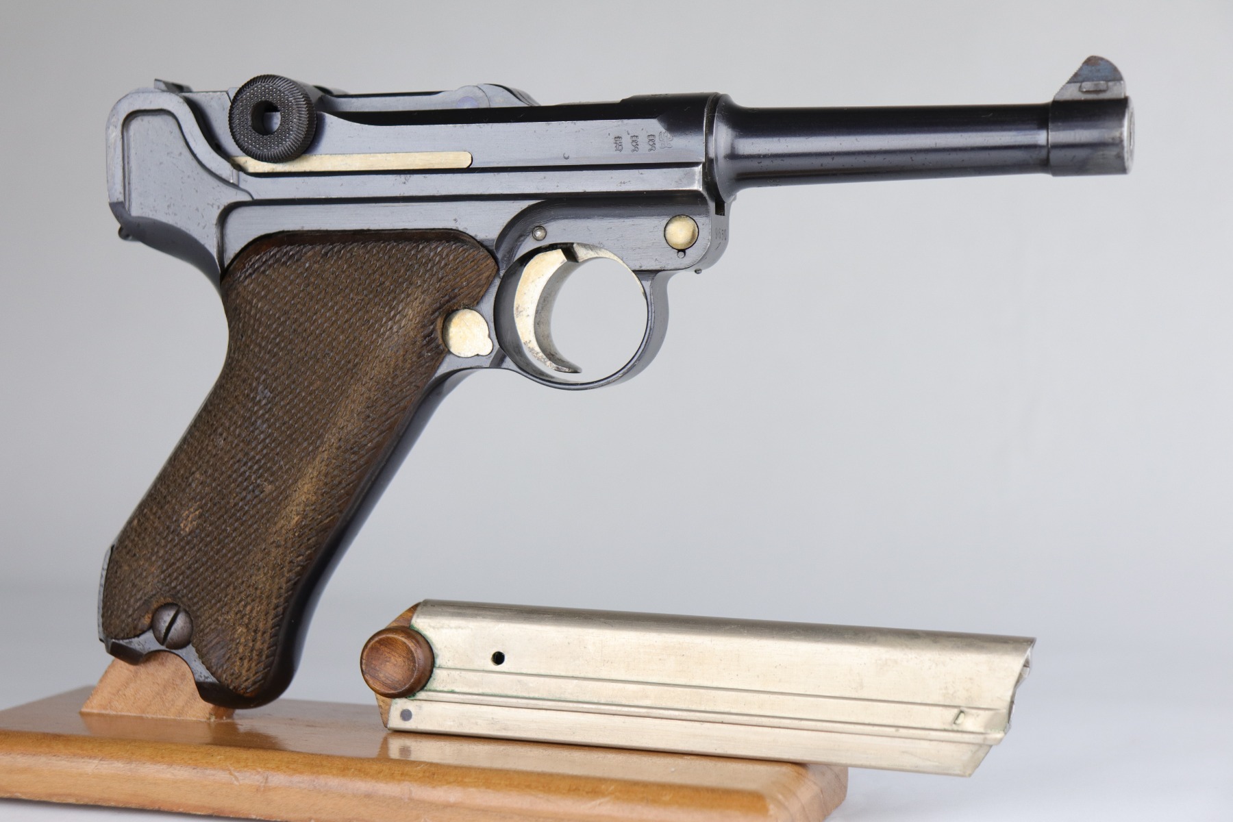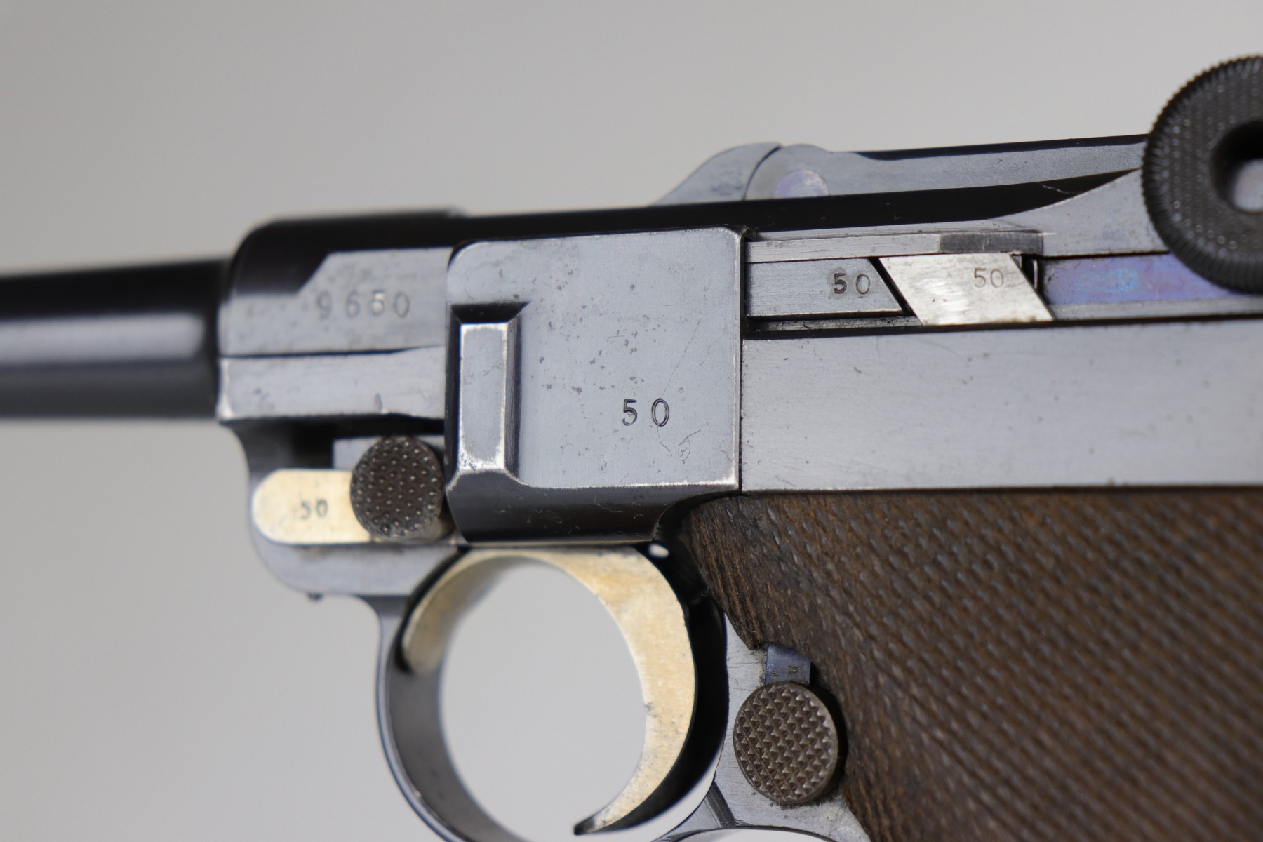 7/28/20 – This is an excellent WW1 Luger manufactured in 1915. It has German imperial military proofs on the right side of the slide. It is all matching. Overall, it is in excellent condition, retaining about 97-98% of its original finish. There is very little actual finish loss. There is very minor muzzle and high edge wear on the side plate. There is minor freckling here and there, especially on the straps. Most of the original strawed finish is in tact on the small parts. Excellent wood grips. Comes with an imperial-marked, unnumbered magazine. The bore is excellent – shiny with very strong rifling.