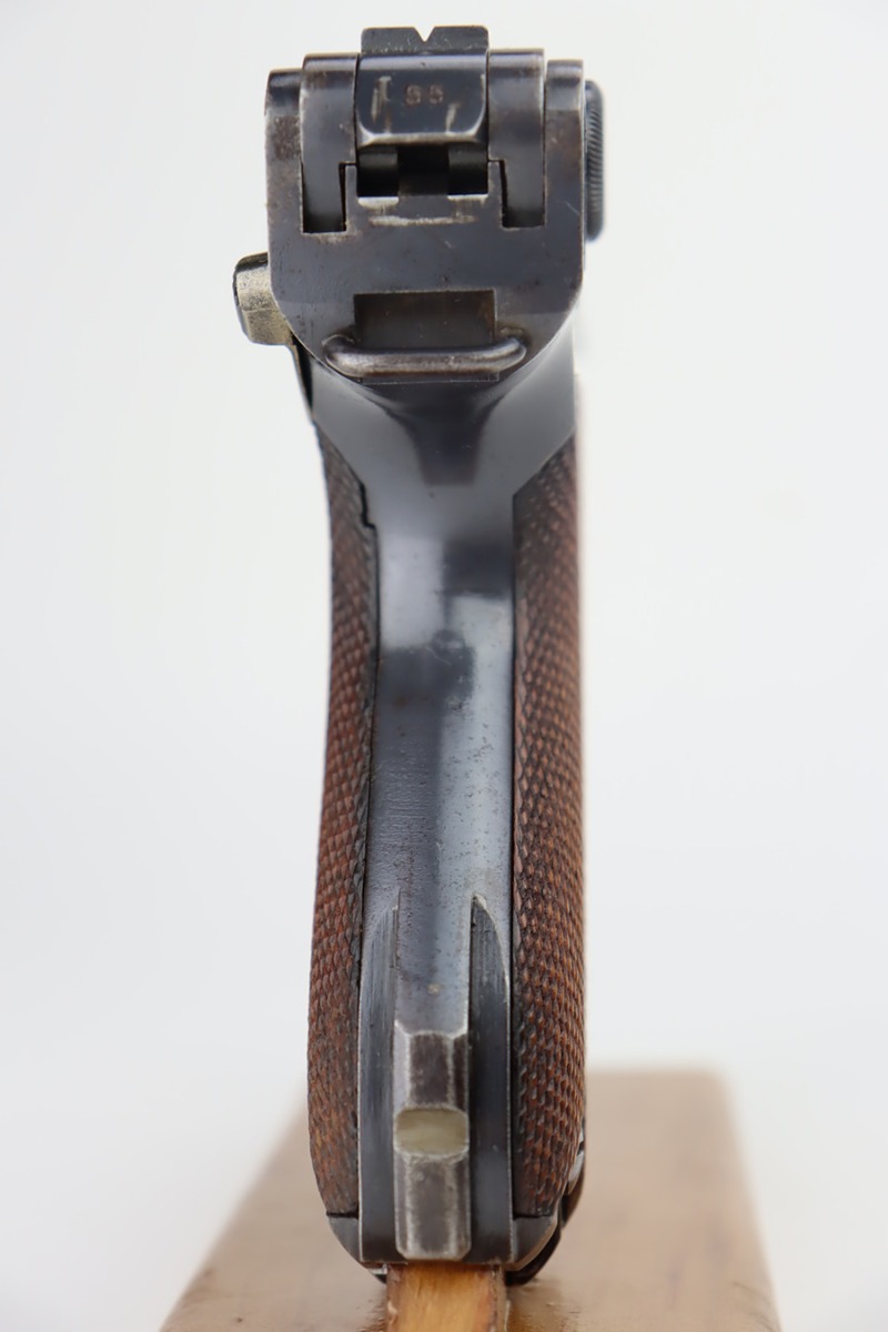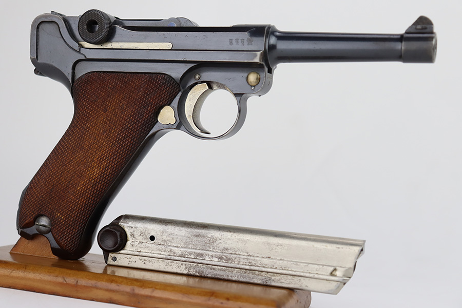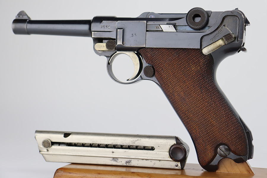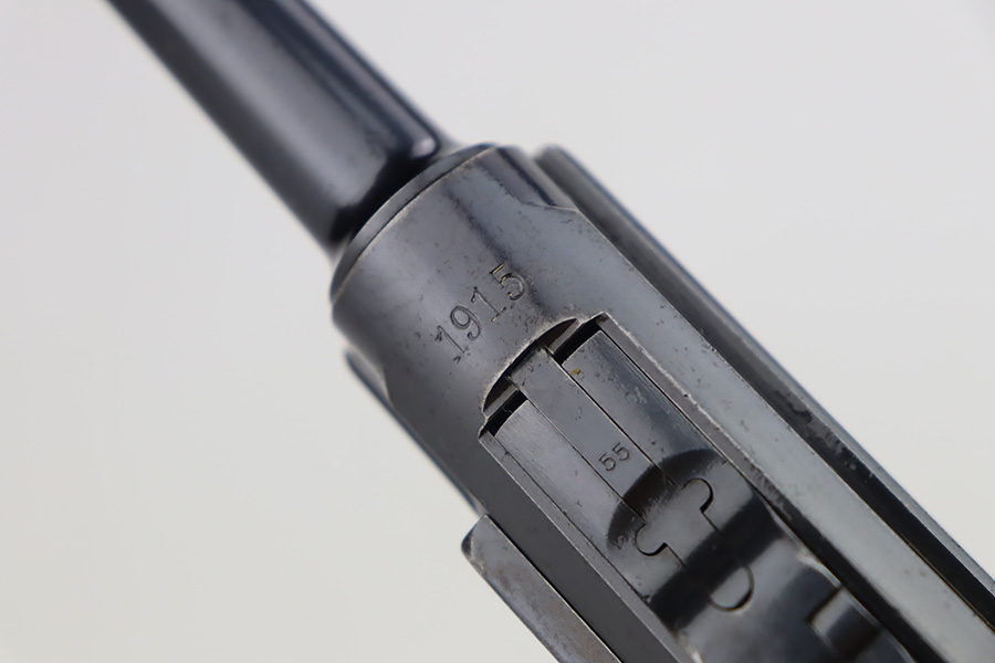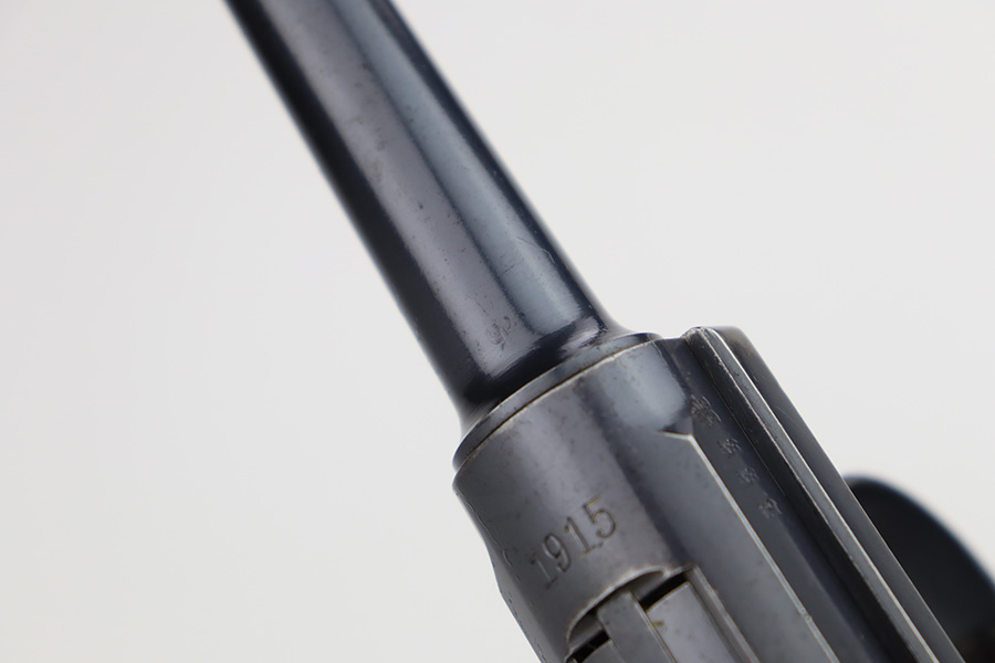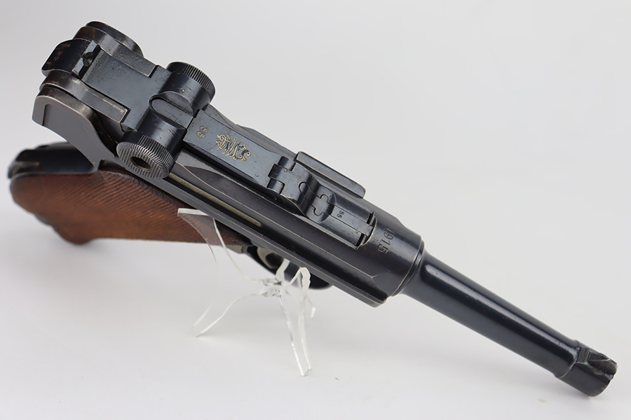 11/1/23 – This is an excellent DWM Luger issued to the Imperial German military in 1915. All matching with the proper Imperial military proofs. It has retained about 96% of its original finish. Just minor wear around the muzzle and on some of the high edges. Some freckling on the grip straps. Fitted with minty matching-numbered wood grips. Comes with a period-correct but mismatched magazine. The rifling in the bore is fairly worn with minor pitting throughout.