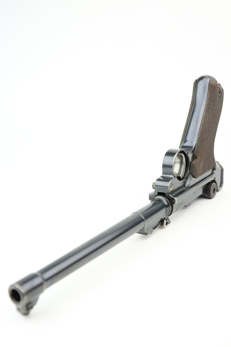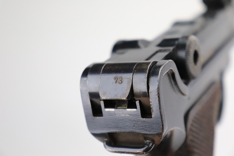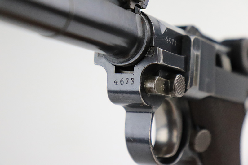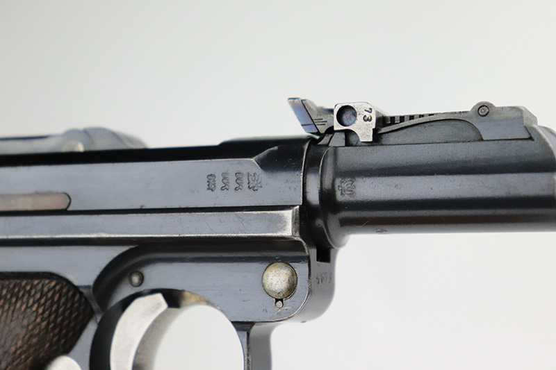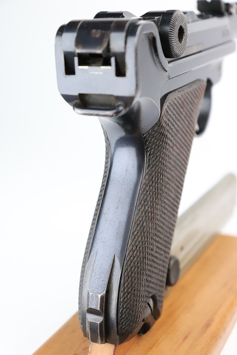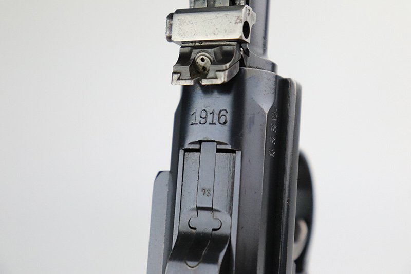 9/6/22 – This is an excellent example of an original military DWM Artillery Luger from 1916. All matching numbers throughout aside from the magazine, and including the grips. It retains about 94-95% of the original blue, with most of the wear on the muzzle, sideplate and bottom of the front strap. Strong bore with minor frost in the grooves. The straw has worn off the small parts unfortunately, so they appear more like bare metal. The grips are in great shape with no cracks or chips, but a patch of smoothing on the right panel. Very nice magazine that’s mismatched but period original.