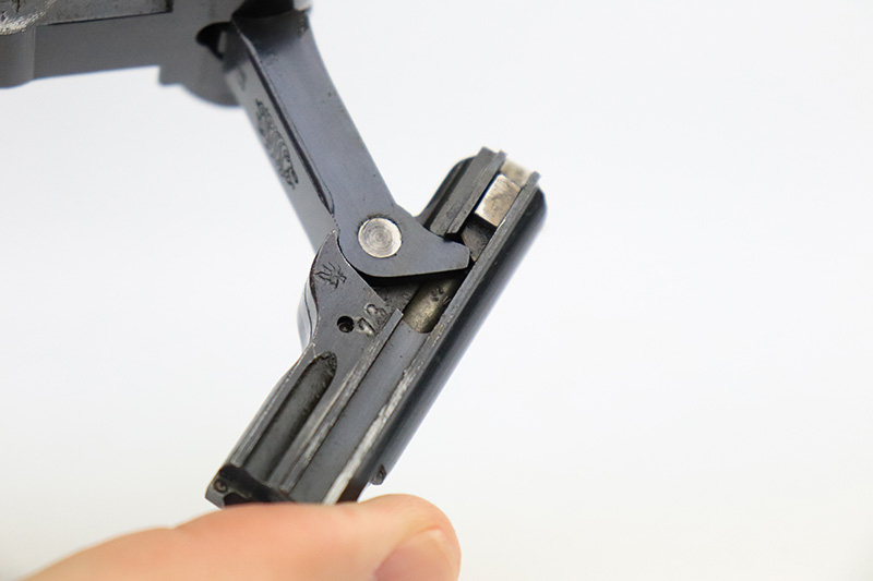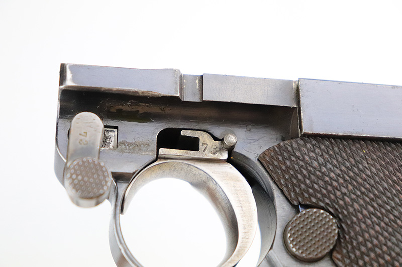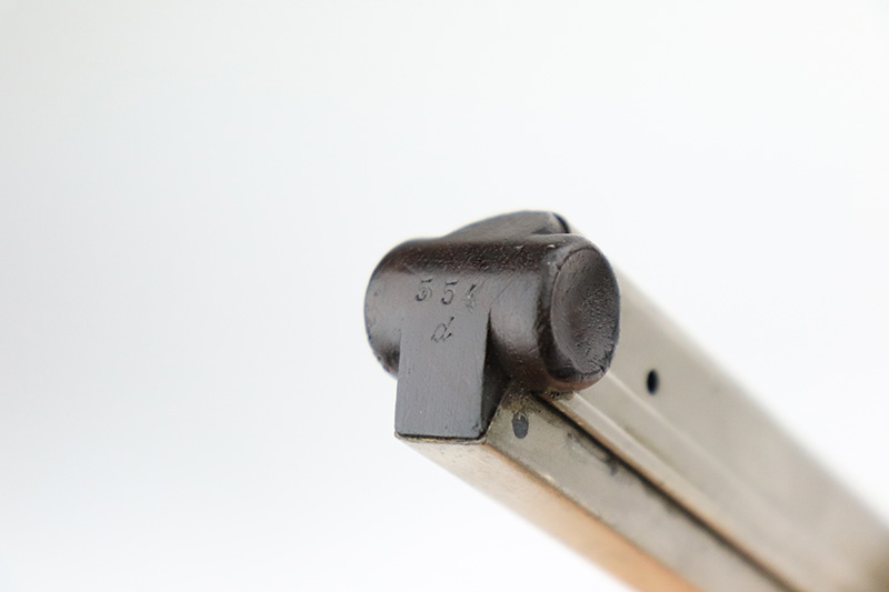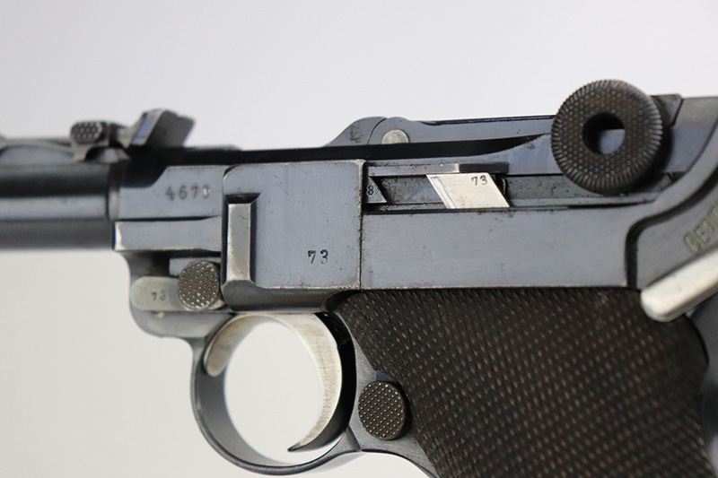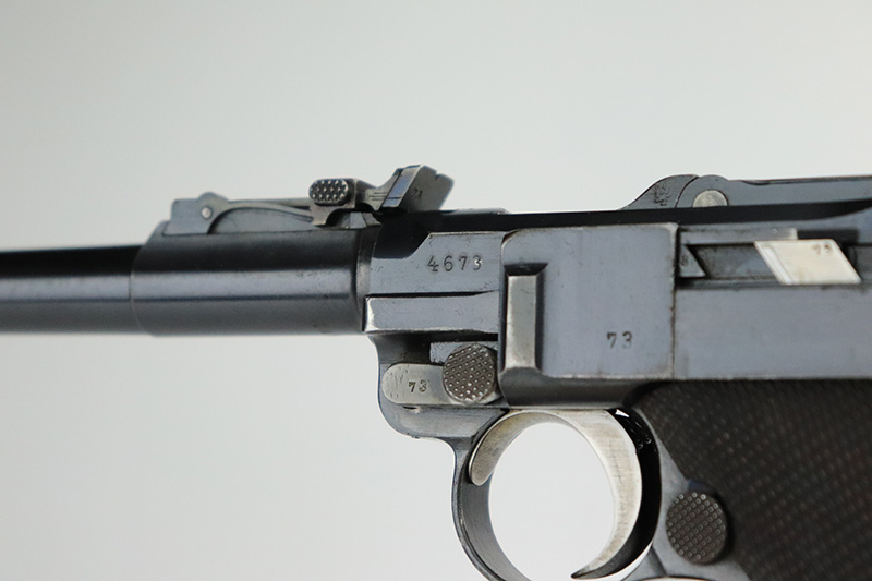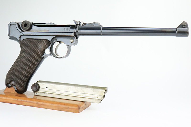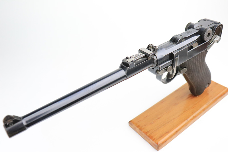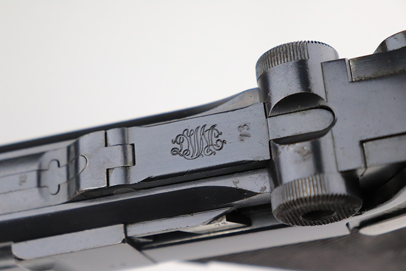 9/6/22 – This is an excellent example of an original military DWM Artillery Luger from 1916. All matching numbers throughout aside from the magazine, and including the grips. It retains about 94-95% of the original blue, with most of the wear on the muzzle, sideplate and bottom of the front strap. Strong bore with minor frost in the grooves. The straw has worn off the small parts unfortunately, so they appear more like bare metal. The grips are in great shape with no cracks or chips, but a patch of smoothing on the right panel. Very nice magazine that’s mismatched but period original.