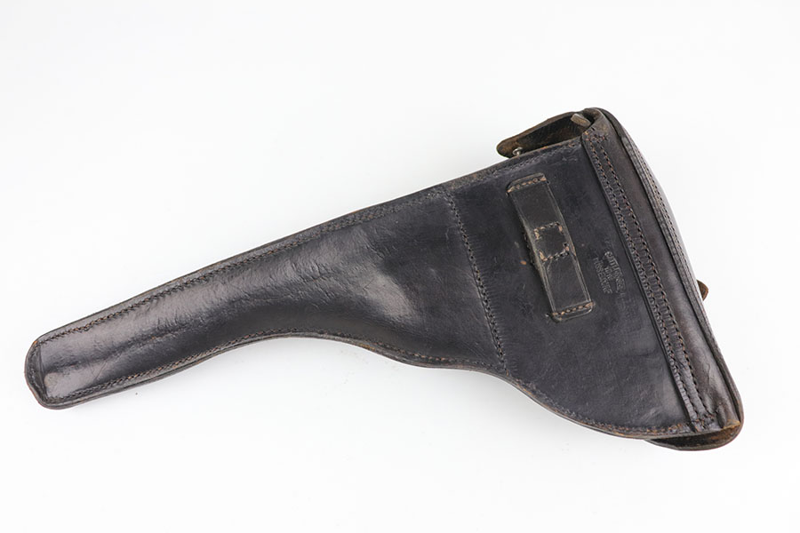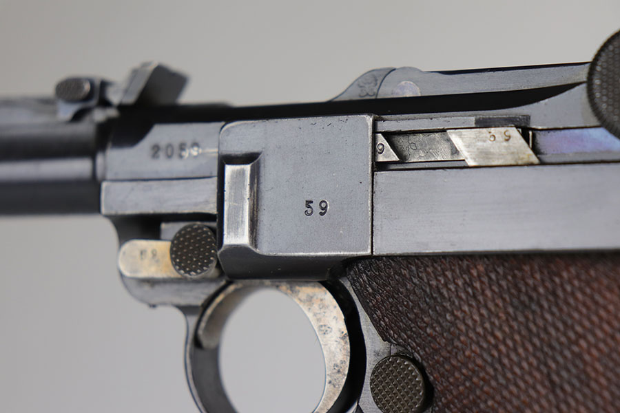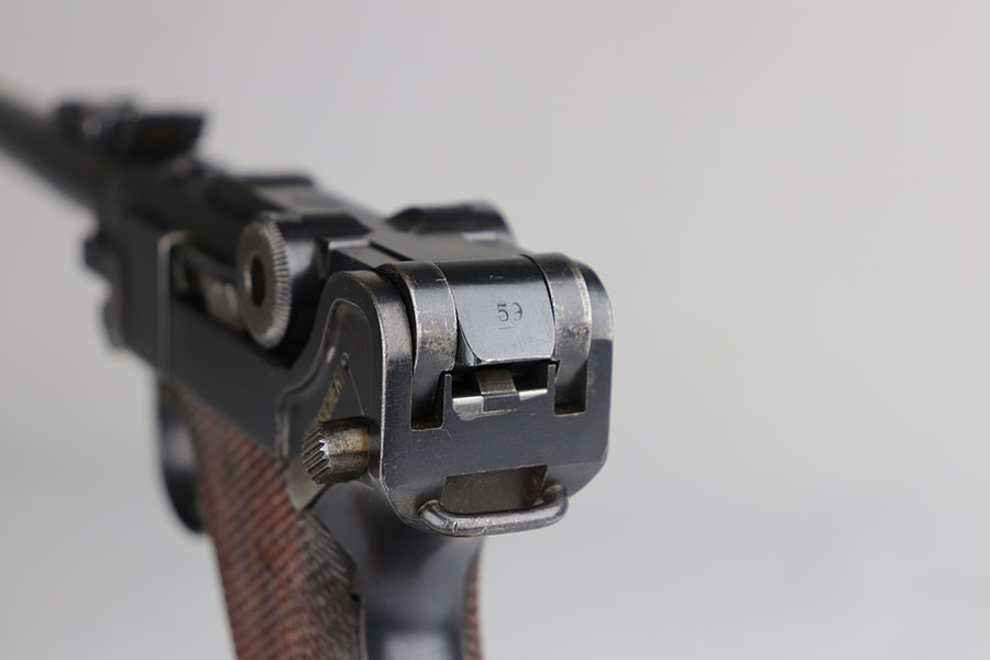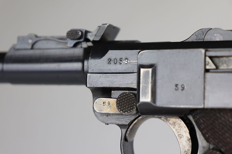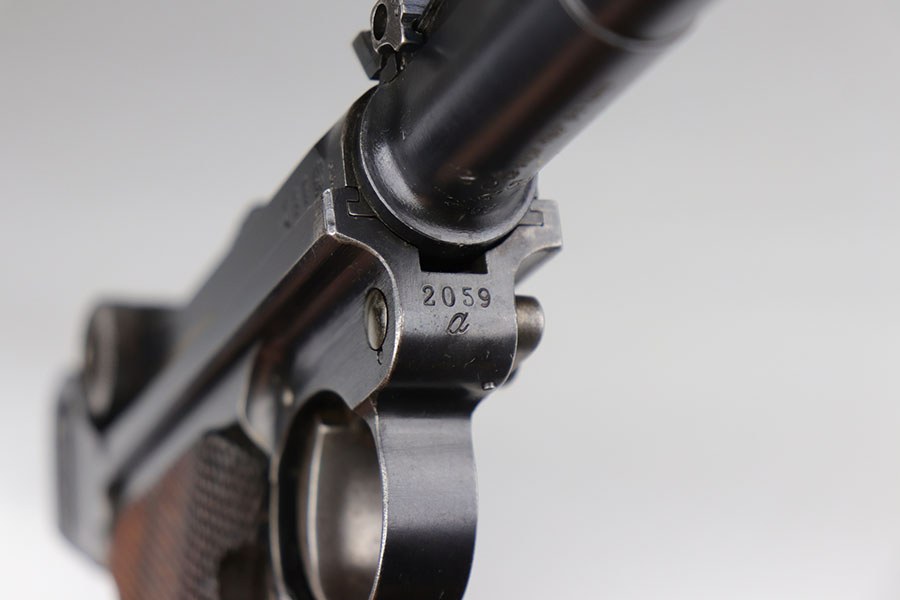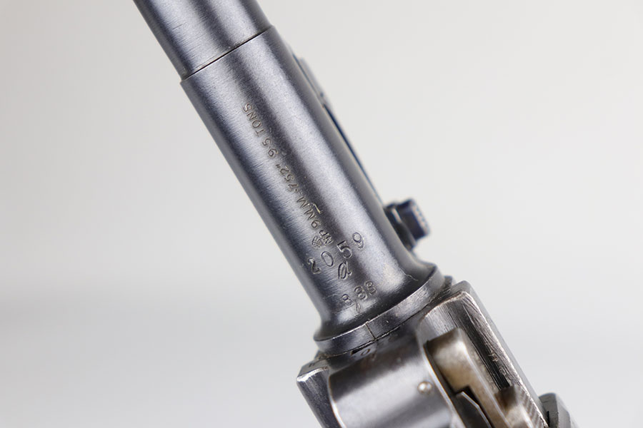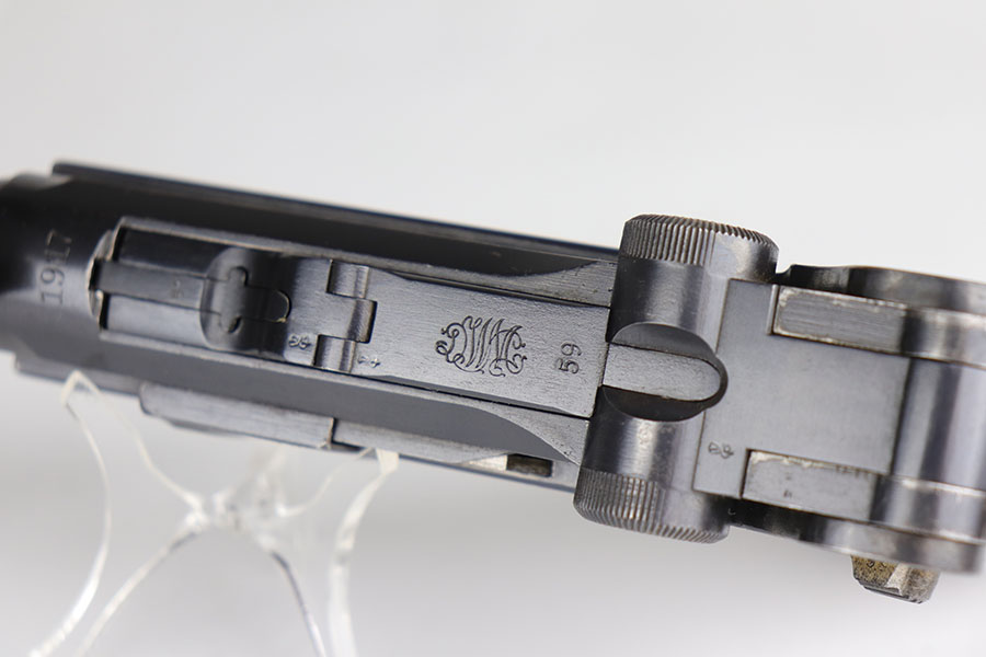 7/3/20 – This is an excellent 1916 DWM Artillery Luger and holster. The pistol has all matching parts with about 96% of the original blue. Minor holster wear on muzzle, sideplate, stock lug and ears of receiver. Small spot of finish loss on the bottom of the front strap. Small parts retain about 80% of the original straw. Magazine is minty and original but mismatched to the gun. The grips are in excellent shape but mismatched to the gun. Terrific example of an original Artillery Luger but there are a few British export marks on the pistol. Comes with a terrific 1916 dated holster that does feature the commonly seen black dye to the external leather.