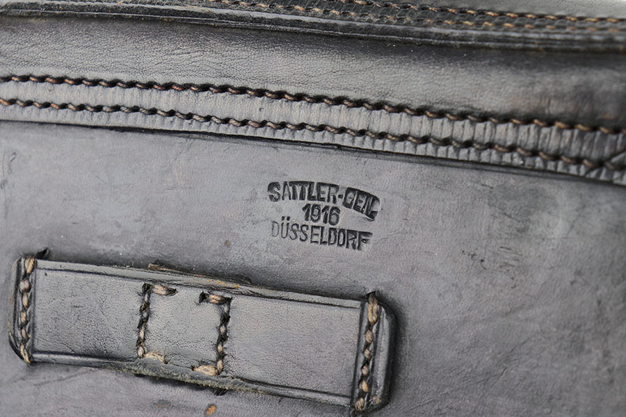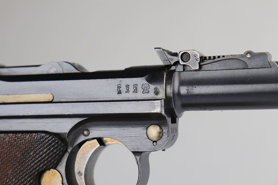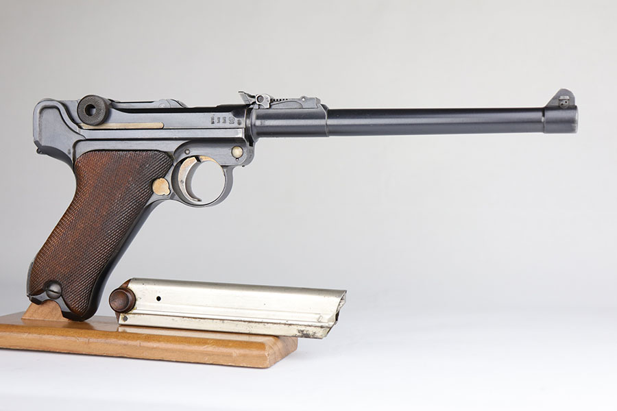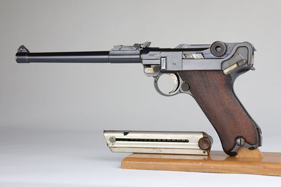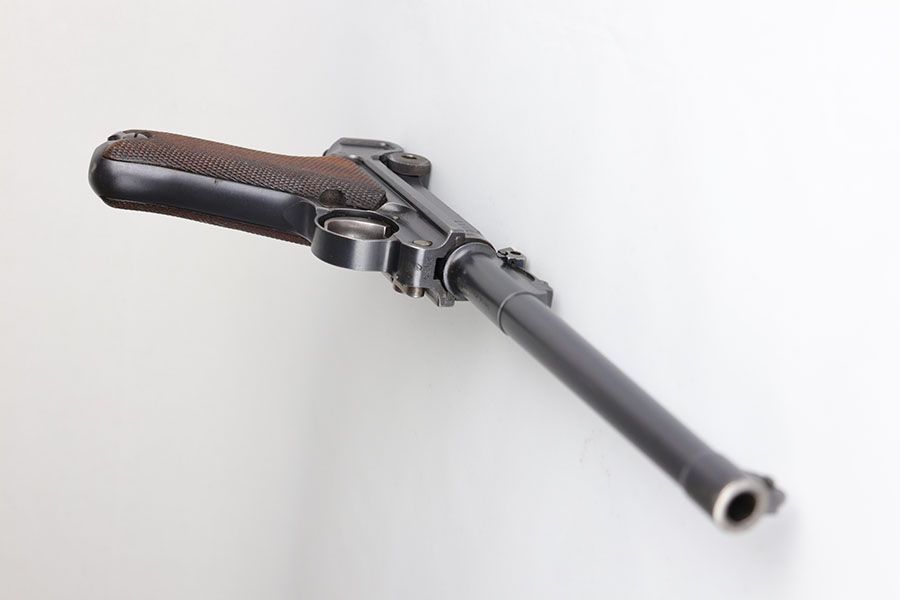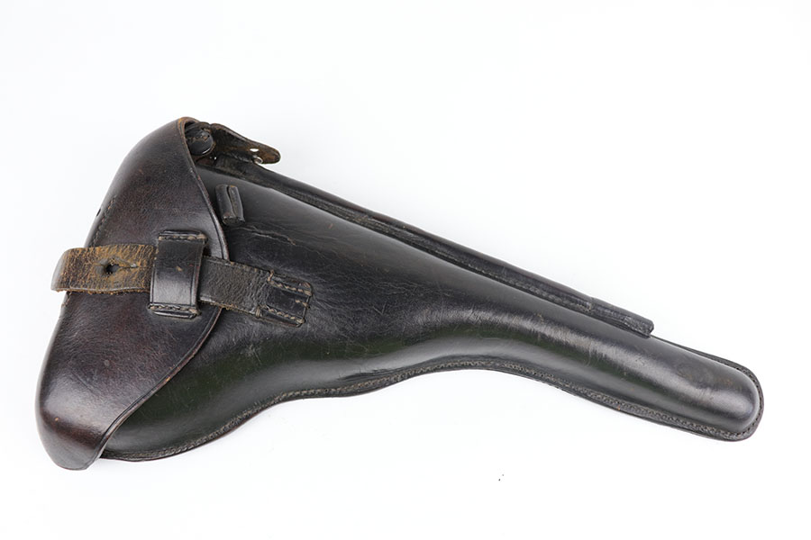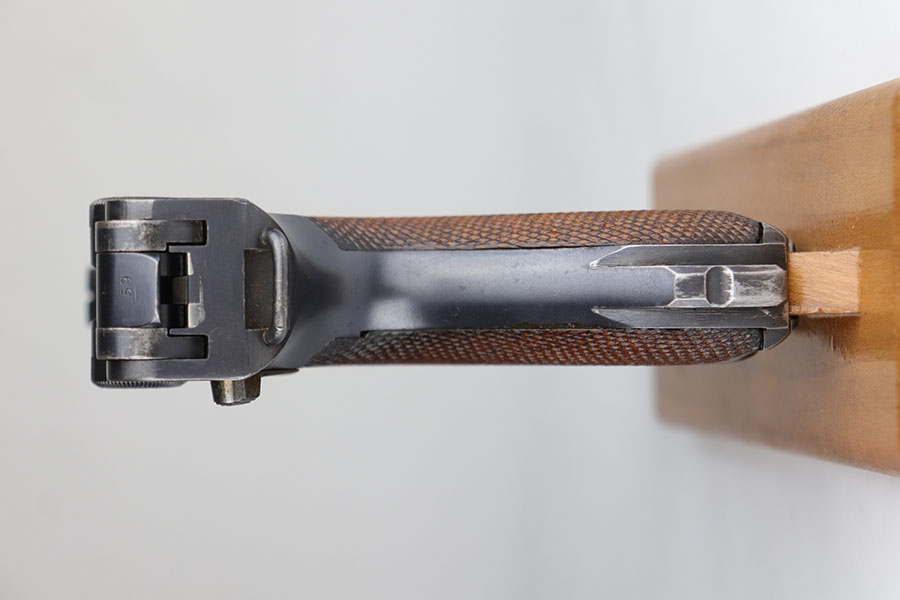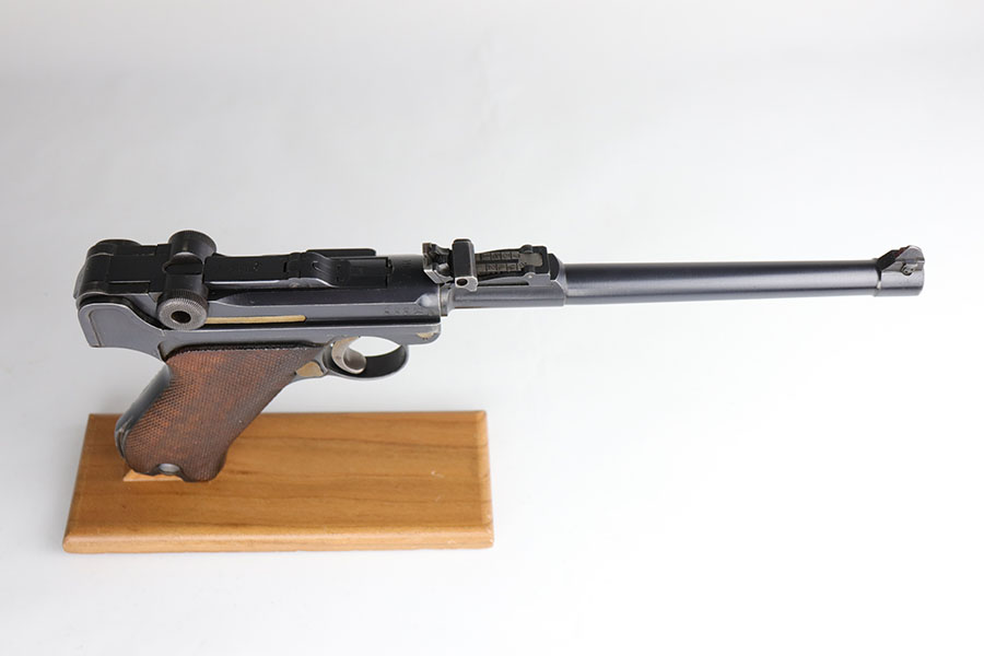 7/3/20 – This is an excellent 1916 DWM Artillery Luger and holster. The pistol has all matching parts with about 96% of the original blue. Minor holster wear on muzzle, sideplate, stock lug and ears of receiver. Small spot of finish loss on the bottom of the front strap. Small parts retain about 80% of the original straw. Magazine is minty and original but mismatched to the gun. The grips are in excellent shape but mismatched to the gun. Terrific example of an original Artillery Luger but there are a few British export marks on the pistol. Comes with a terrific 1916 dated holster that does feature the commonly seen black dye to the external leather.