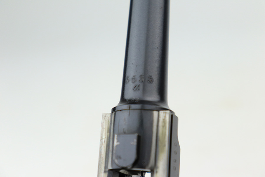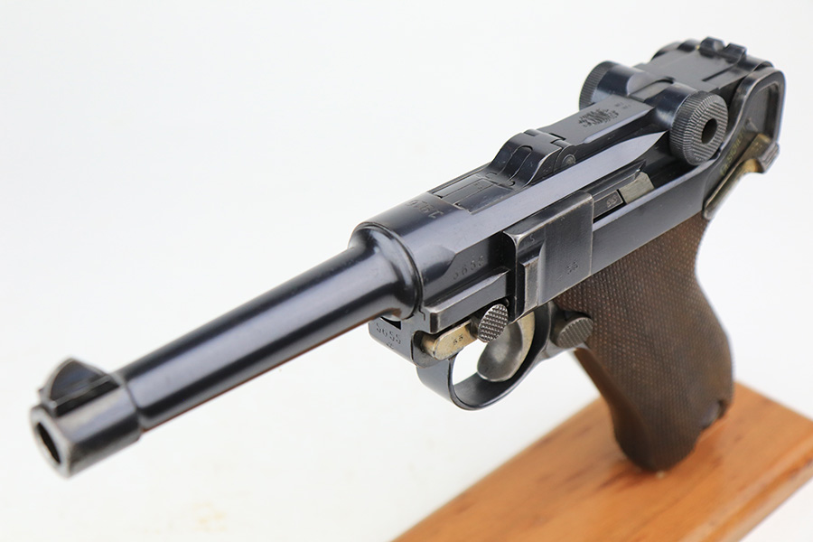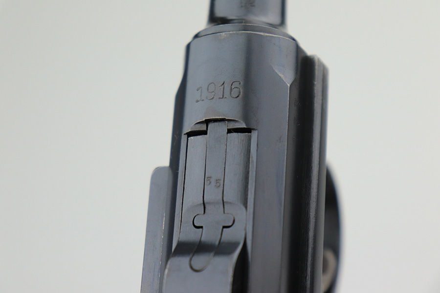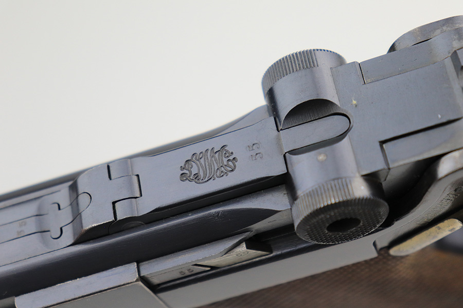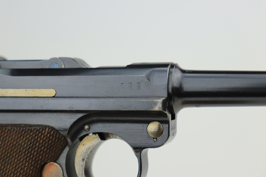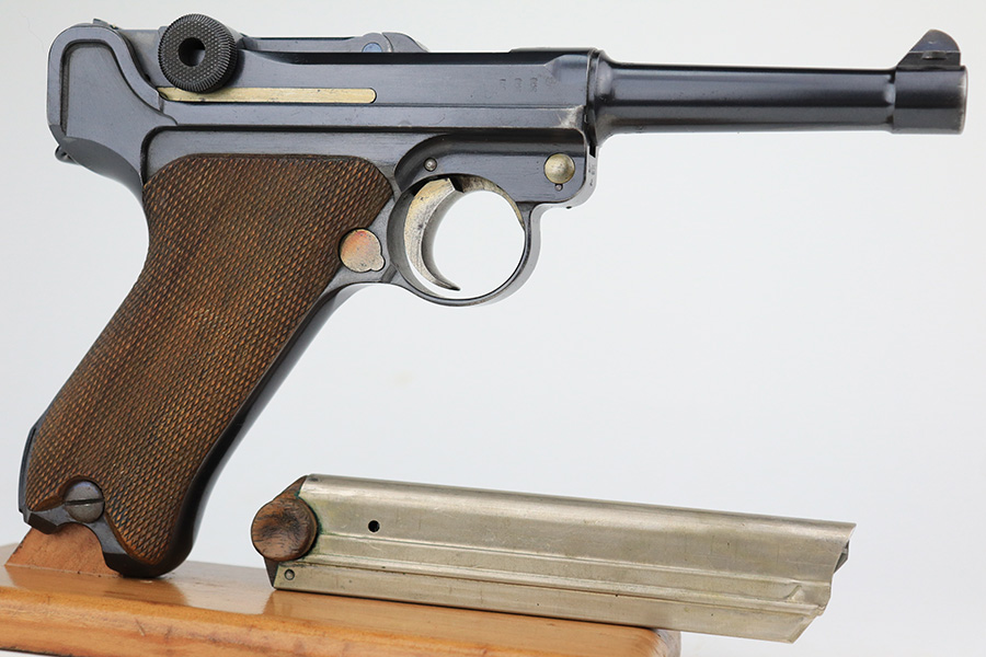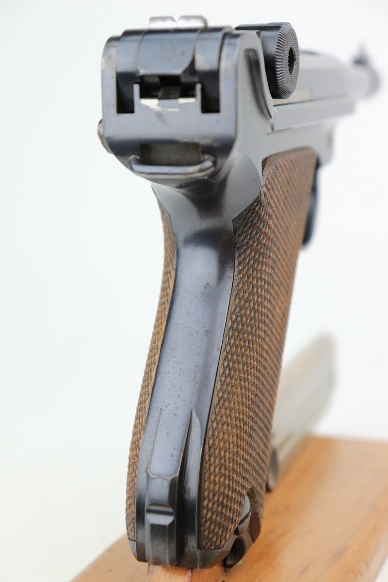9/27/23 – This is a beautiful example of a matching and original DWM Luger from 1916 that was sent to the German Army. All numbered parts of the pistol match, including the grips. The magazine is a period mismatch. Strong, shiny bore. The blue rates at about 96-97% with minor high edge wear in all the common areas and excellent straw on the small grips. No cracks or chips in the grips or mag.