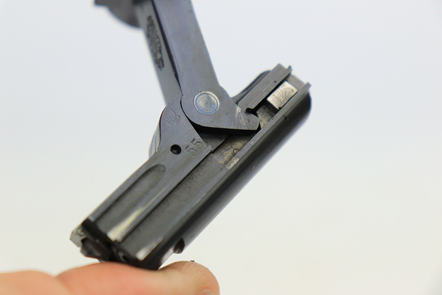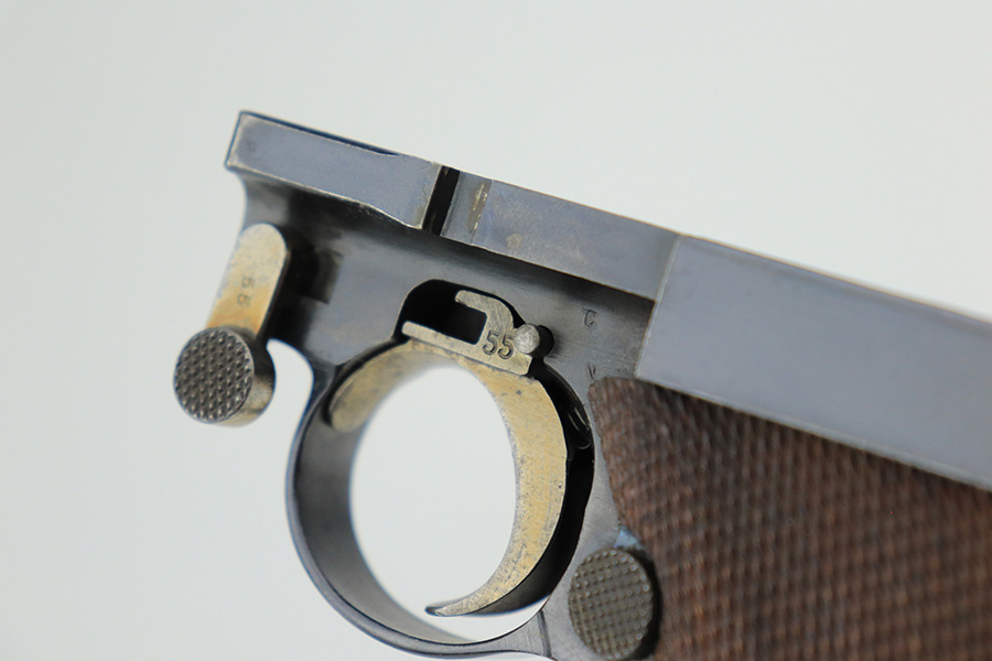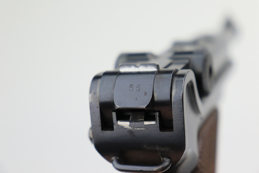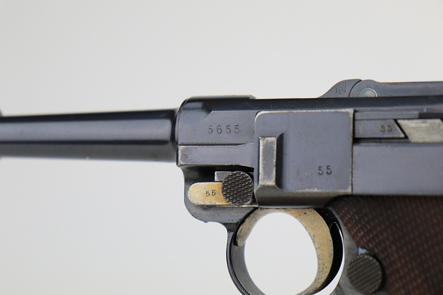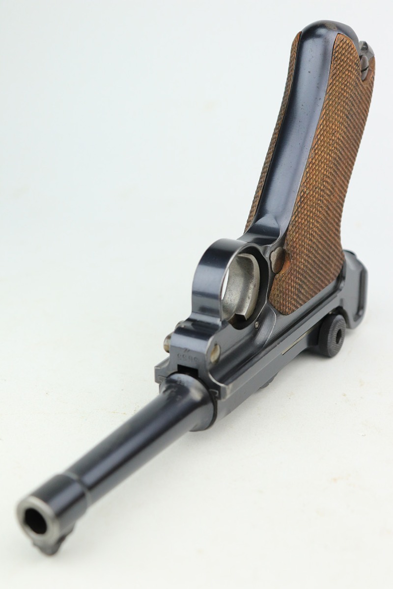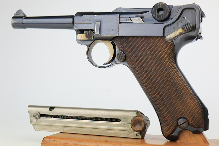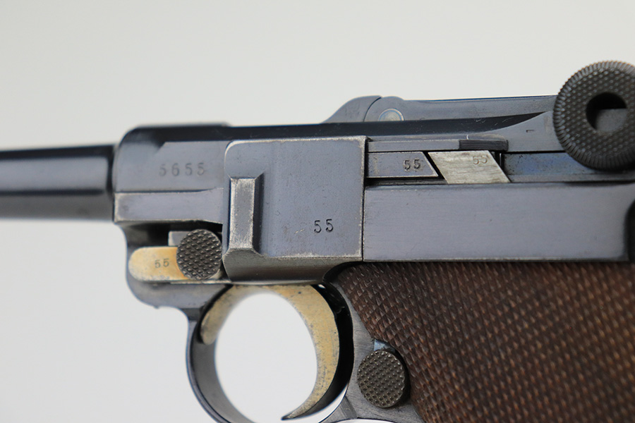 9/27/23 – This is a beautiful example of a matching and original DWM Luger from 1916 that was sent to the German Army. All numbered parts of the pistol match, including the grips. The magazine is a period mismatch. Strong, shiny bore. The blue rates at about 96-97% with minor high edge wear in all the common areas and excellent straw on the small grips. No cracks or chips in the grips or mag.