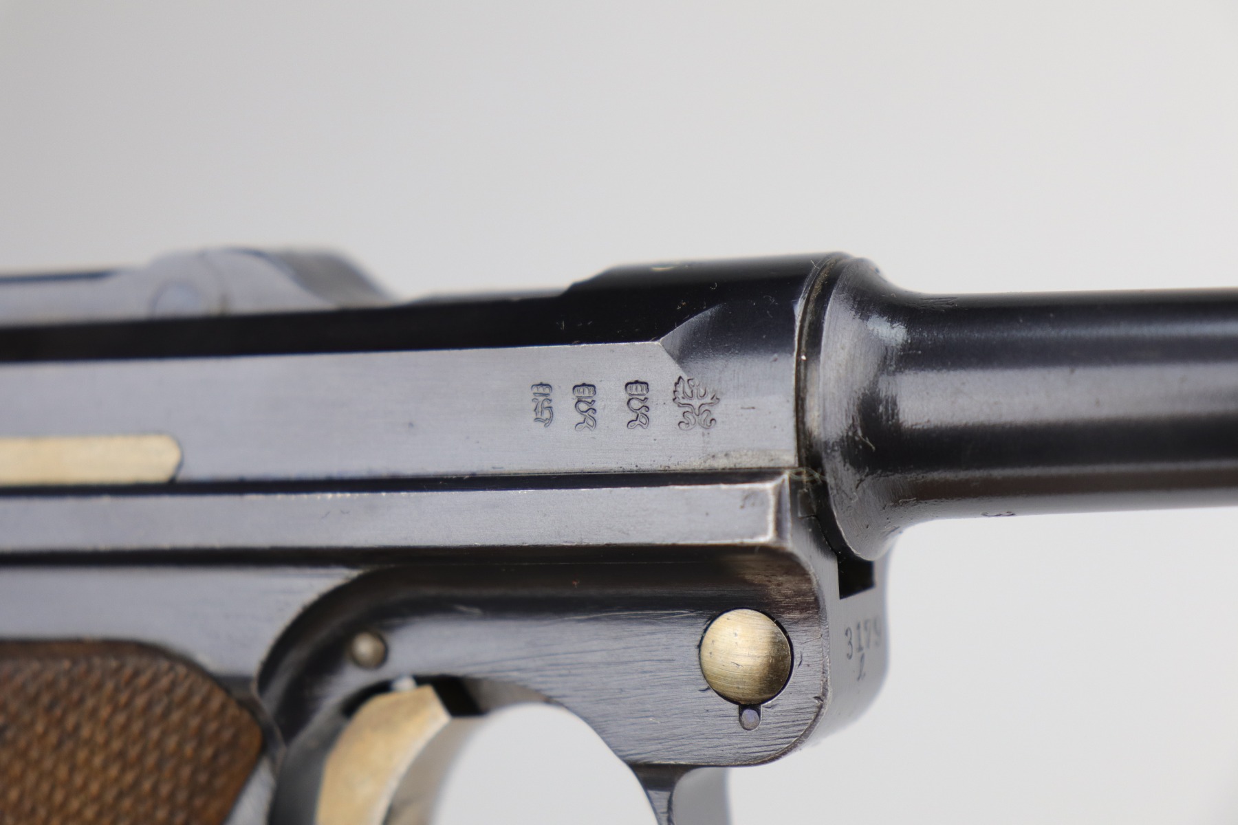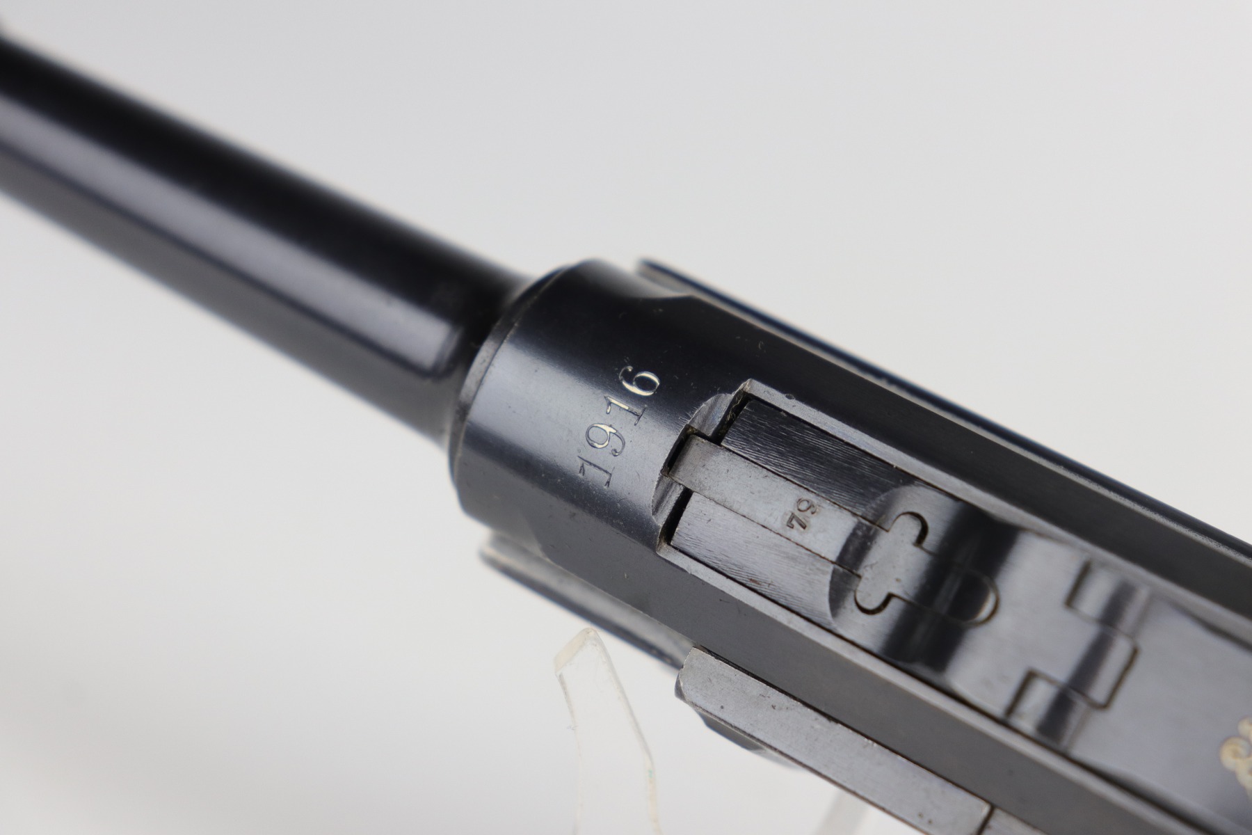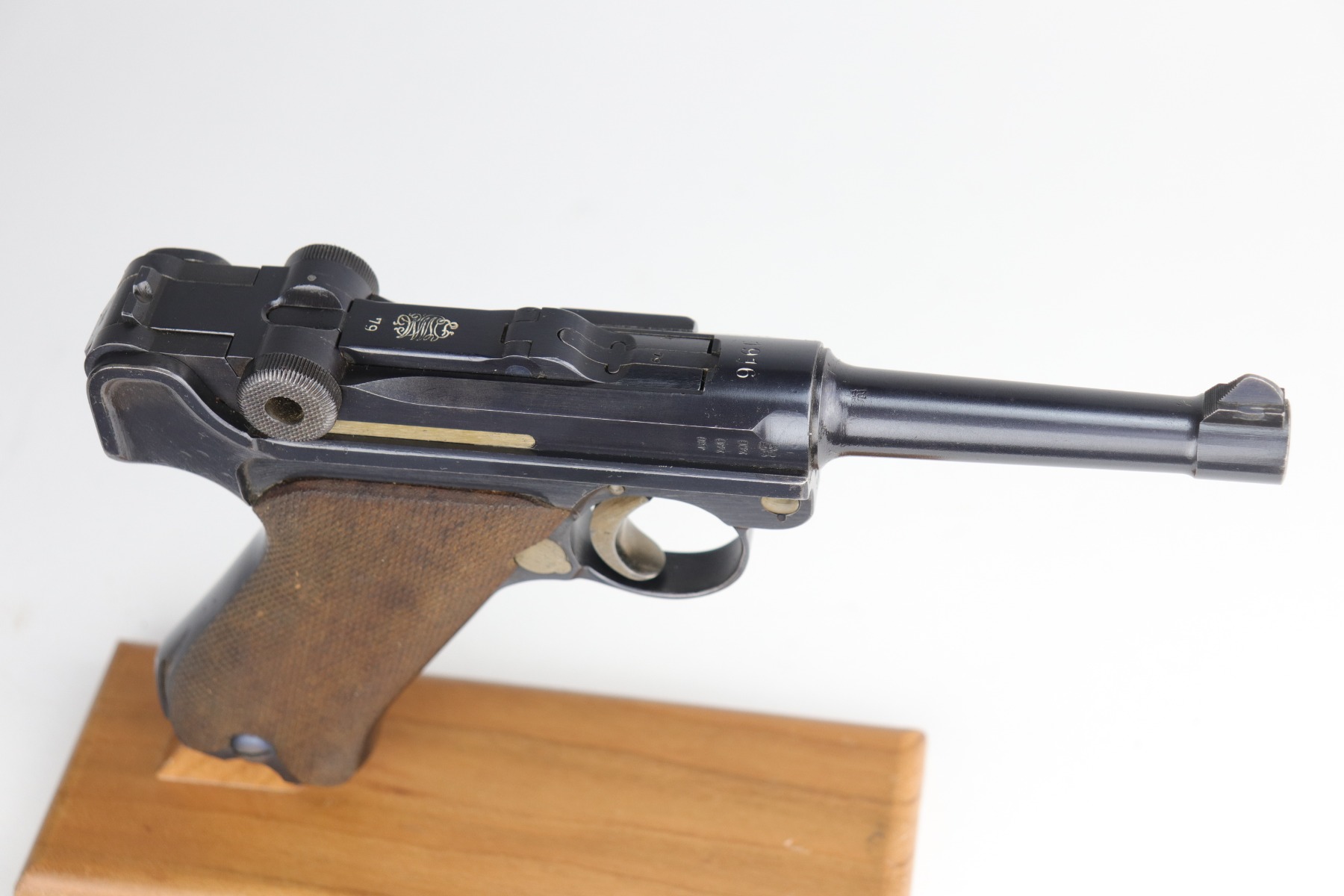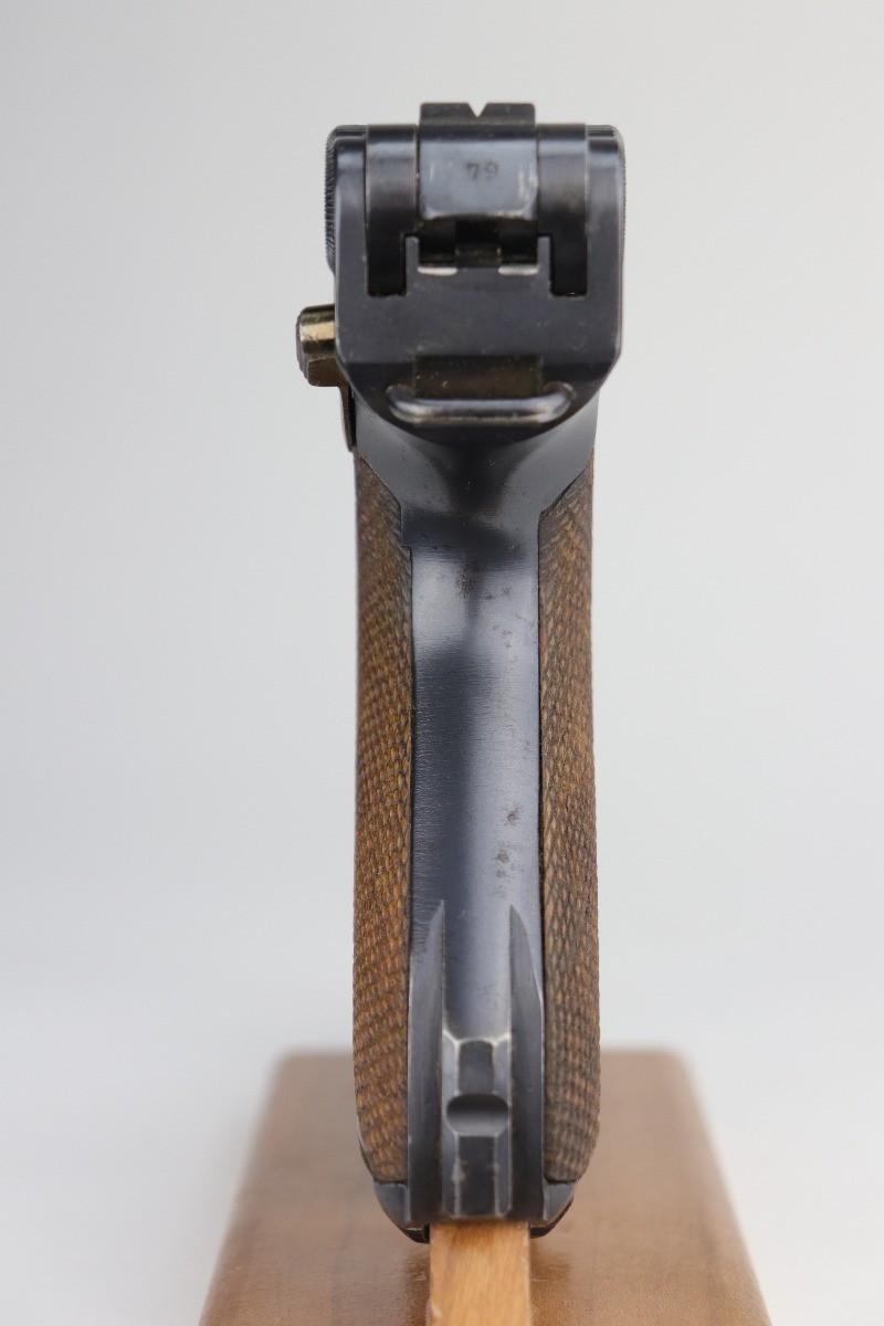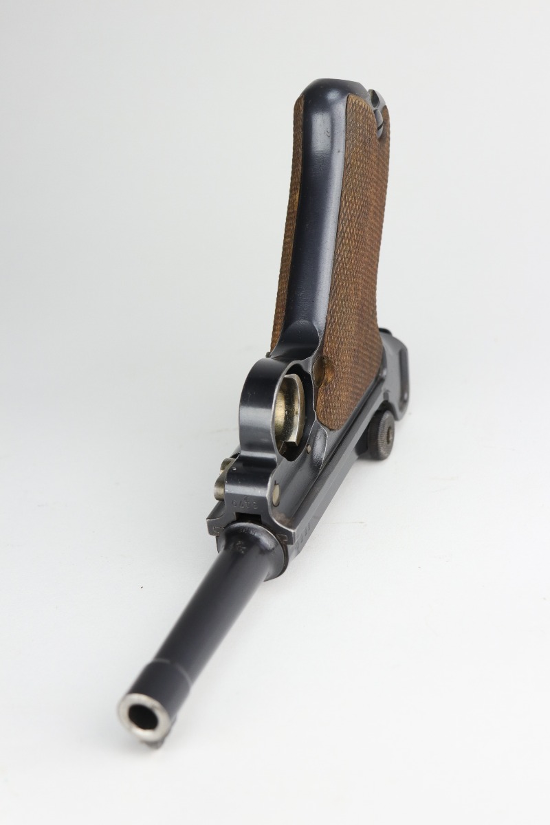 9/5/20 – This is an excellent DWM Luger issued to the German military in 1916. The gun is all matching and the right side of the slide has the proper German imperial proofs. This particular example has retained about 98% of its original bluing. There is very minor high edge wear on the frame and side plate. One small area of discoloration at the very front of the right side of the frame. Minor freckling on the straps. The bore is near-mint. It comes with an original matching magazine. The grips are excellent, original, and matching to the gun. All around excellent gun. Please note: the photos show two magazines. This gun only comes with one matching magazine.