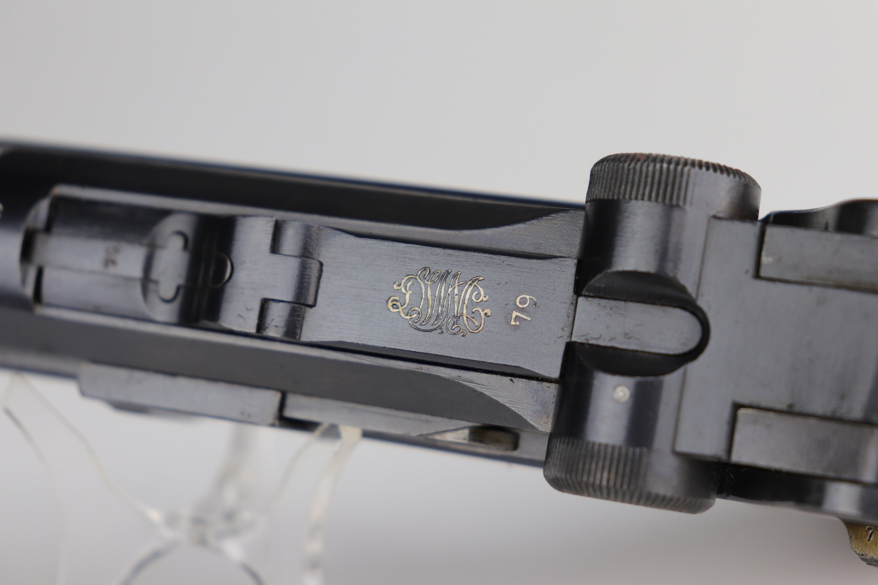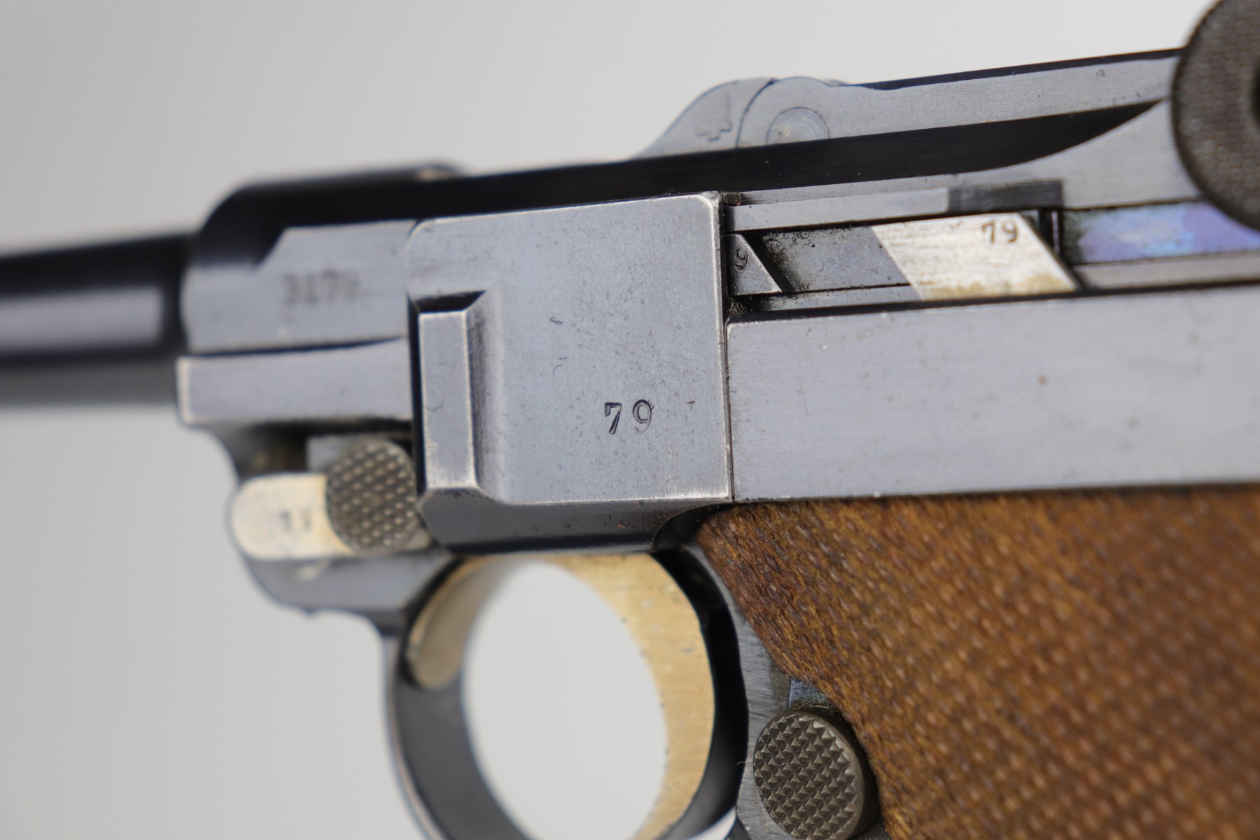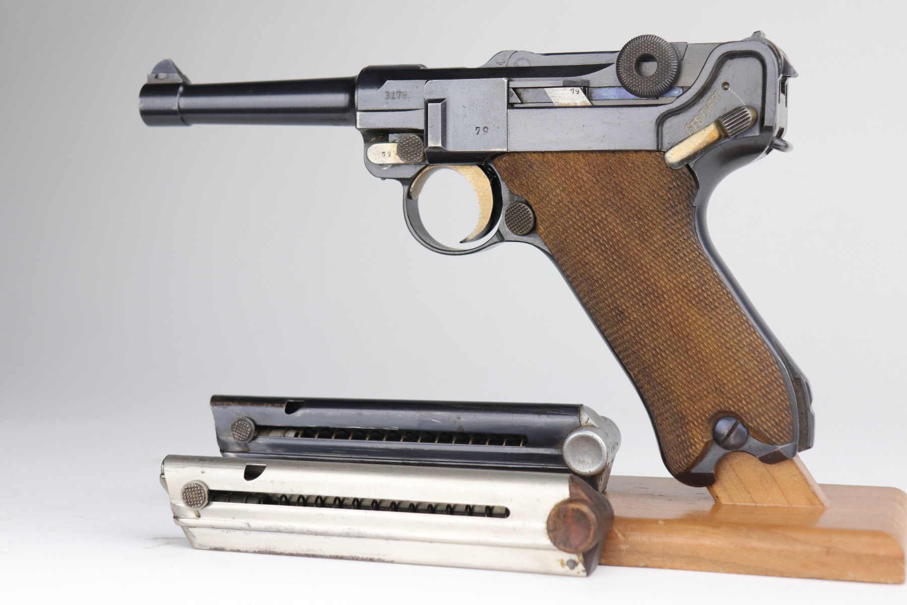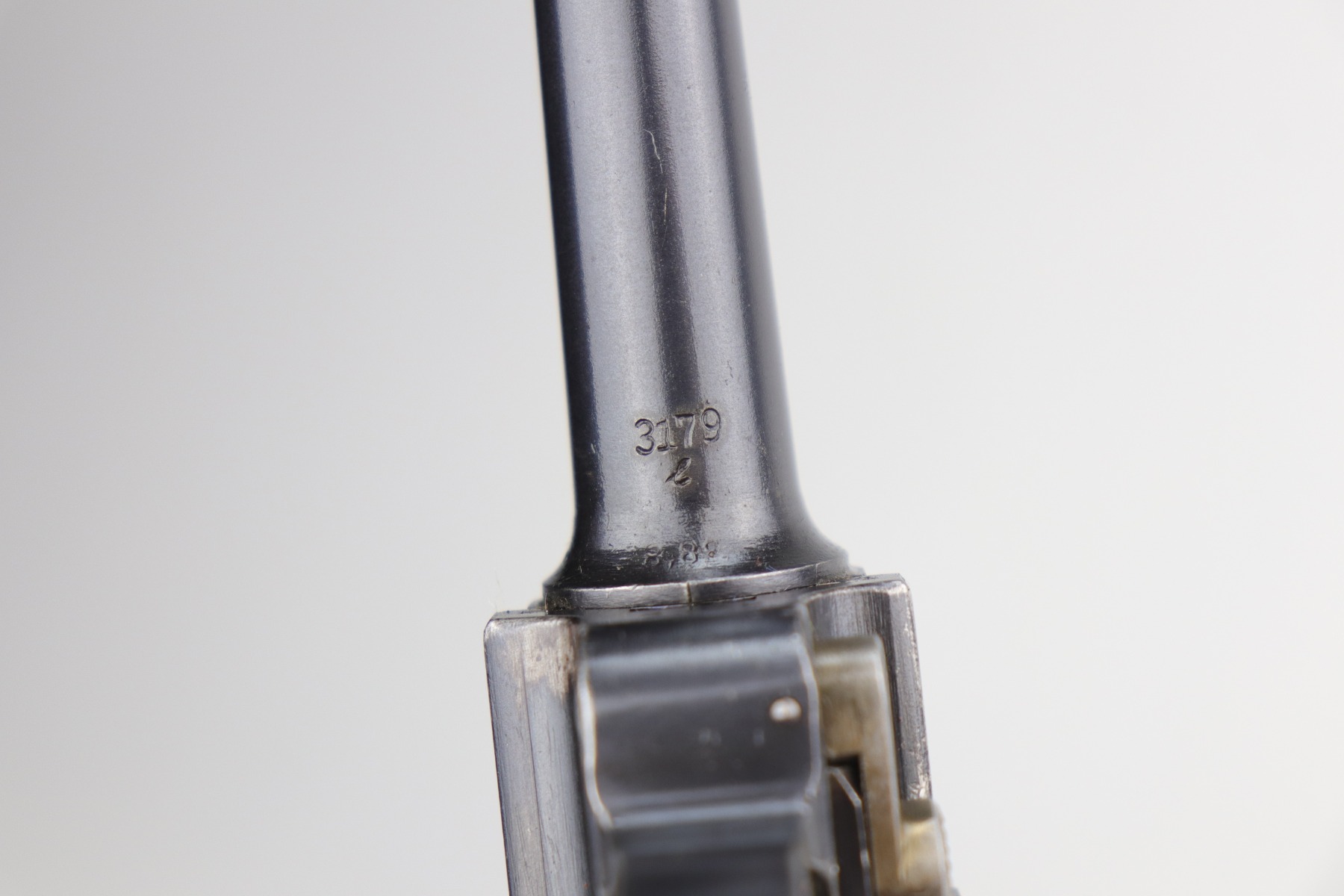 9/5/20 – This is an excellent DWM Luger issued to the German military in 1916. The gun is all matching and the right side of the slide has the proper German imperial proofs. This particular example has retained about 98% of its original bluing. There is very minor high edge wear on the frame and side plate. One small area of discoloration at the very front of the right side of the frame. Minor freckling on the straps. The bore is near-mint. It comes with an original matching magazine. The grips are excellent, original, and matching to the gun. All around excellent gun. Please note: the photos show two magazines. This gun only comes with one matching magazine.
