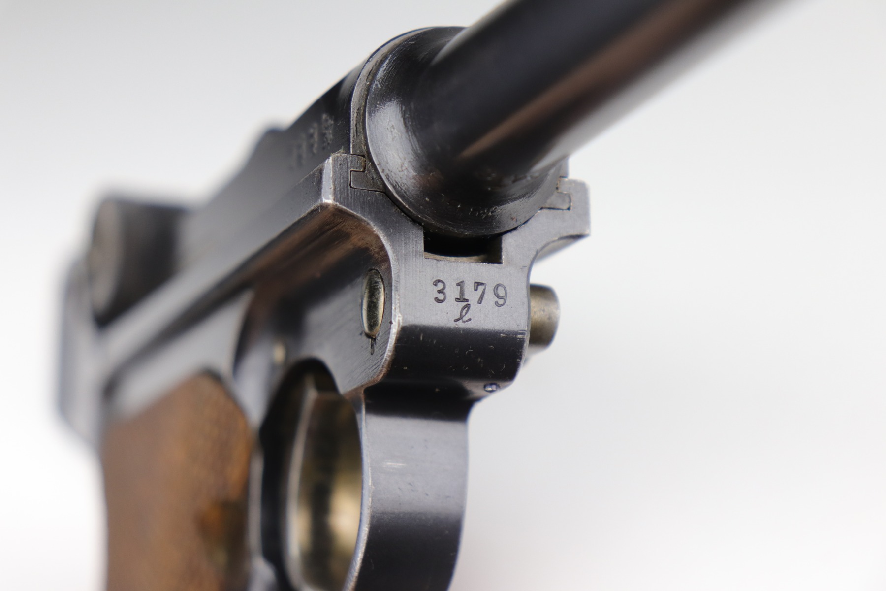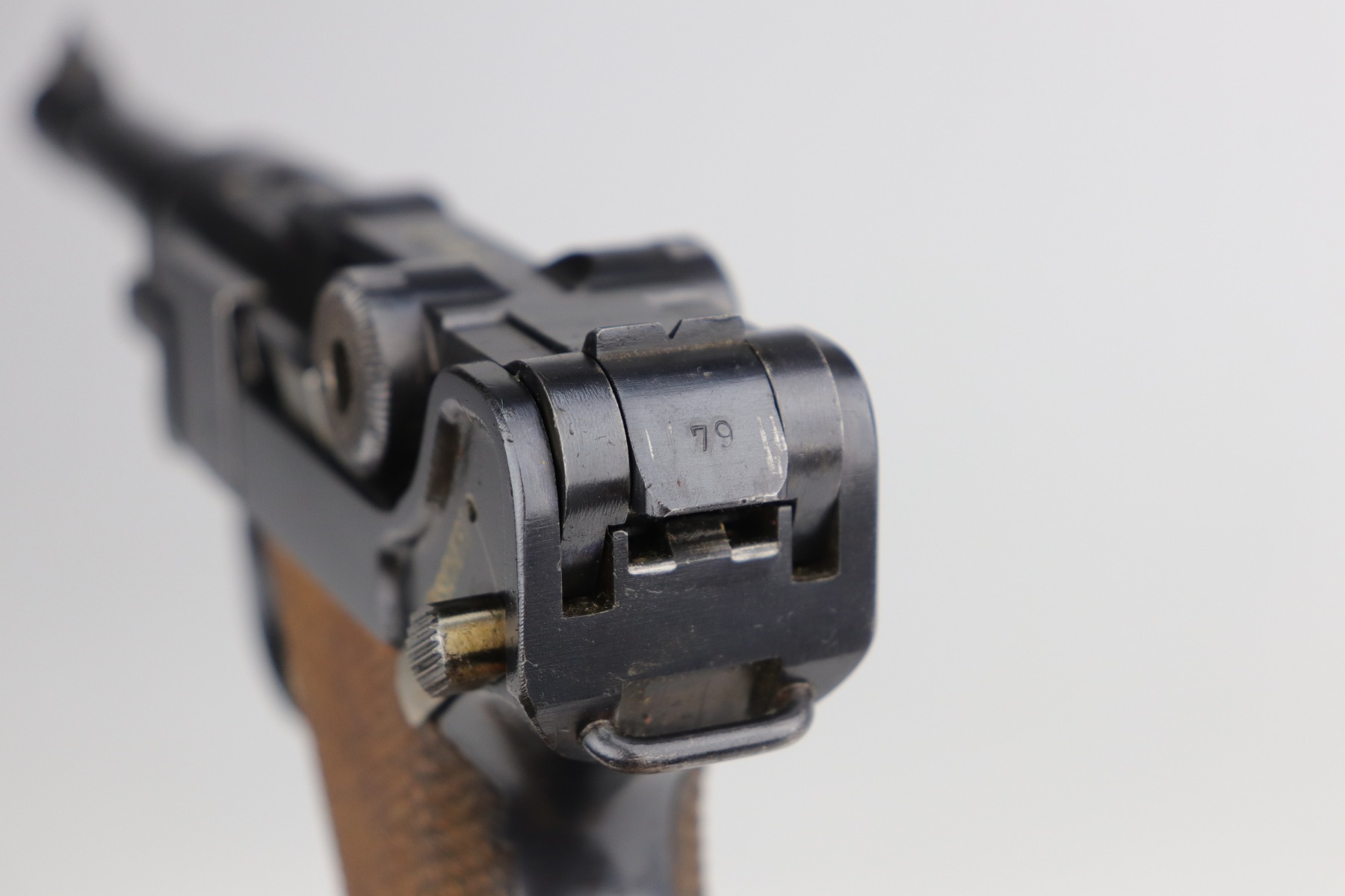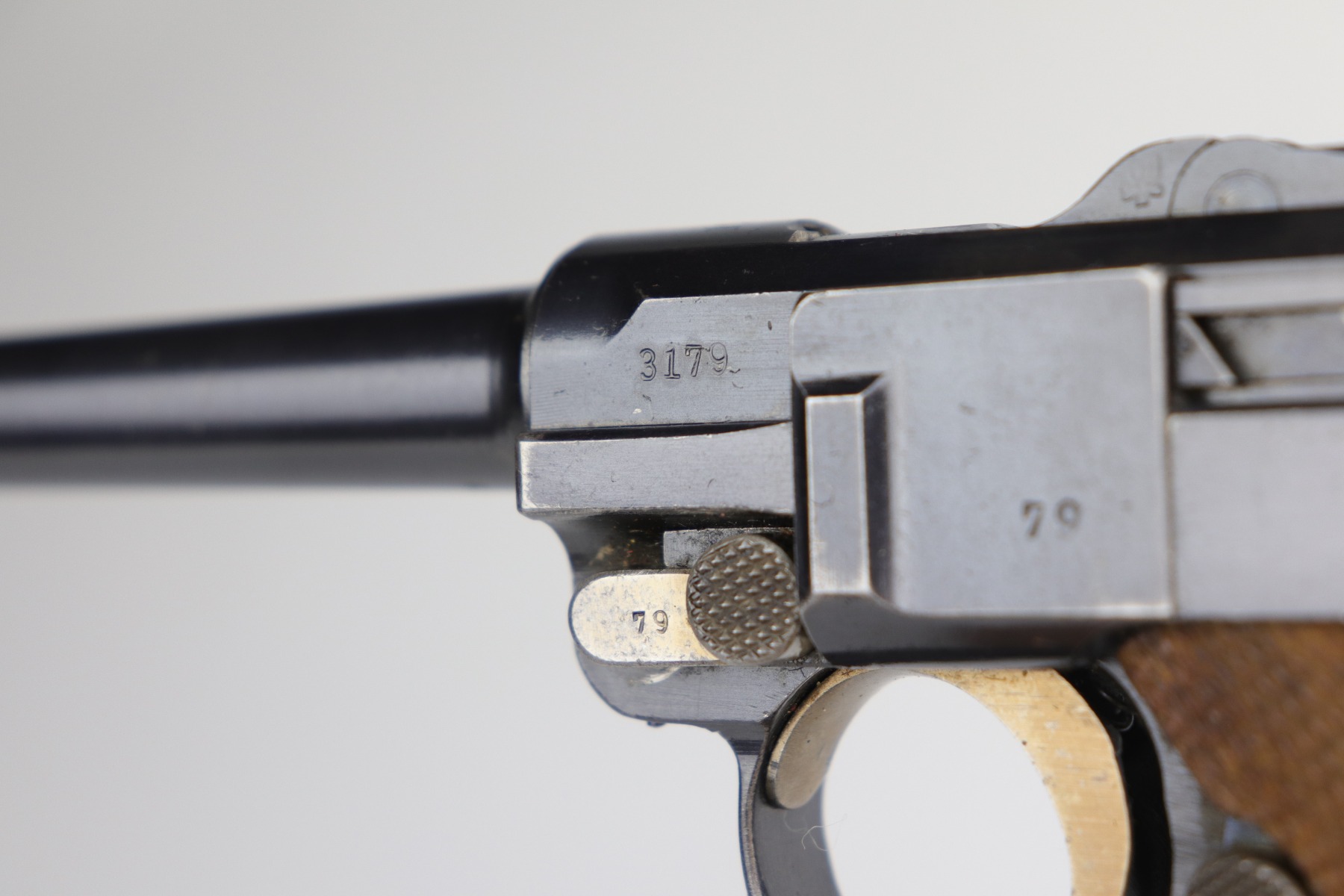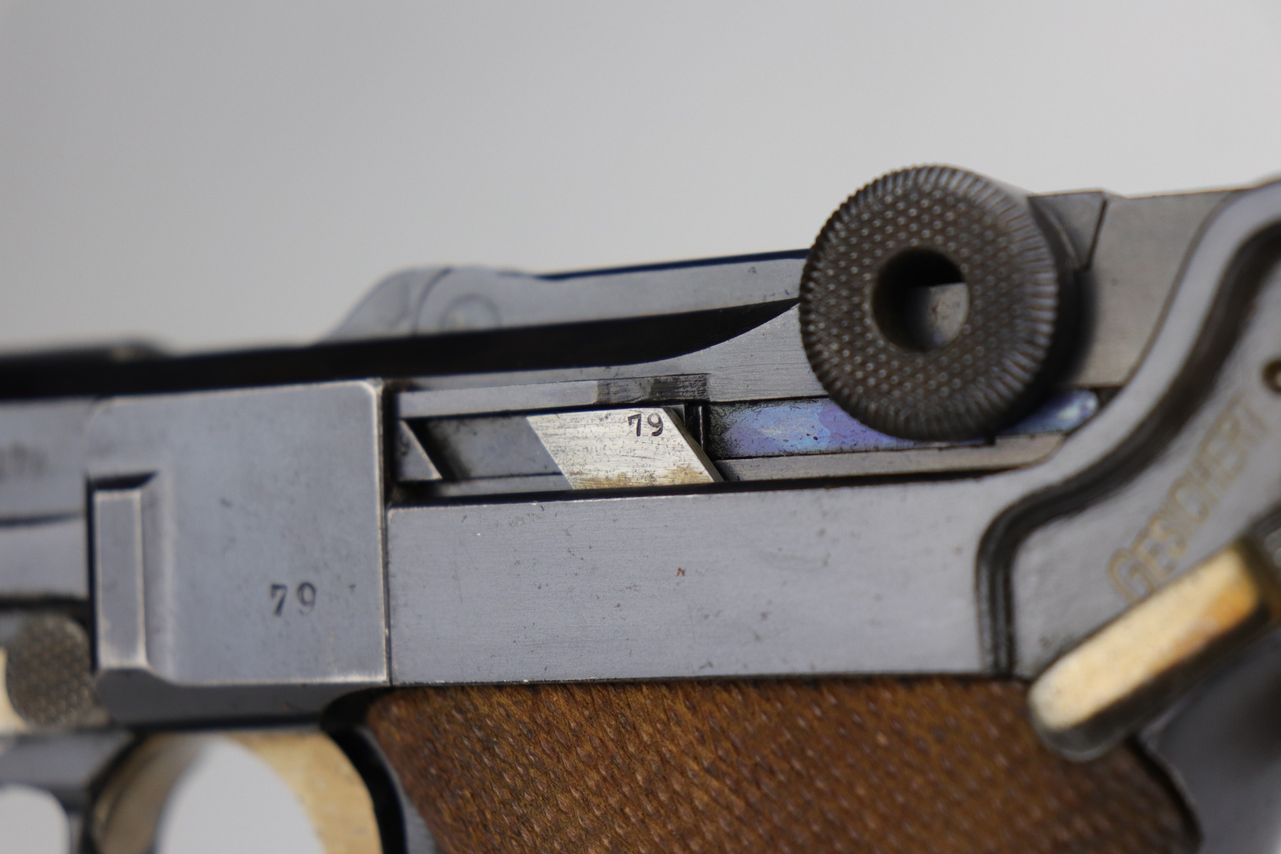 9/5/20 – This is an excellent DWM Luger issued to the German military in 1916. The gun is all matching and the right side of the slide has the proper German imperial proofs. This particular example has retained about 98% of its original bluing. There is very minor high edge wear on the frame and side plate. One small area of discoloration at the very front of the right side of the frame. Minor freckling on the straps. The bore is near-mint. It comes with an original matching magazine. The grips are excellent, original, and matching to the gun. All around excellent gun. Please note: the photos show two magazines. This gun only comes with one matching magazine.