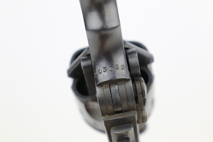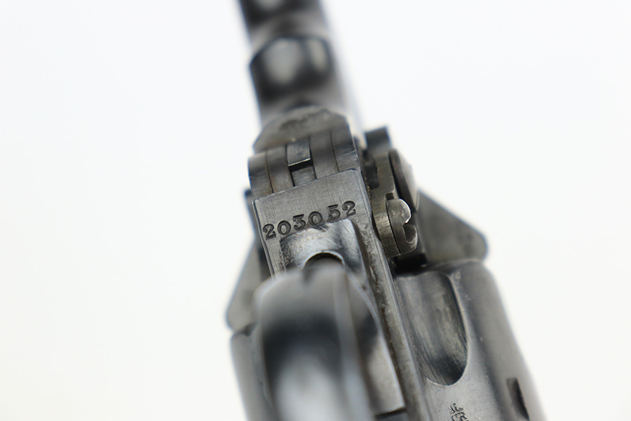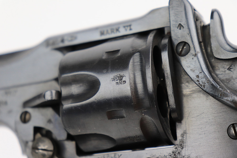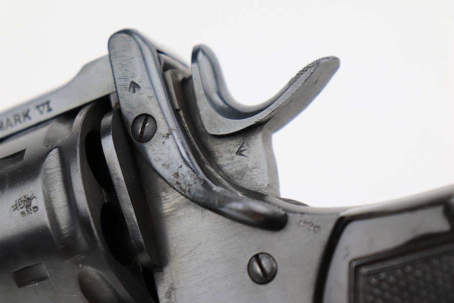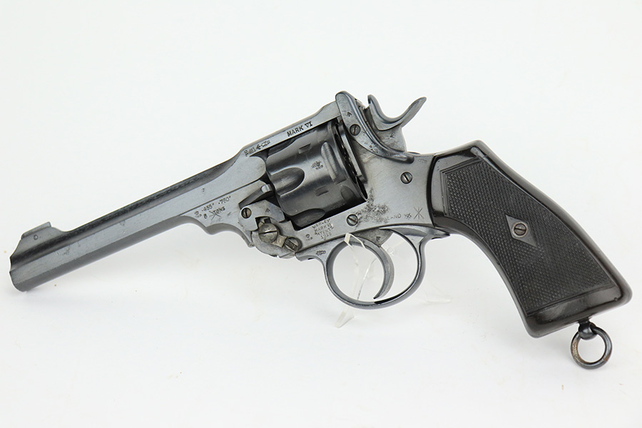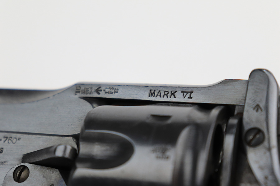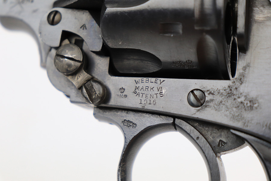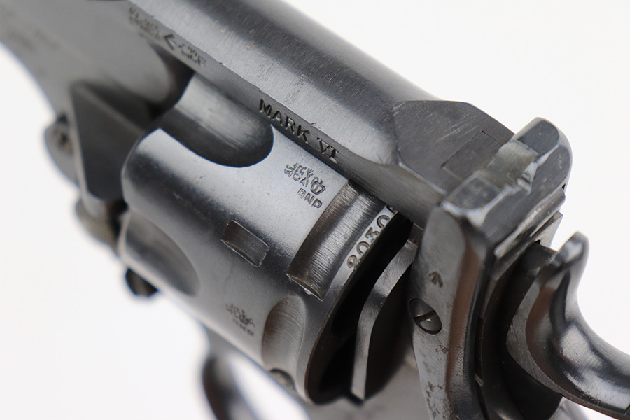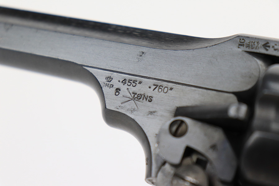 6/1/23 – This is an excellent example of a Webley Mark VI revolver issued to the British military in 1916. All matching with the proper British proofs throughout. This one has been arsenal refurbished and was released from military service to be sold in the commercial market, as evidenced by the “opposing broad arrow” markings. The gun was originally chambered in .455, but the cylinder has been shaved to accept .45 Caliber. There is almost no actual bluing loss, but there are a couple areas of minor pitting under the finish here and there, most noticeable on the left side of the frame. Fitted with very nice bakelite grips – some tiny handing marks on both sides. The majority of the bore is in like-new condition, but there is some very light freckling near the muzzle end.