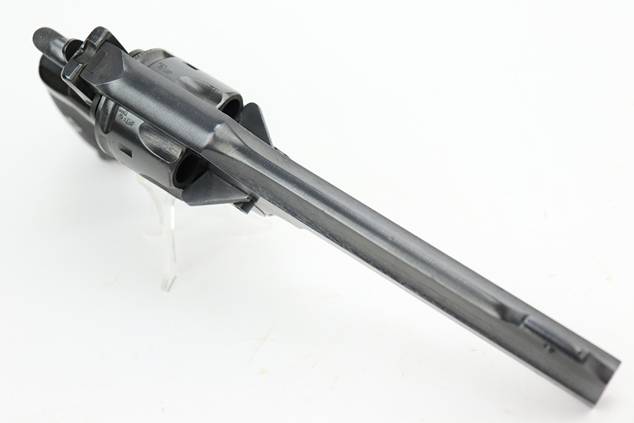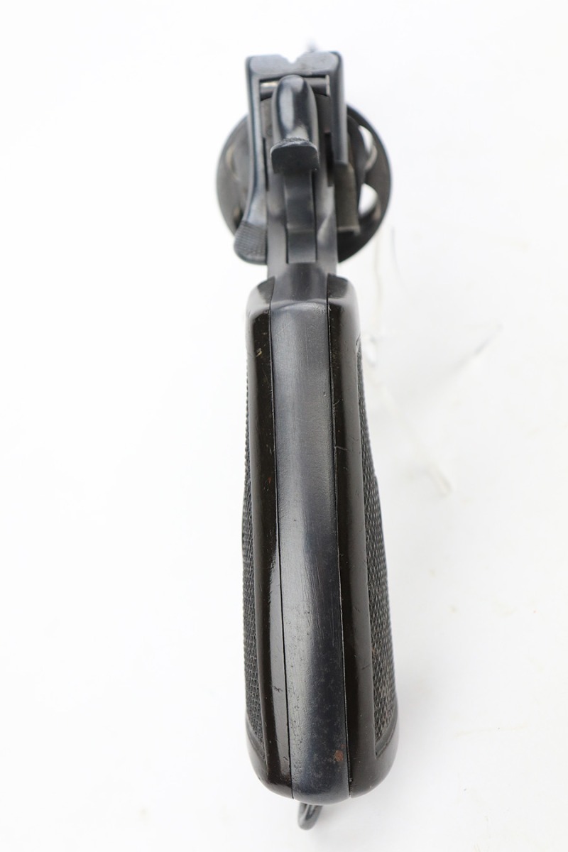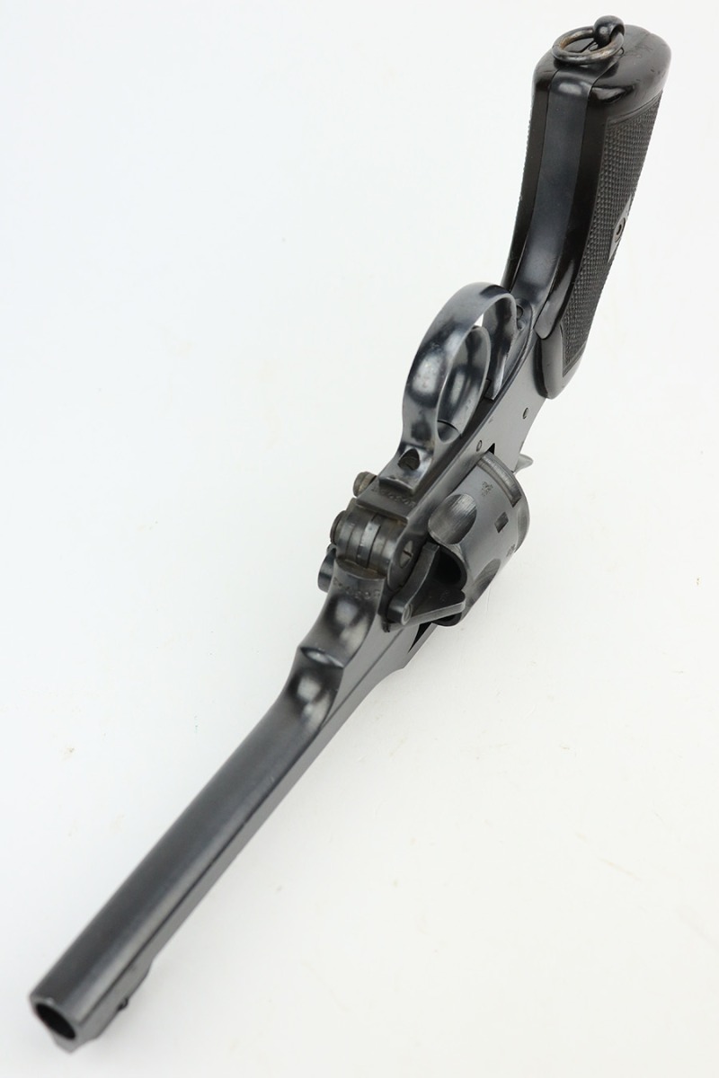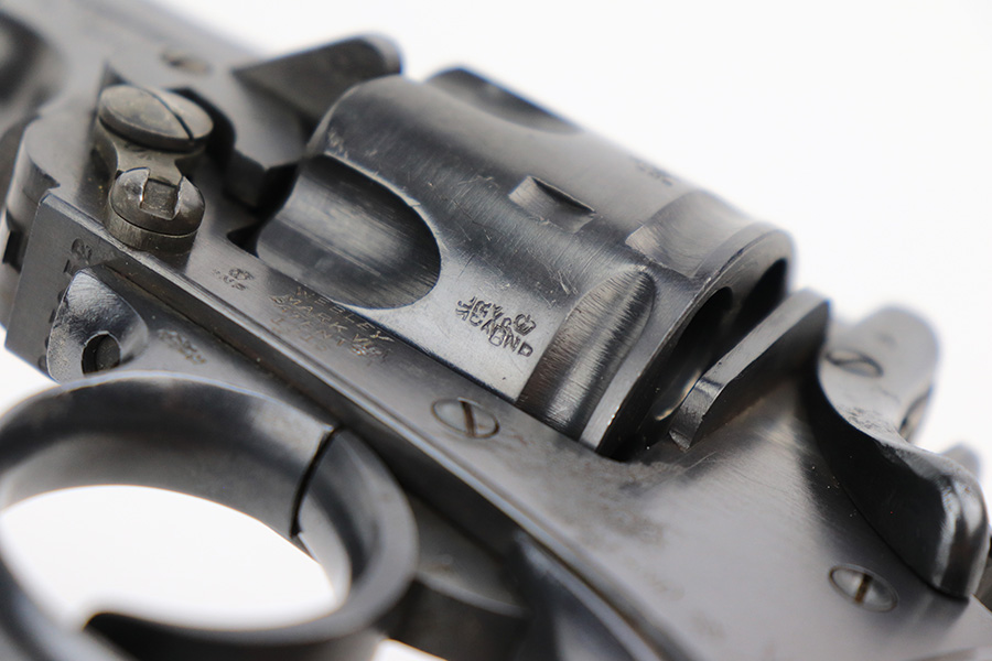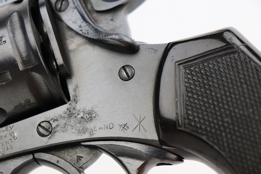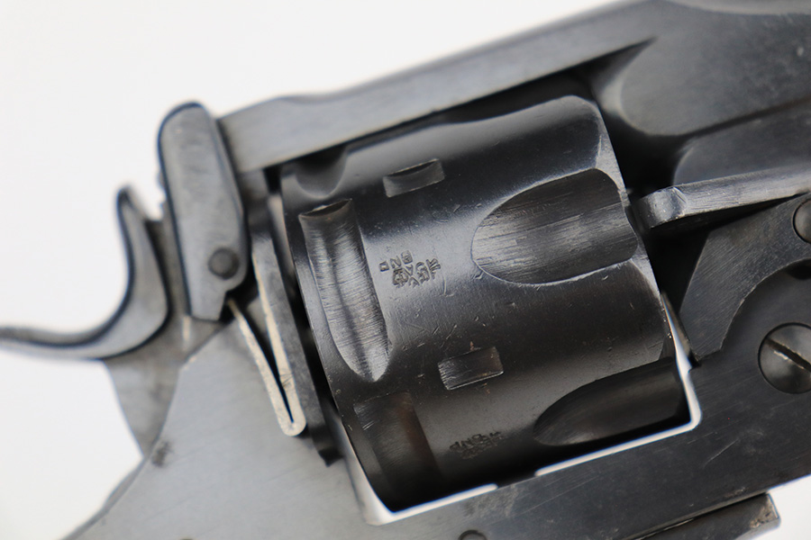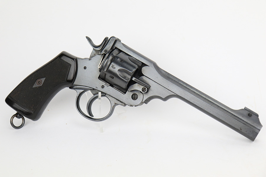 6/1/23 – This is an excellent example of a Webley Mark VI revolver issued to the British military in 1916. All matching with the proper British proofs throughout. This one has been arsenal refurbished and was released from military service to be sold in the commercial market, as evidenced by the “opposing broad arrow” markings. The gun was originally chambered in .455, but the cylinder has been shaved to accept .45 Caliber. There is almost no actual bluing loss, but there are a couple areas of minor pitting under the finish here and there, most noticeable on the left side of the frame. Fitted with very nice bakelite grips – some tiny handing marks on both sides. The majority of the bore is in like-new condition, but there is some very light freckling near the muzzle end.