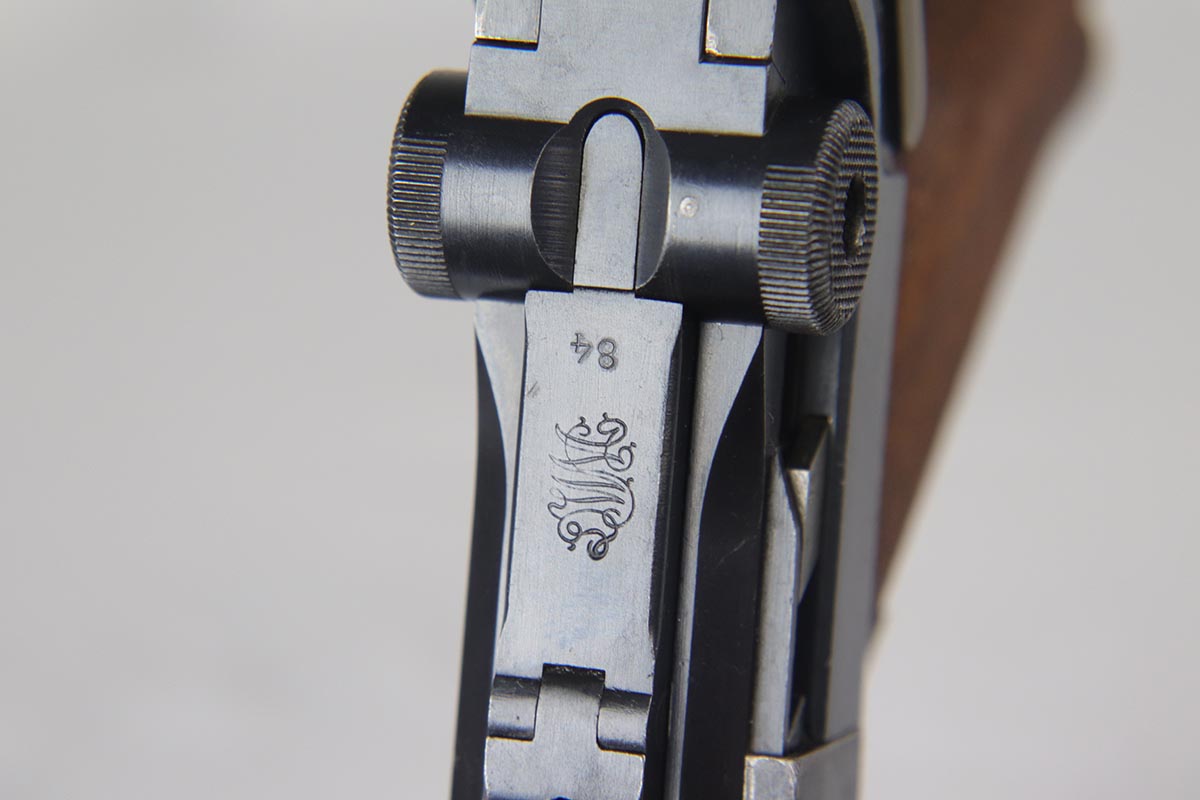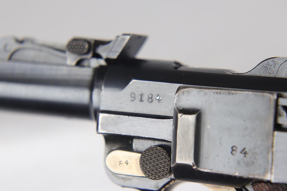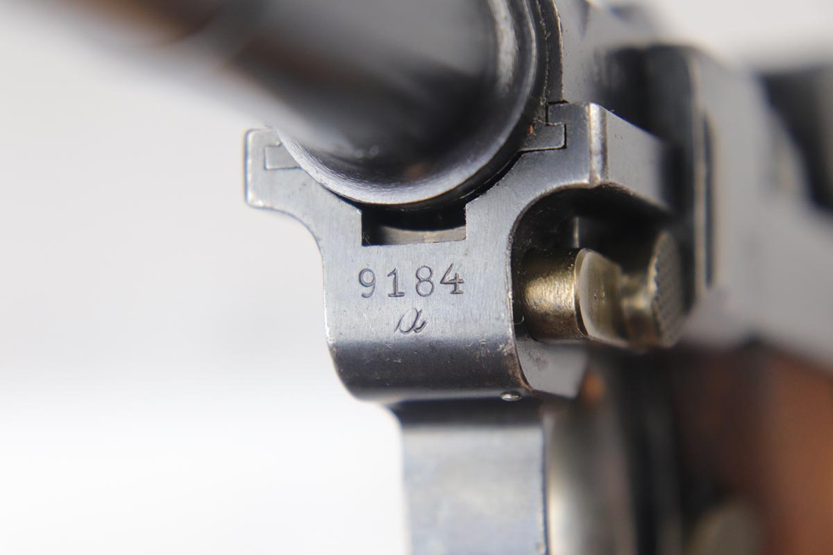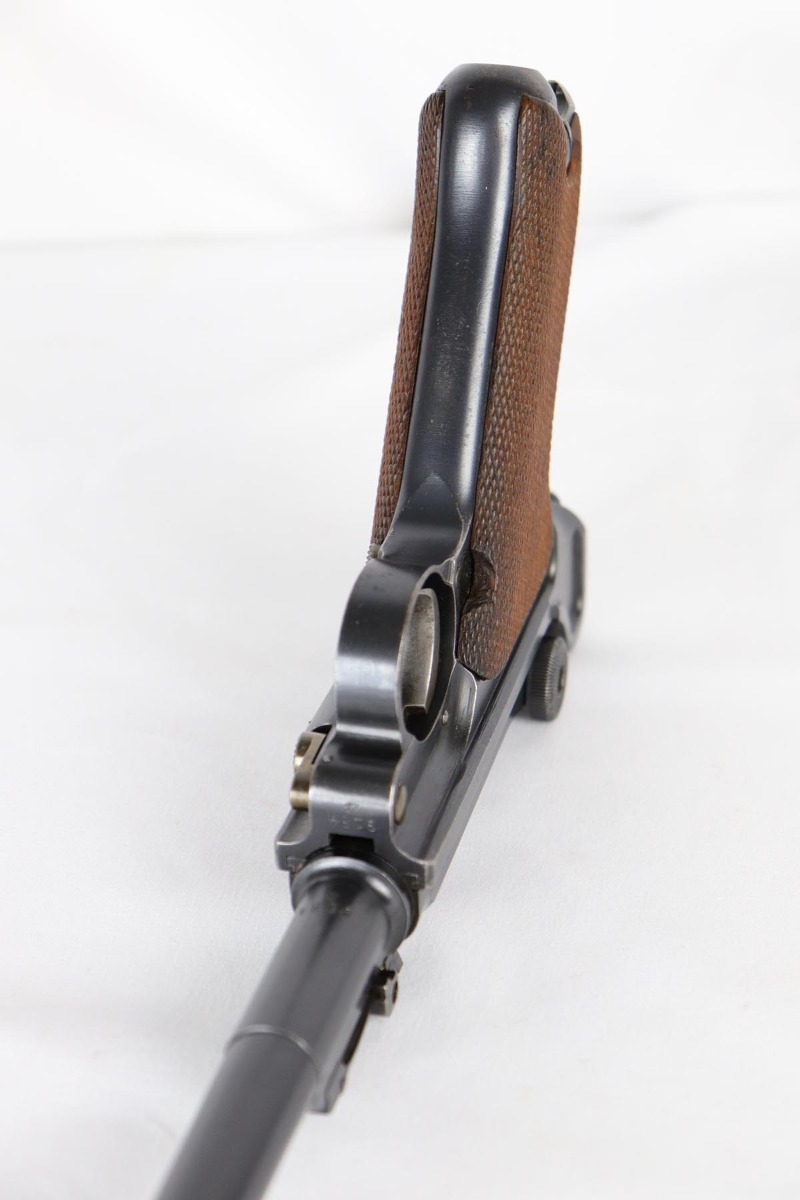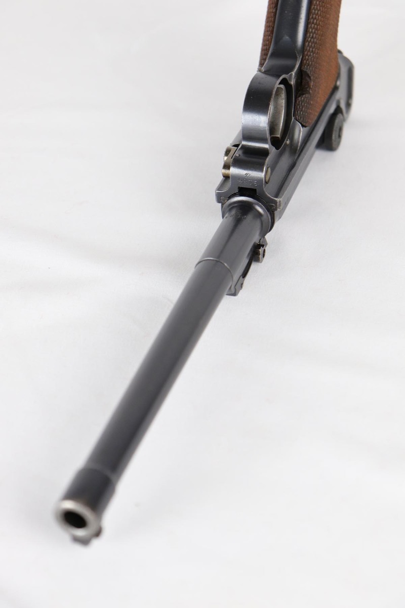 6/22/18 – This is an excellent and all matching Artillery DWM Luger, manufactured in 1917. The original bluing rates at 96-97% with only minor muzzle wear and some finish loss and patina on the sideplate. The gun is otherwise gorgeous, including very good straw on the small parts. The grips are excellent and matching to the gun. The magazine is also numbered to the pistol but the numbering does not appear factory original. Terrifc bore.