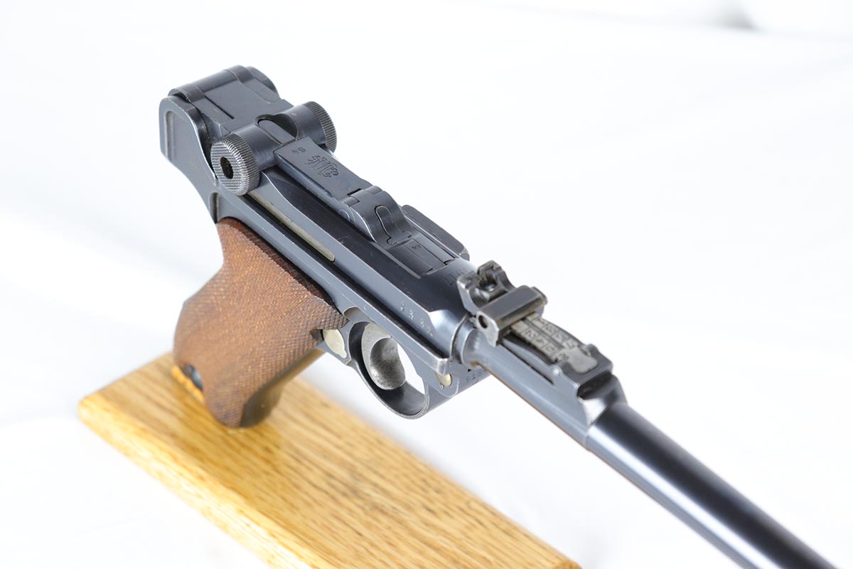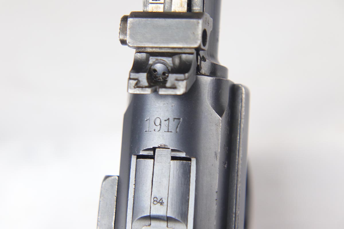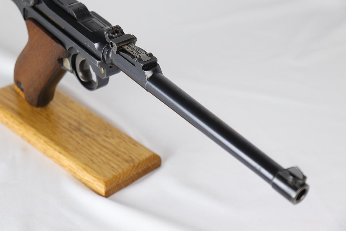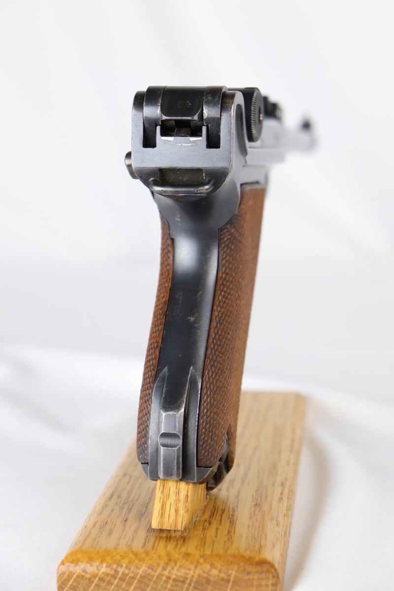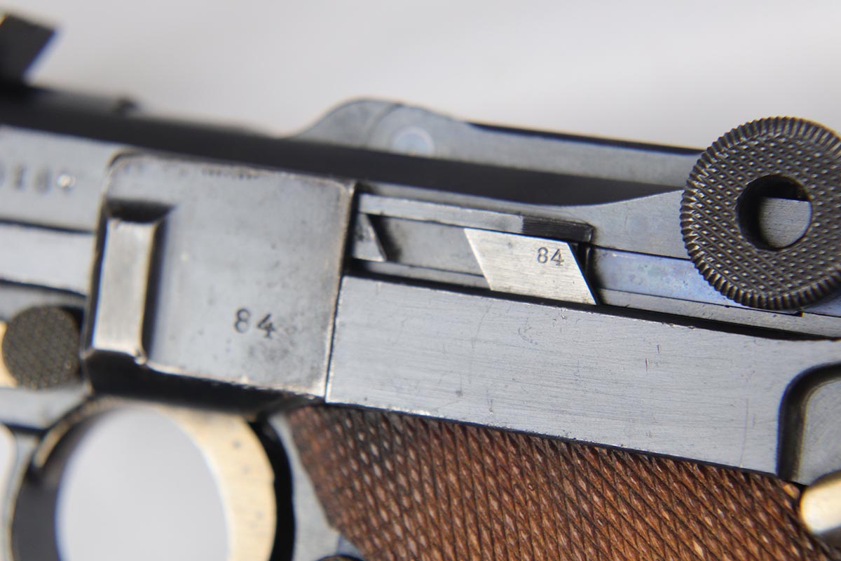 6/22/18 – This is an excellent and all matching Artillery DWM Luger, manufactured in 1917. The original bluing rates at 96-97% with only minor muzzle wear and some finish loss and patina on the sideplate. The gun is otherwise gorgeous, including very good straw on the small parts. The grips are excellent and matching to the gun. The magazine is also numbered to the pistol but the numbering does not appear factory original. Terrifc bore.