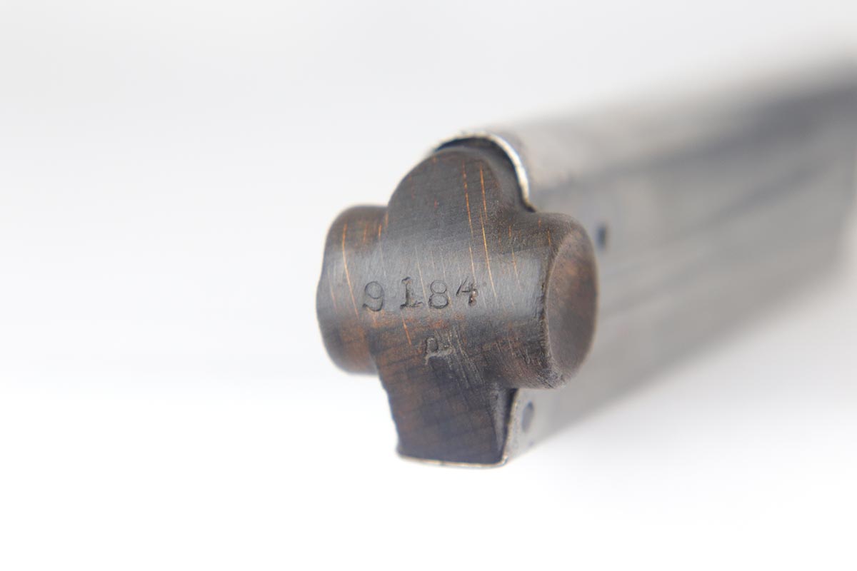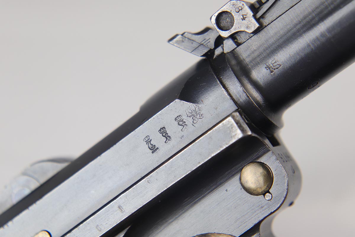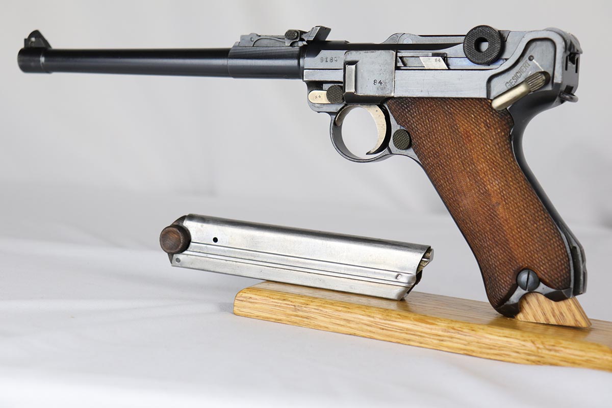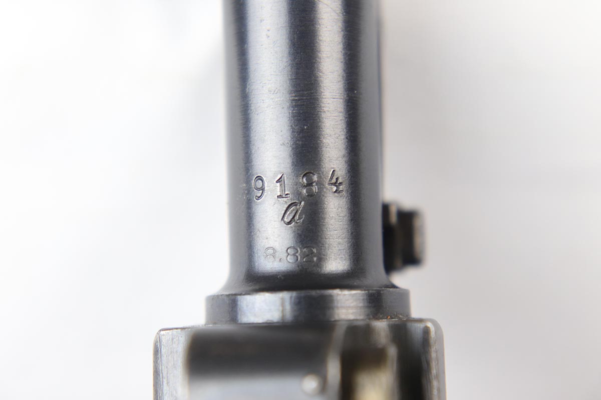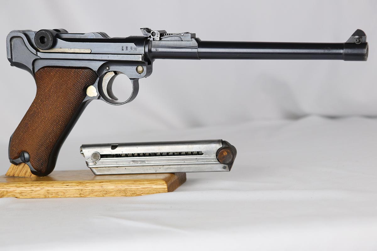 6/22/18 – This is an excellent and all matching Artillery DWM Luger, manufactured in 1917. The original bluing rates at 96-97% with only minor muzzle wear and some finish loss and patina on the sideplate. The gun is otherwise gorgeous, including very good straw on the small parts. The grips are excellent and matching to the gun. The magazine is also numbered to the pistol but the numbering does not appear factory original. Terrifc bore.